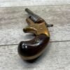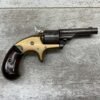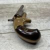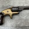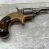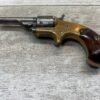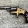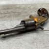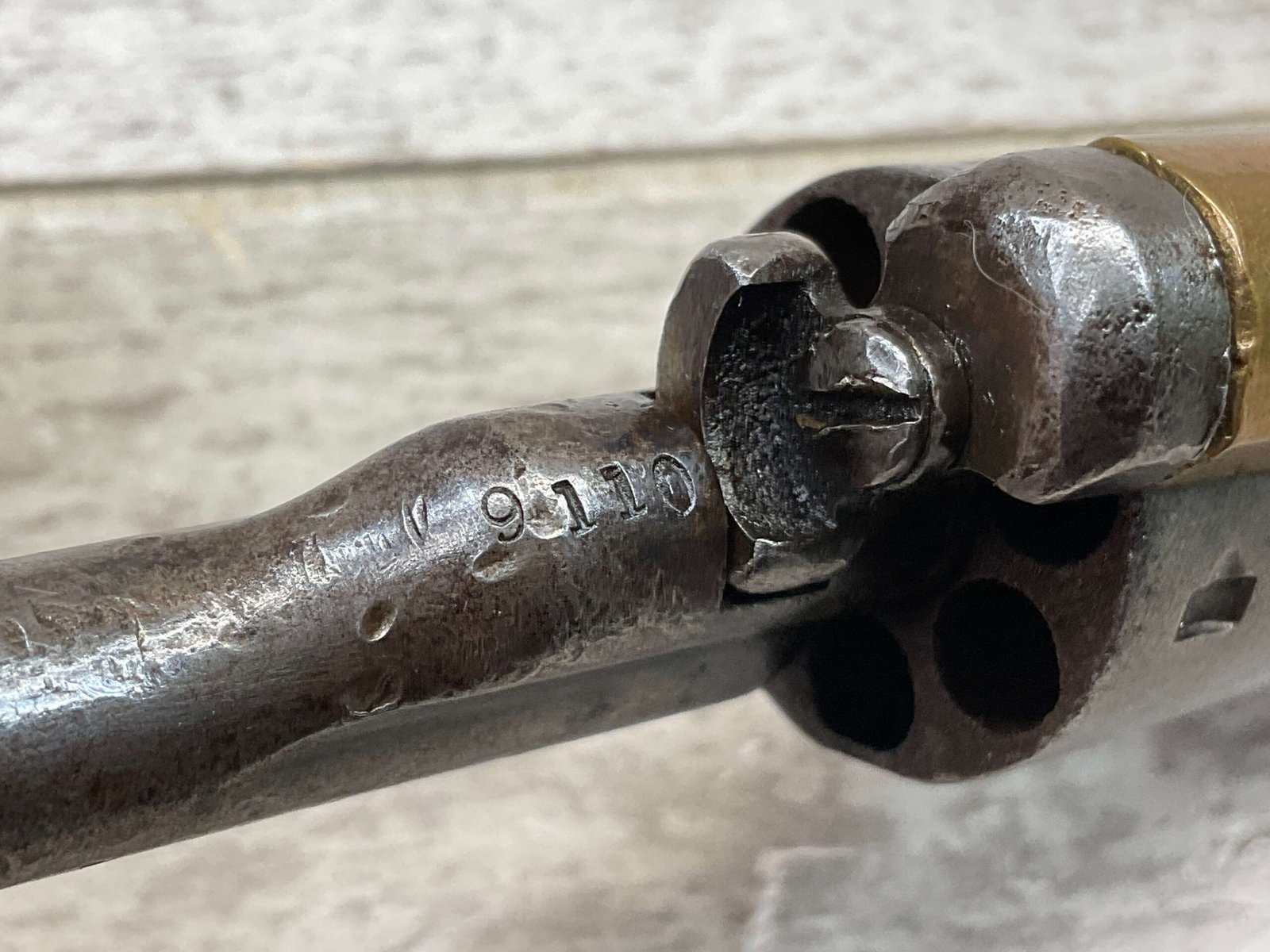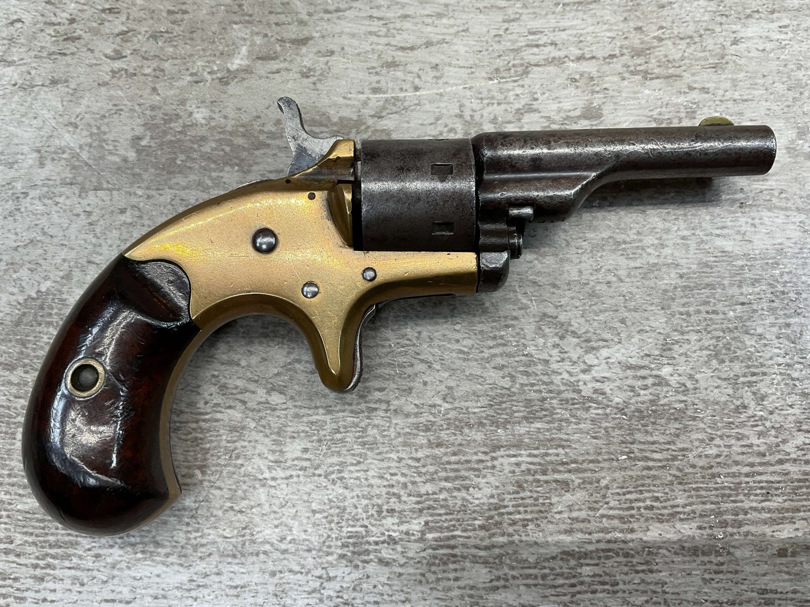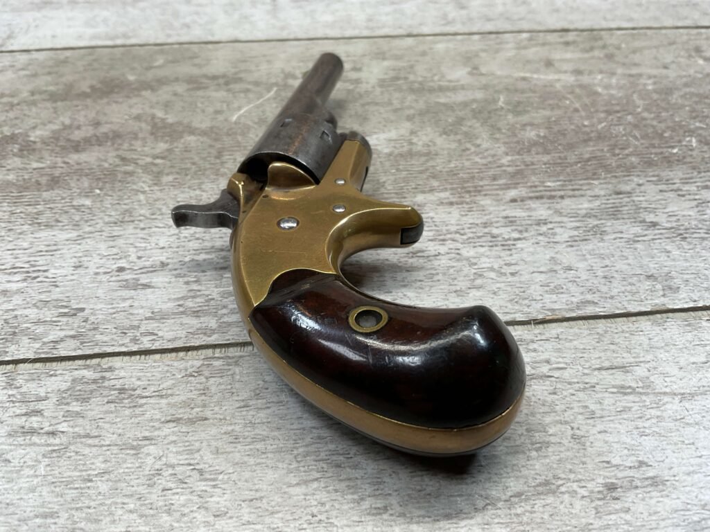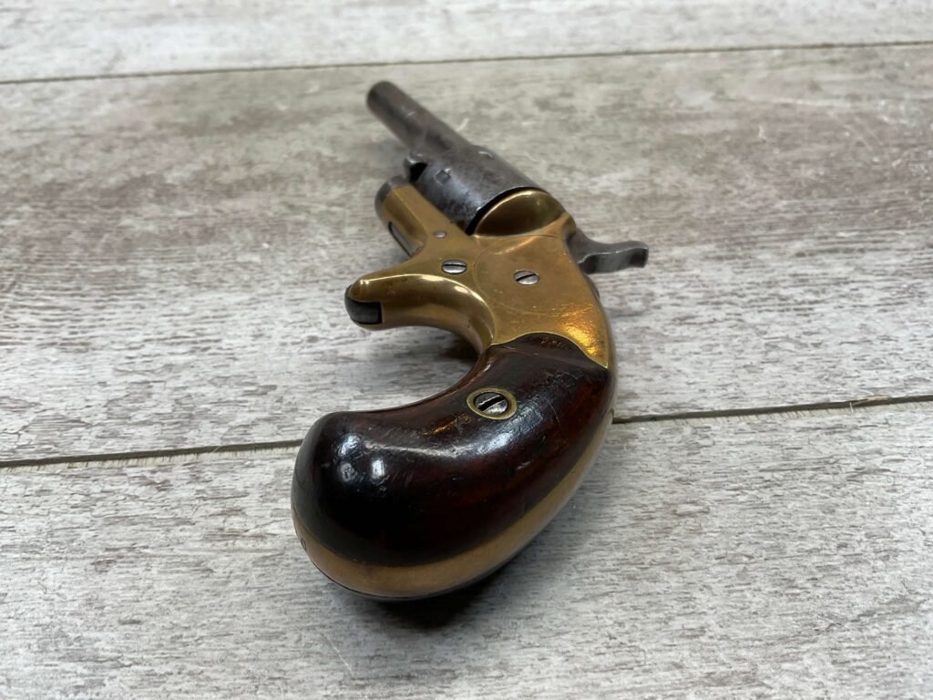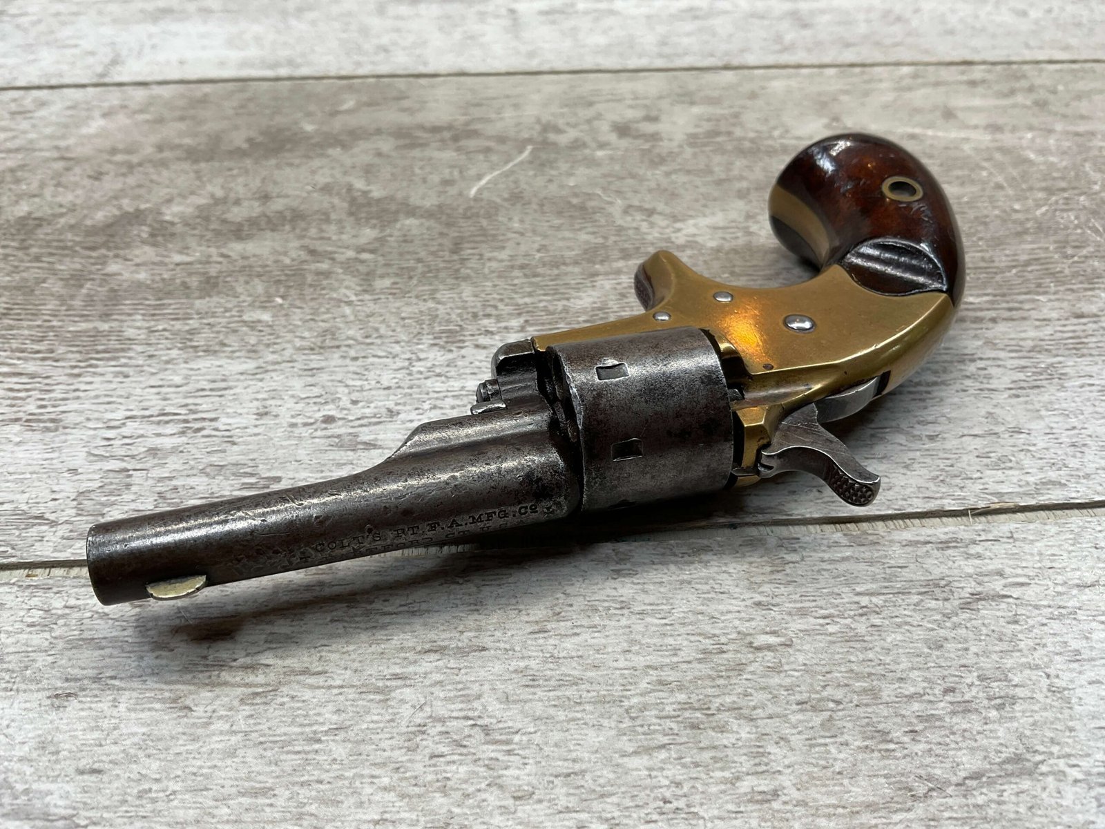 COLT OPEN TOP POCKET MODEL .22 CAL REVOLVER, ANTIQUE #9110, NON WORKING (BARREL DOESN’T ROTATE TO NEXT CHAMBER, ALL PARTS APPEAR TO BE INTACT AS I CAN GET IT TO ROTATE WHEN I PULL THE HAMMER BACK W/ THE COVER OFF), VERY NICE BRASS FRAME, EXC MATCHING SMOOTH WALNUT GRIPS, BLUE HAS TURNED GREY PATINA W/ LIGHT PITTING IN AREAS, DARKER FROSTED BORE W/ VERY STRONG RIFLING, NOT A REPRODUCTION, OVERALL CONDITION AS SEEN IN PHOTOS