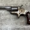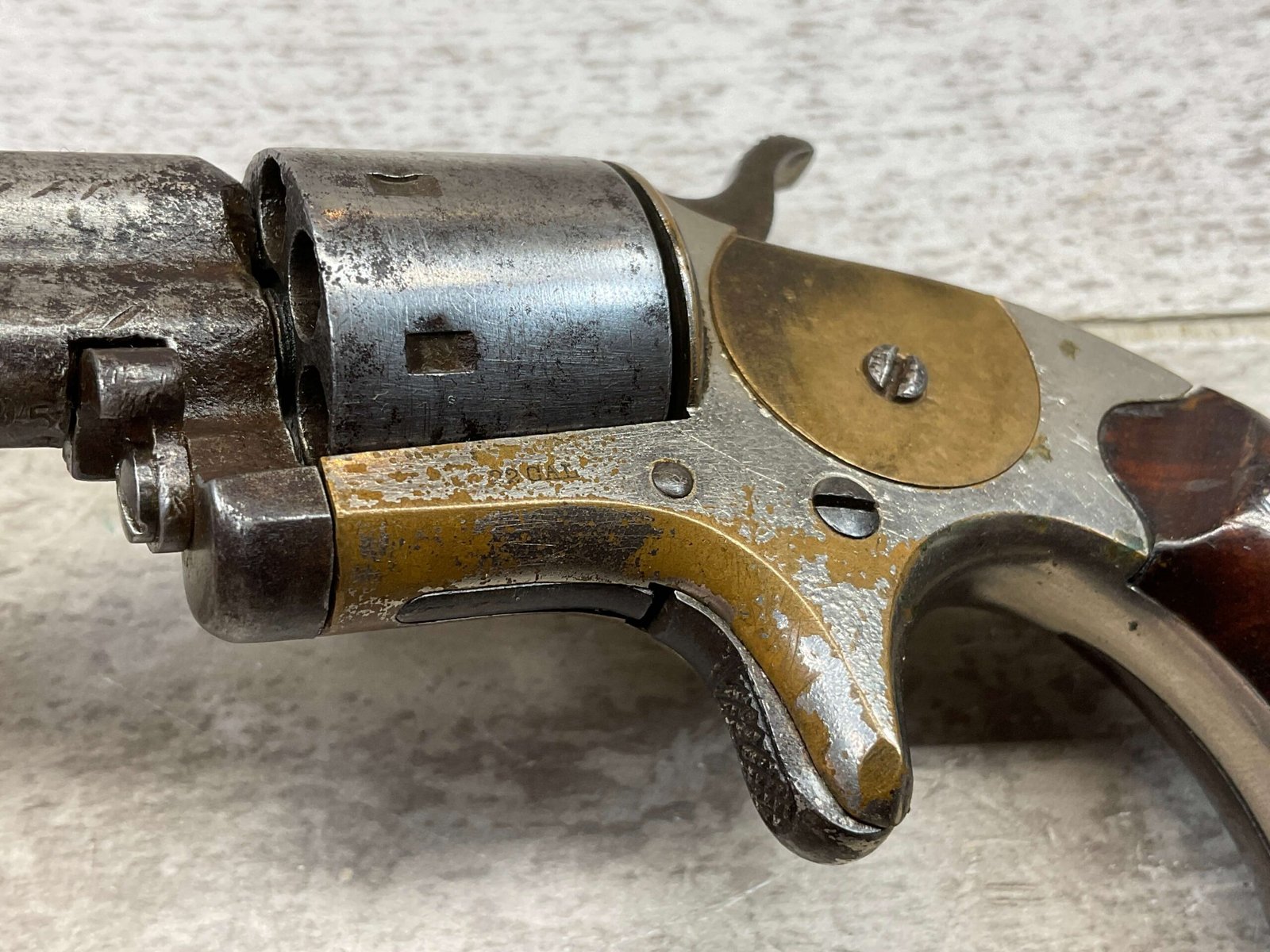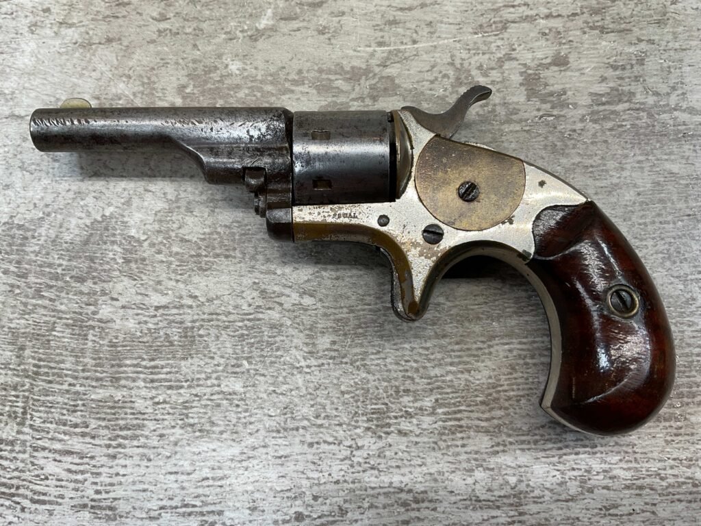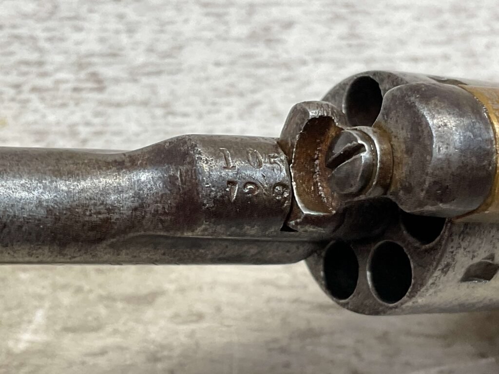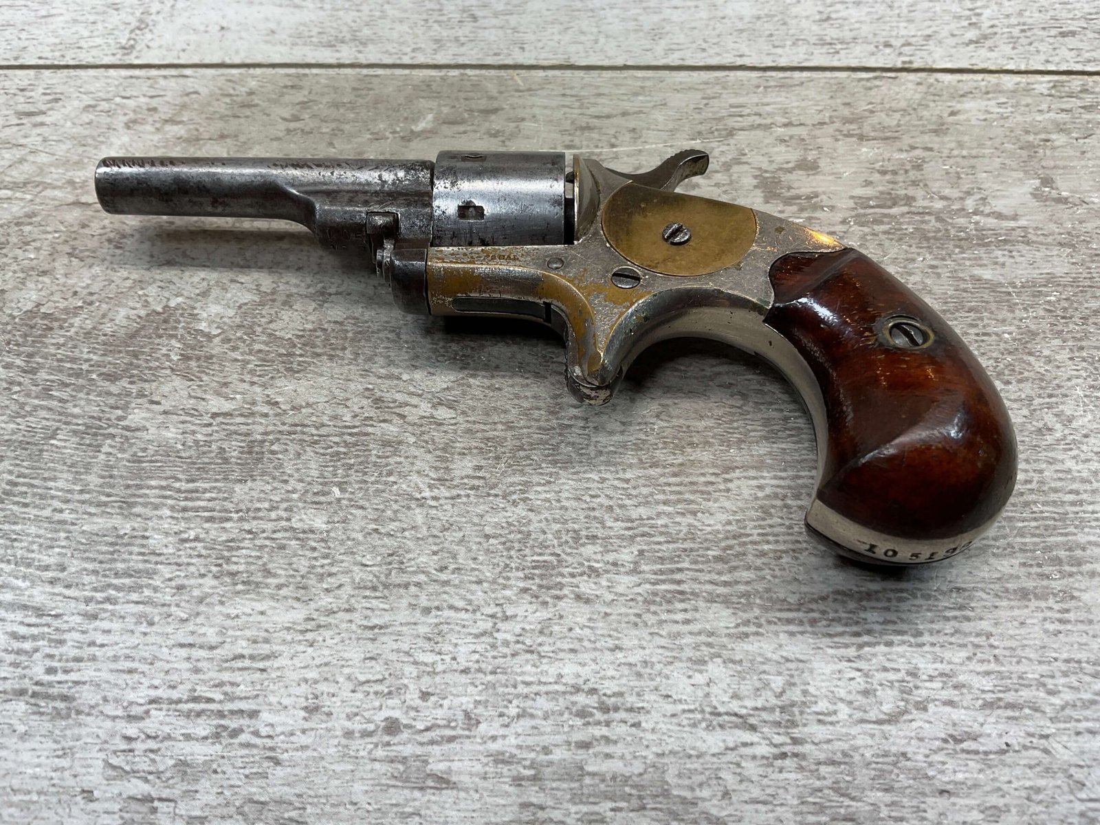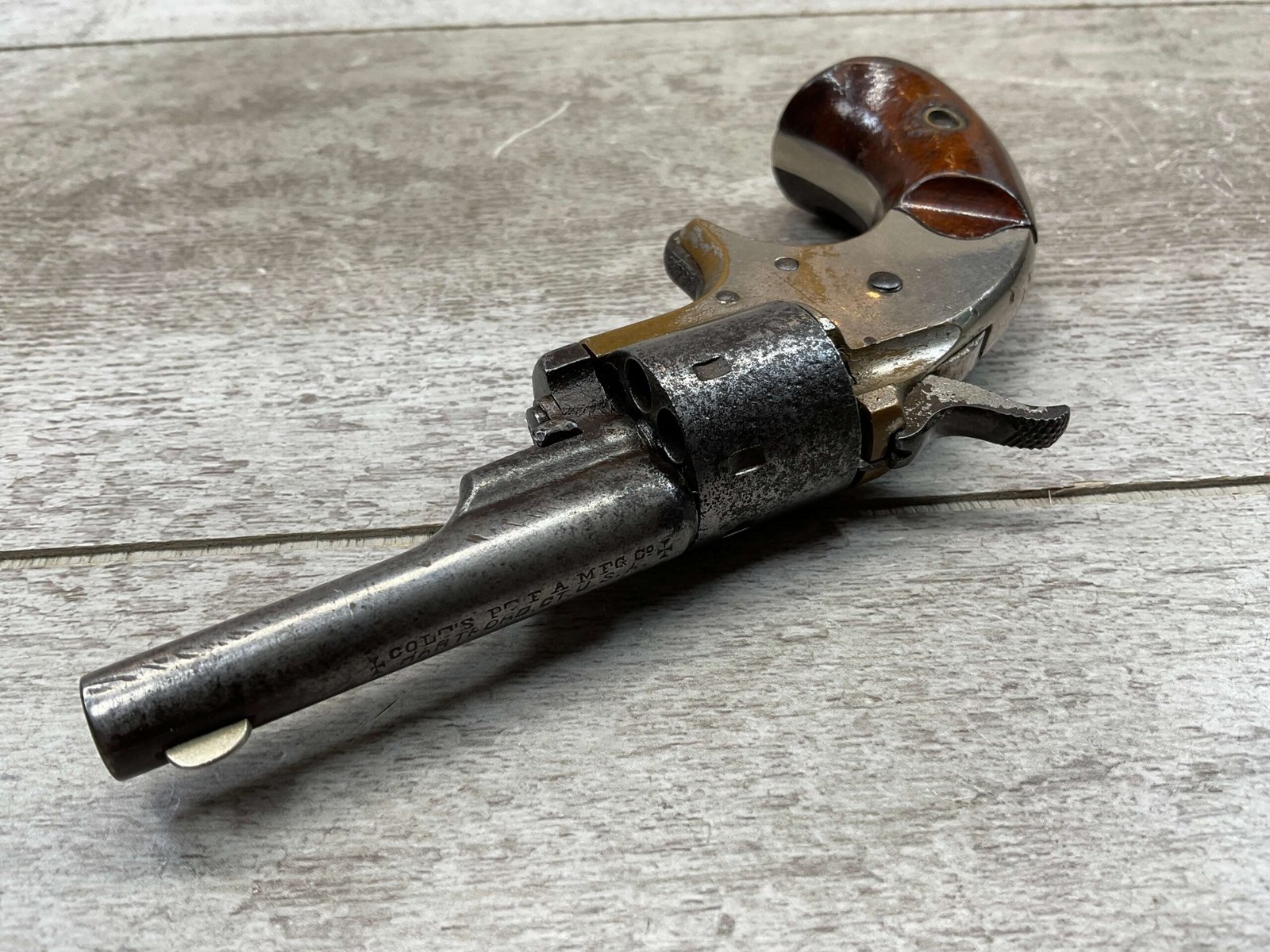 COLT OPEN TOP POCKET MODEL .22 CAL REVOLVER, ANTIQUE #105138, BRASS FRAME W/ NICKEL FINISH FLAKING OFF, EXC UNMARKED SMOOTH WALNUT GRIPS, BLUE HAS TURNED GREY PATINA W/ LIGHT PITTING IN AREAS ON BARREL & CYLINDER, DARKER FROSTED BORE W/ VERY STRONG RIFLING, NOT A REPRODUCTION, OVERALL CONDITION AS SEEN IN PHOTOS