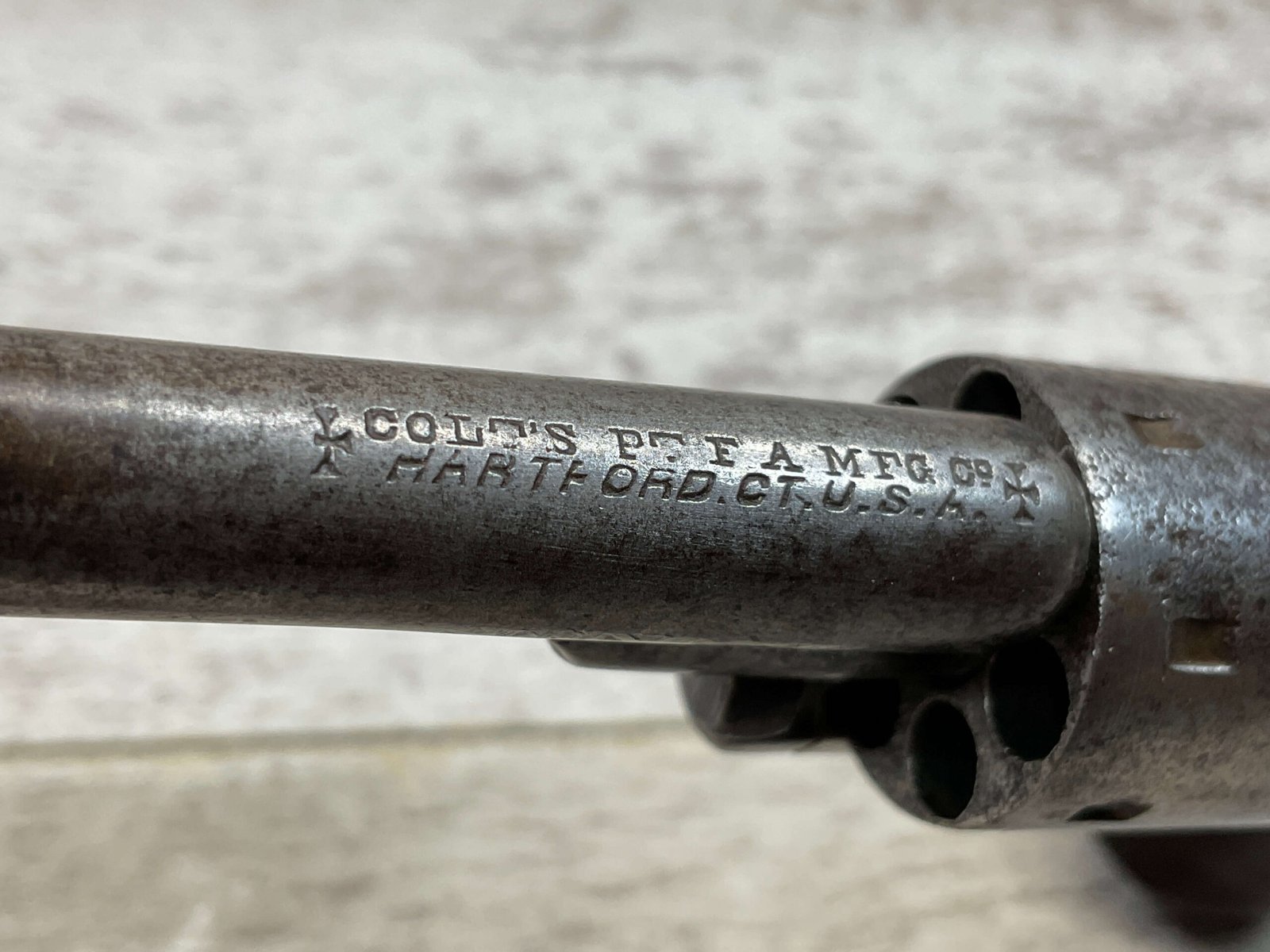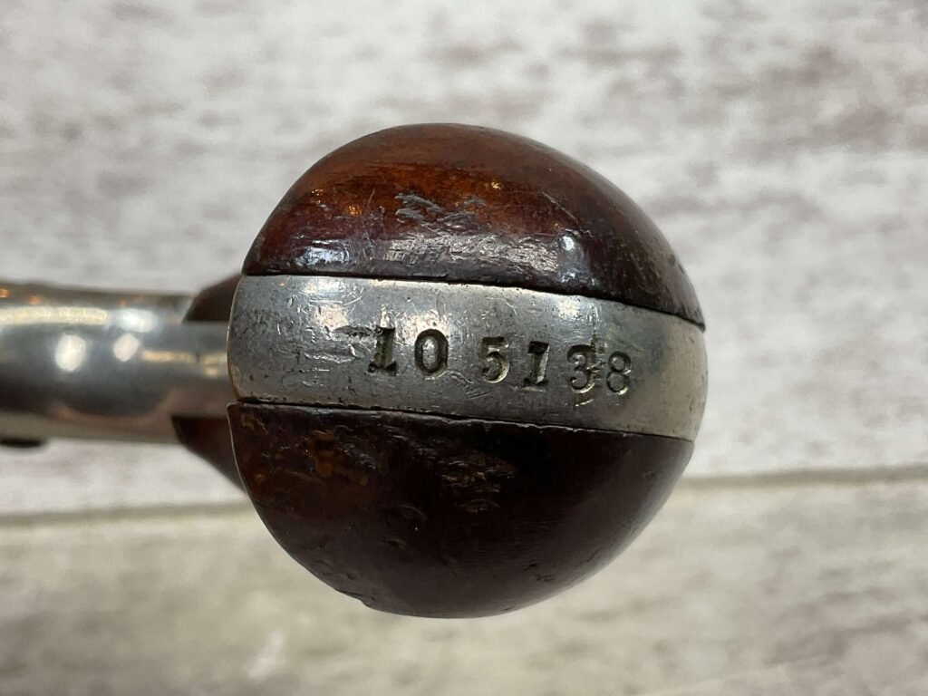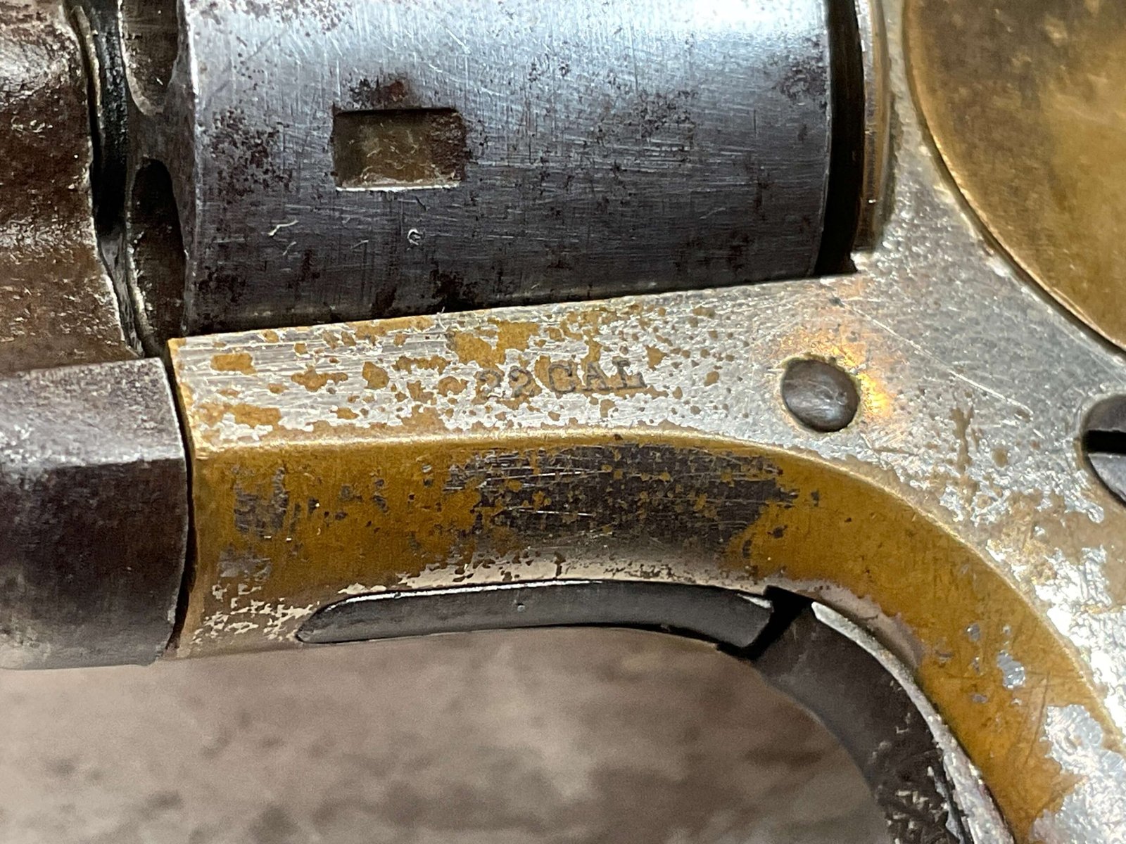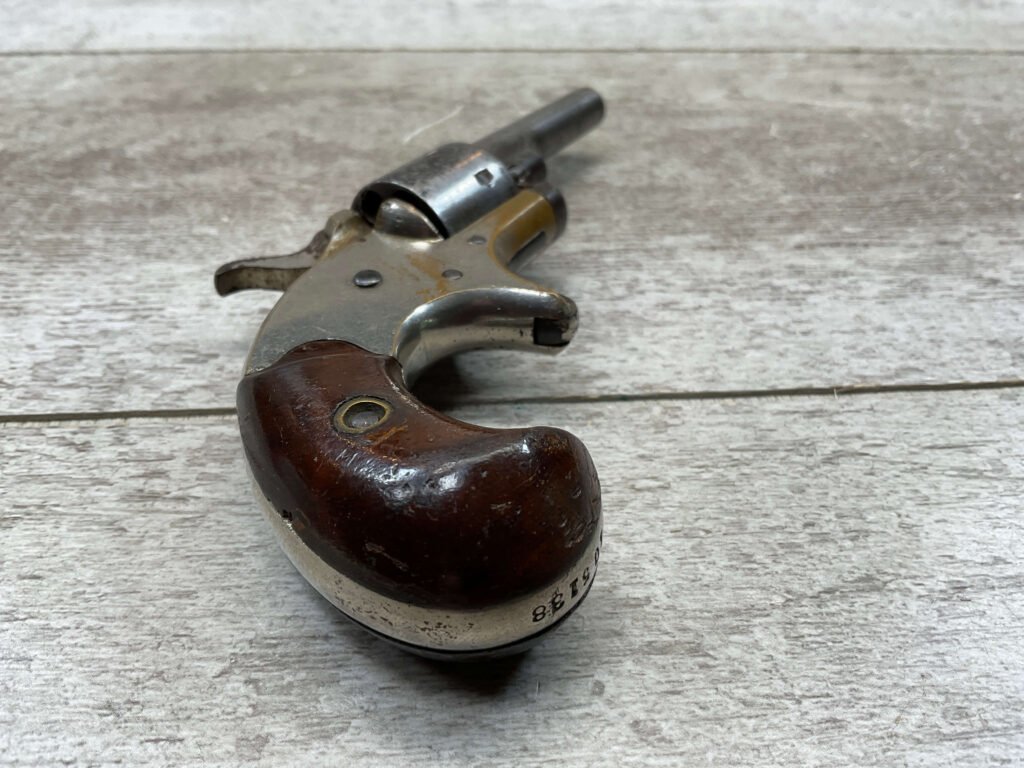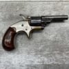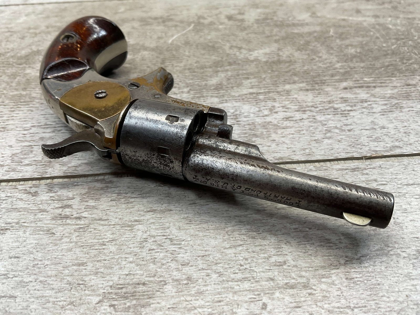 COLT OPEN TOP POCKET MODEL .22 CAL REVOLVER, ANTIQUE #105138, BRASS FRAME W/ NICKEL FINISH FLAKING OFF, EXC UNMARKED SMOOTH WALNUT GRIPS, BLUE HAS TURNED GREY PATINA W/ LIGHT PITTING IN AREAS ON BARREL & CYLINDER, DARKER FROSTED BORE W/ VERY STRONG RIFLING, NOT A REPRODUCTION, OVERALL CONDITION AS SEEN IN PHOTOS