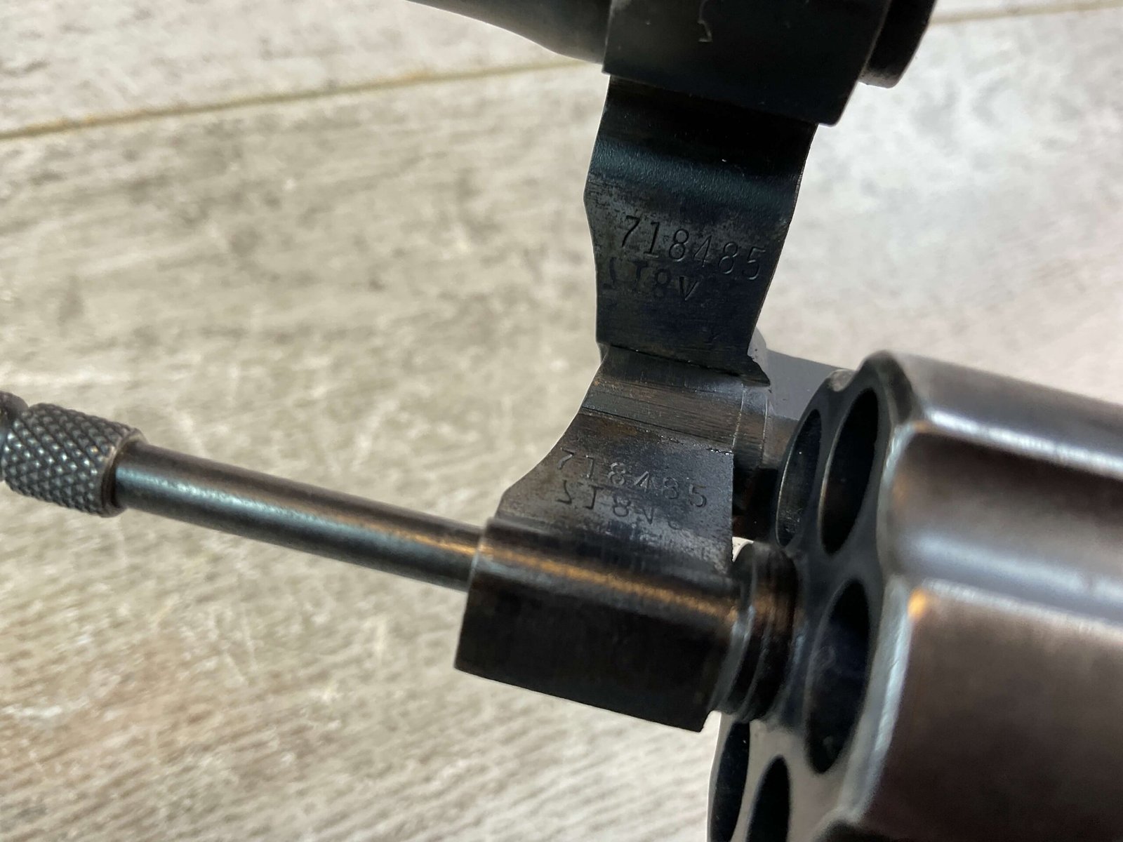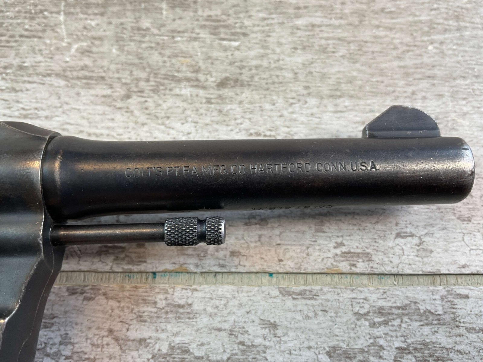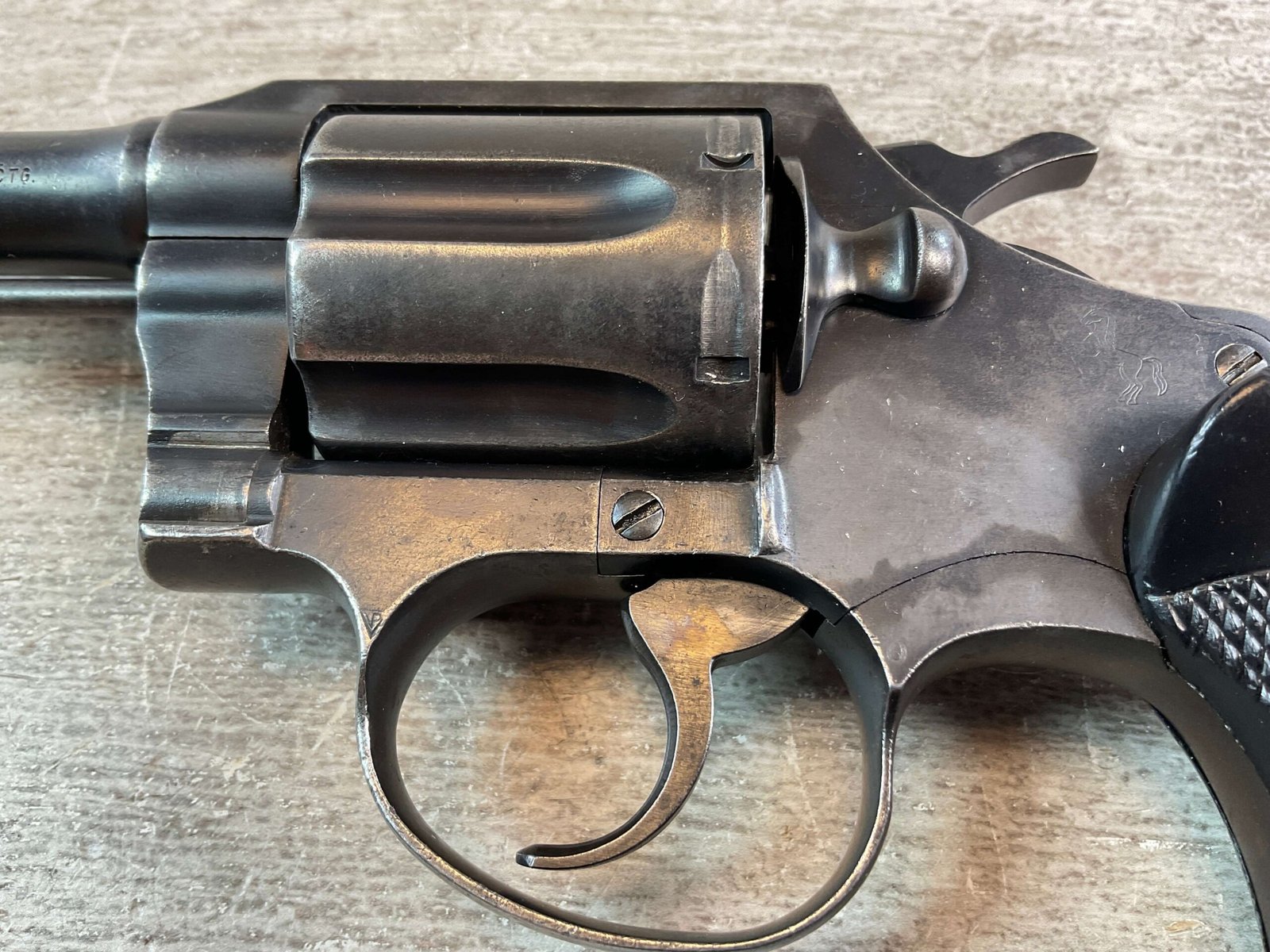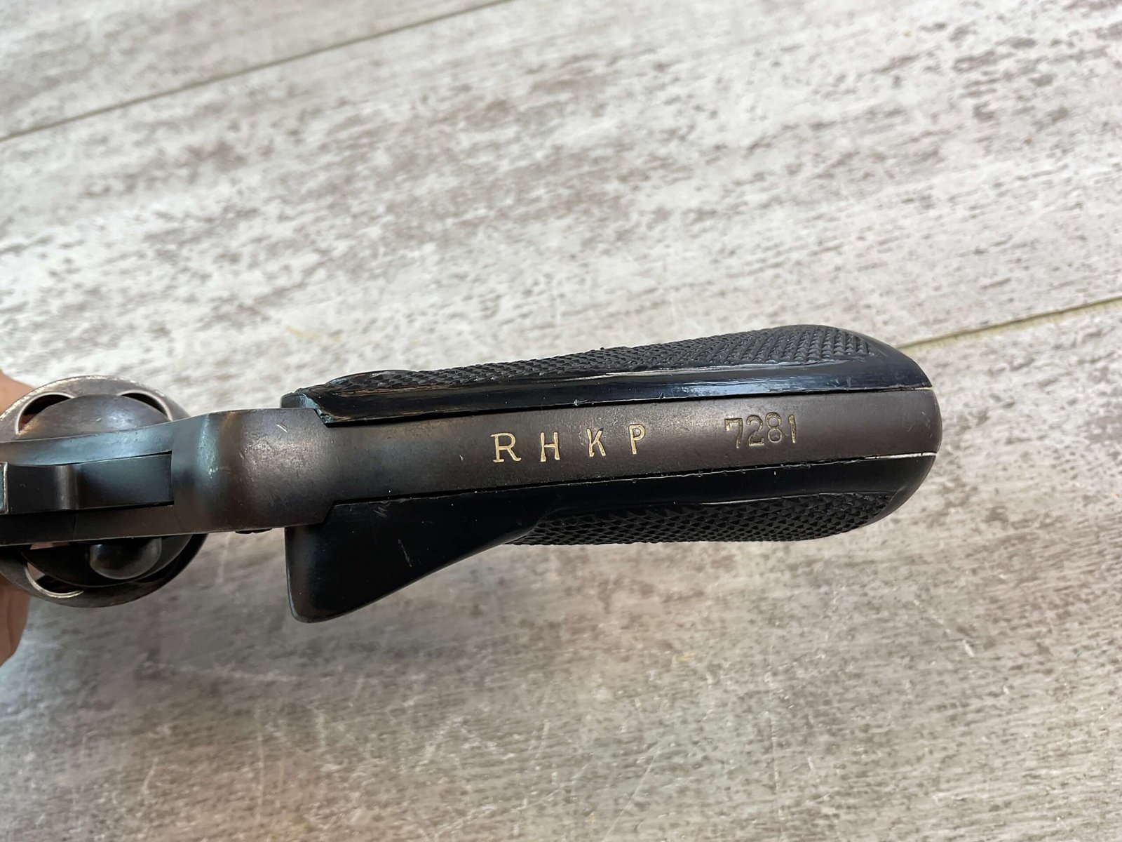 COLT POLICE POSITIVE SPECIAL 38 COLT/38 S&W REVOLVER #718485, 1958 MFR, DOUBLE ACTION, 4″ BLUED BBL, PLASTIC CHECKERED GRIPS W/ THUMB TANG, FIXED GROOVE REAR SIGHT, FRONT BLADE SIGHT, SERRATED HAMMER AND GROOVED TRIGGER, TIGHT INDEX & LOCKUP, BLUEING SHOWS USE WEAR W/ GREY PATINA, VG BRIGHT BORE EXC. RIFLING, LANYARD LOOP, BACKSTRAP STAMPED “RHKP 7281” INDICATING ROYAL HONG KONG POLICE, LIGHT IMPORT MARK ON THE UNDERSIDE OF BBL, CONDITION AS SHOWN IN PICTURES