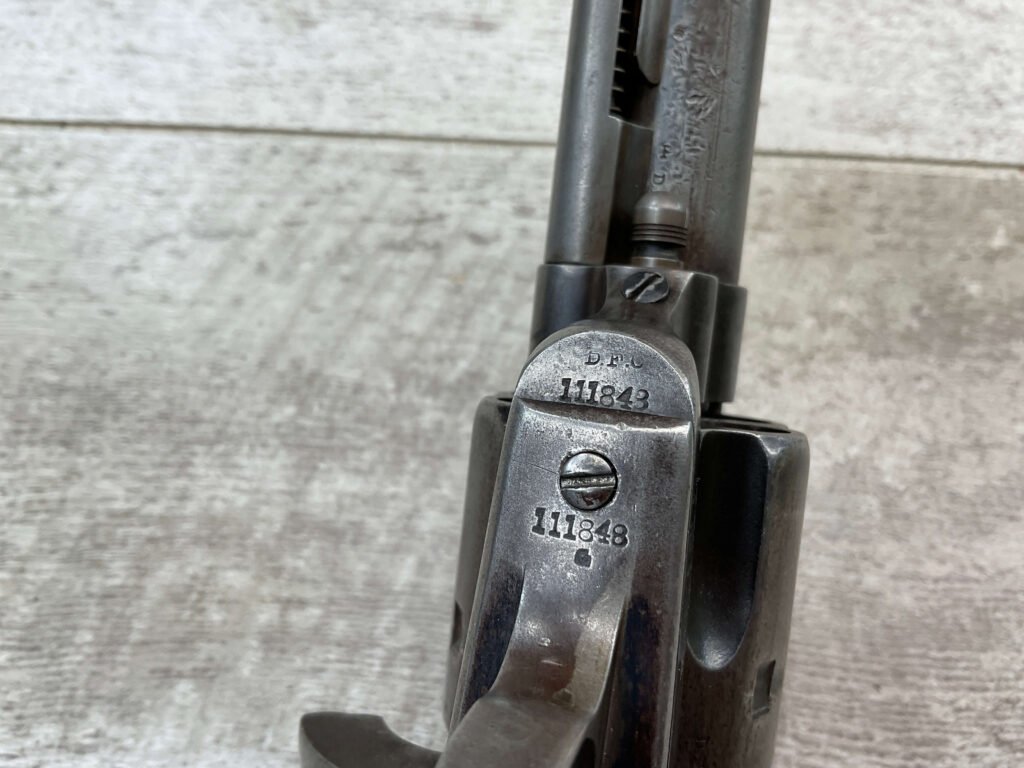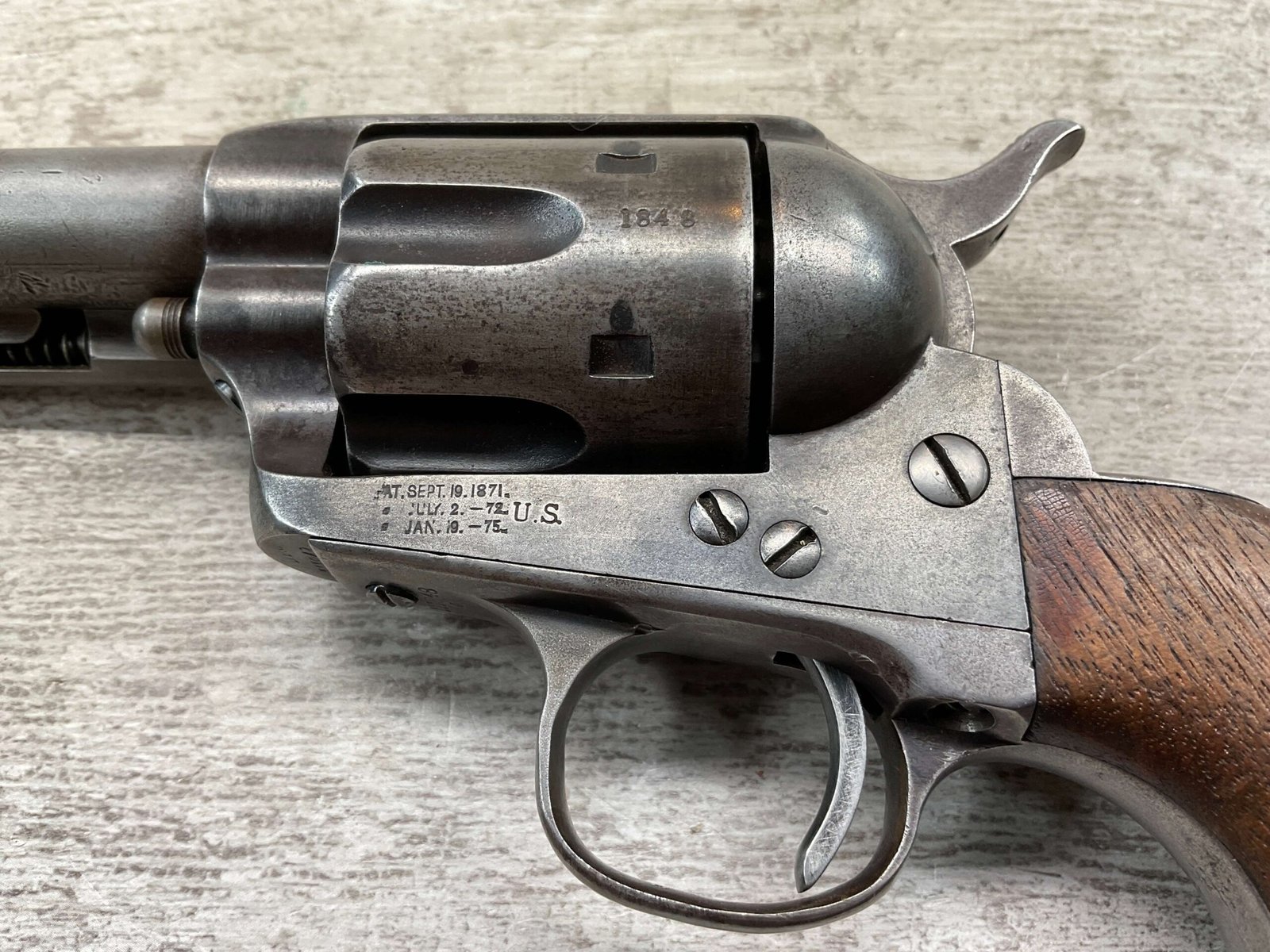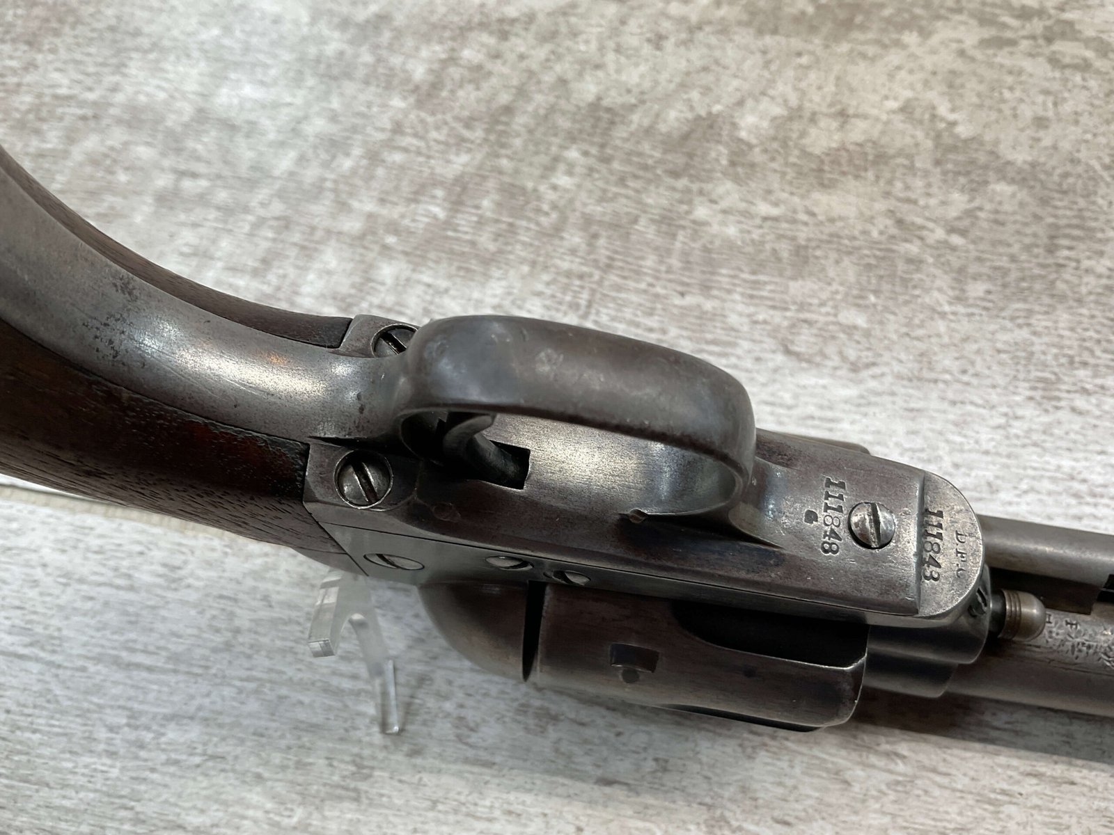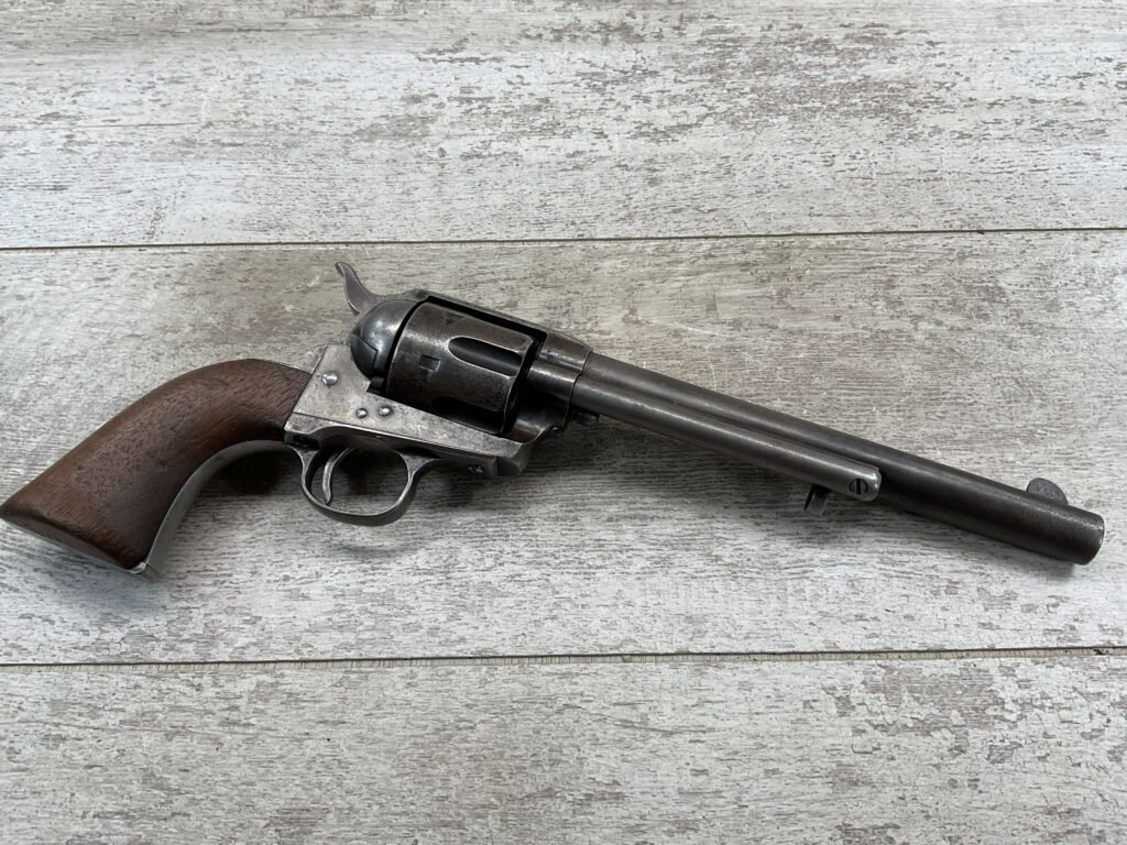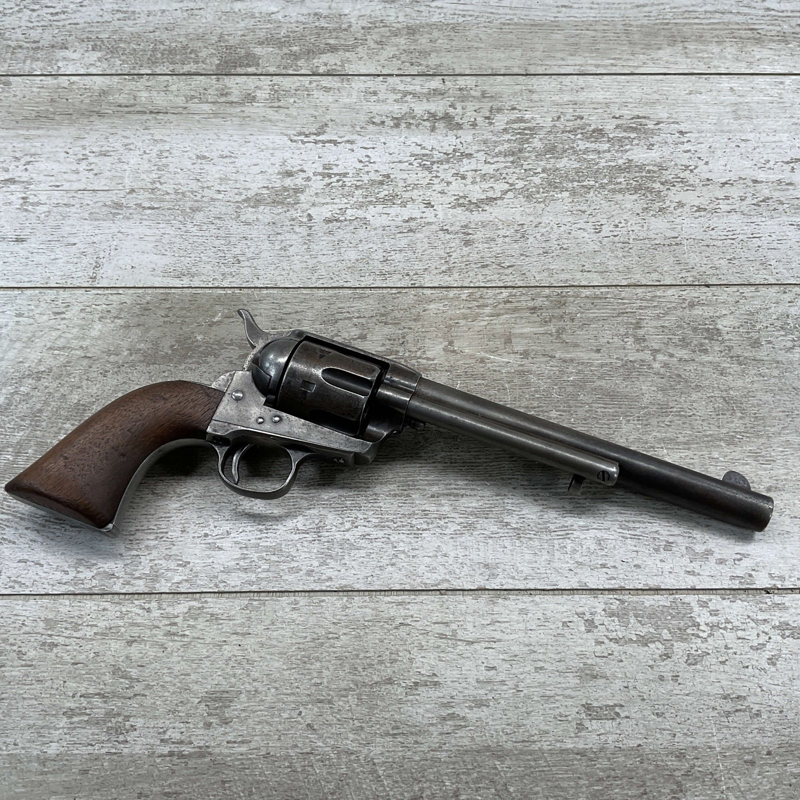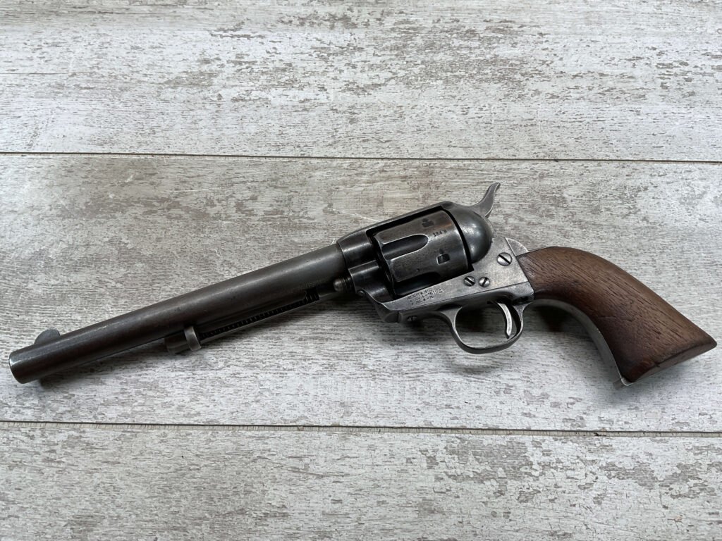 COLT SA ARMY MODEL 1873 PEACEMAKER .45 CAVALRY REVOLVER #111848, 1884 MFR, ALL MATCHING & DFC MARKED (DAVID F. CLARK), GOVERNMENT BLUE & CASE HARDENED FINISH HAS TURNED GREY PATINA, VG ORIGINAL ONE PIECE SMOOTH WALNUT GRIPS, 7 1/2″ BBL, .45 COLT CALIBER, “THE GUN THAT WON THE WEST”, A RARE PIECE OF AMERICAN HISTORY!!