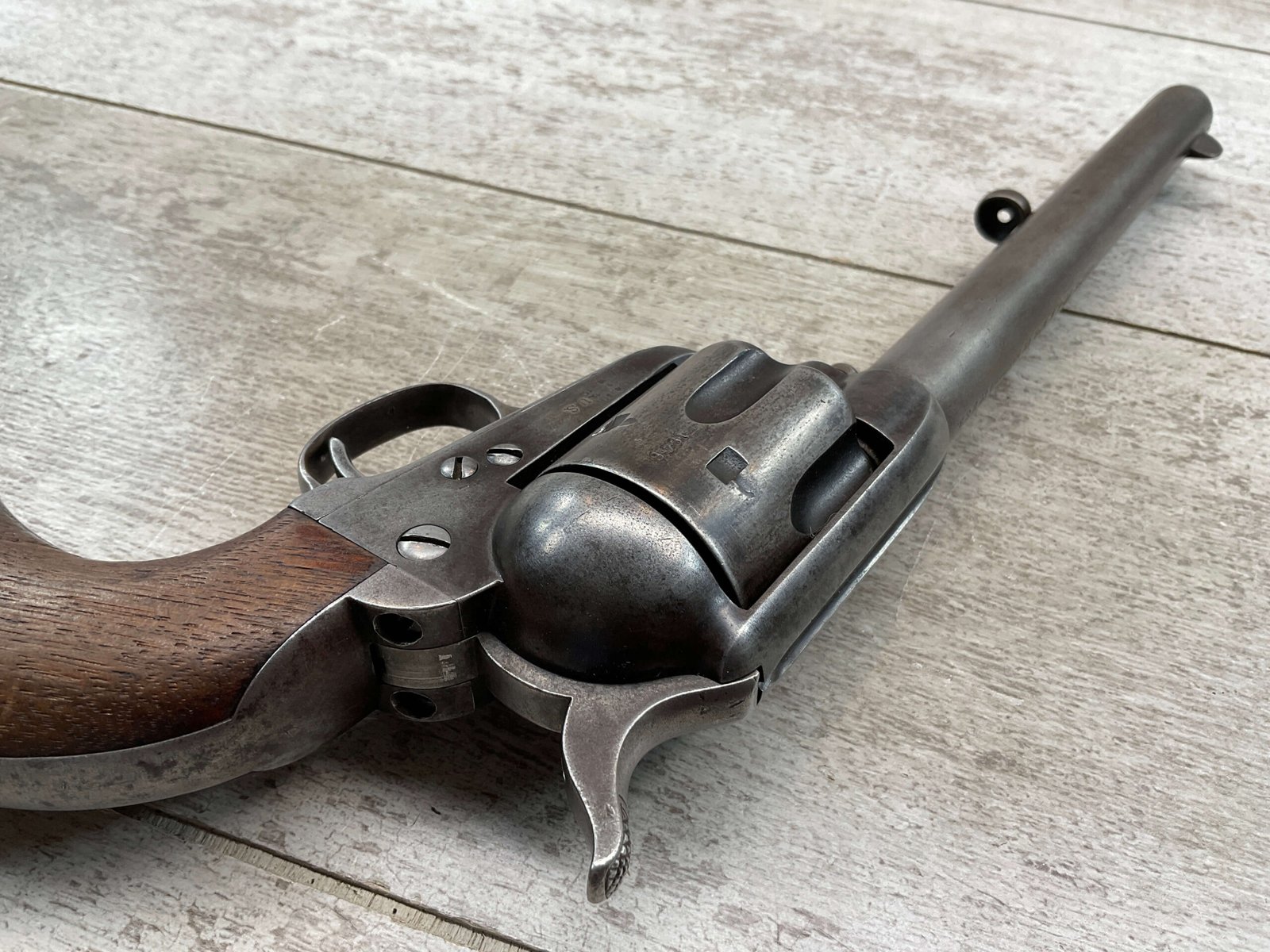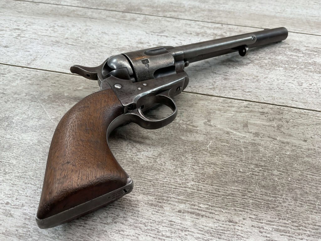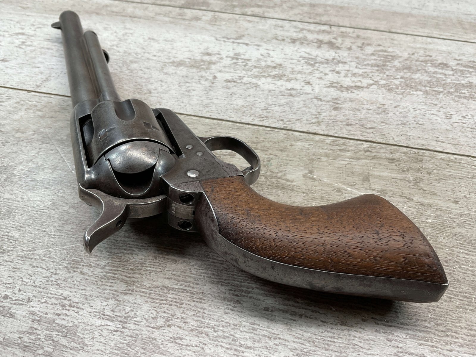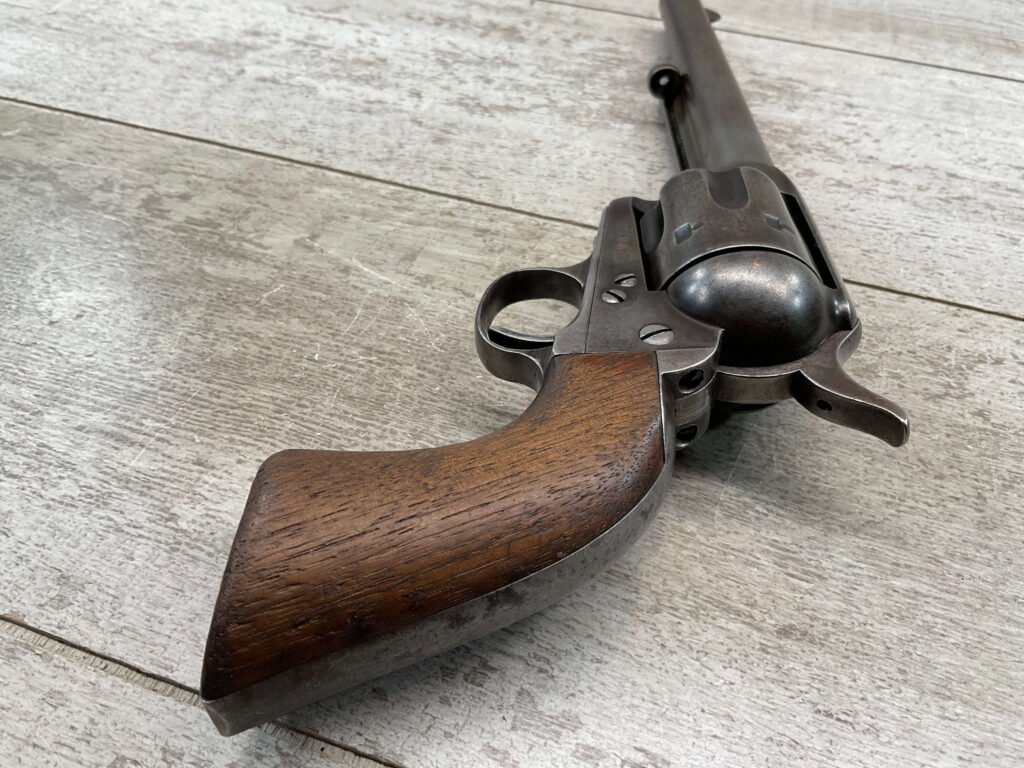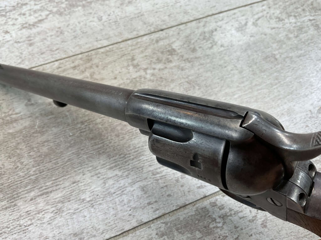 The Colt SAA was the primary sidearm of the U.S. military forces between 1873 and 1892. While frequently called the “cavalry” model, this revolver was carried by non-commissioned officers in the regular army and the state militias, and issued to each man in the mounted units. A total of 37,063 were purchased by the U.S. government at an average cost of $12.50 each. Contract specifications called for 7 ½ in. barrel, .45 Colt caliber, government blue and color case hardened finish (a softer blue color compared to the darker and more brilliant civilian finish, which required a higher polish and was therefore more expensive), and one-piece, oil finished walnut grips. Each gun was stamped with the initial(s) of a U.S. ordnance principal sub-inspector and finally, with the letters “U.S.” on the frame after being approved for delivery to the National Armory at Springfield, MA.