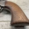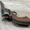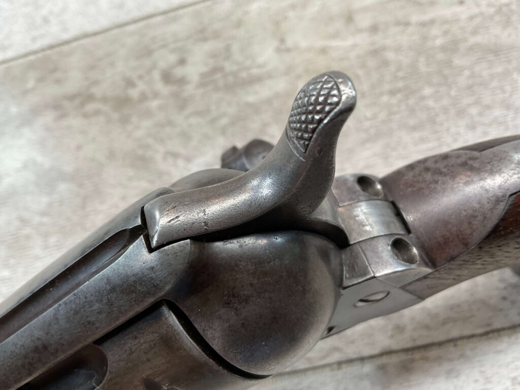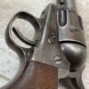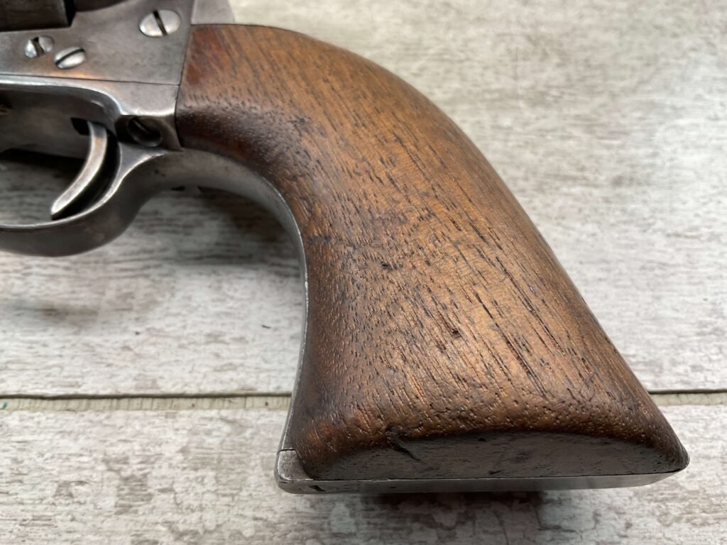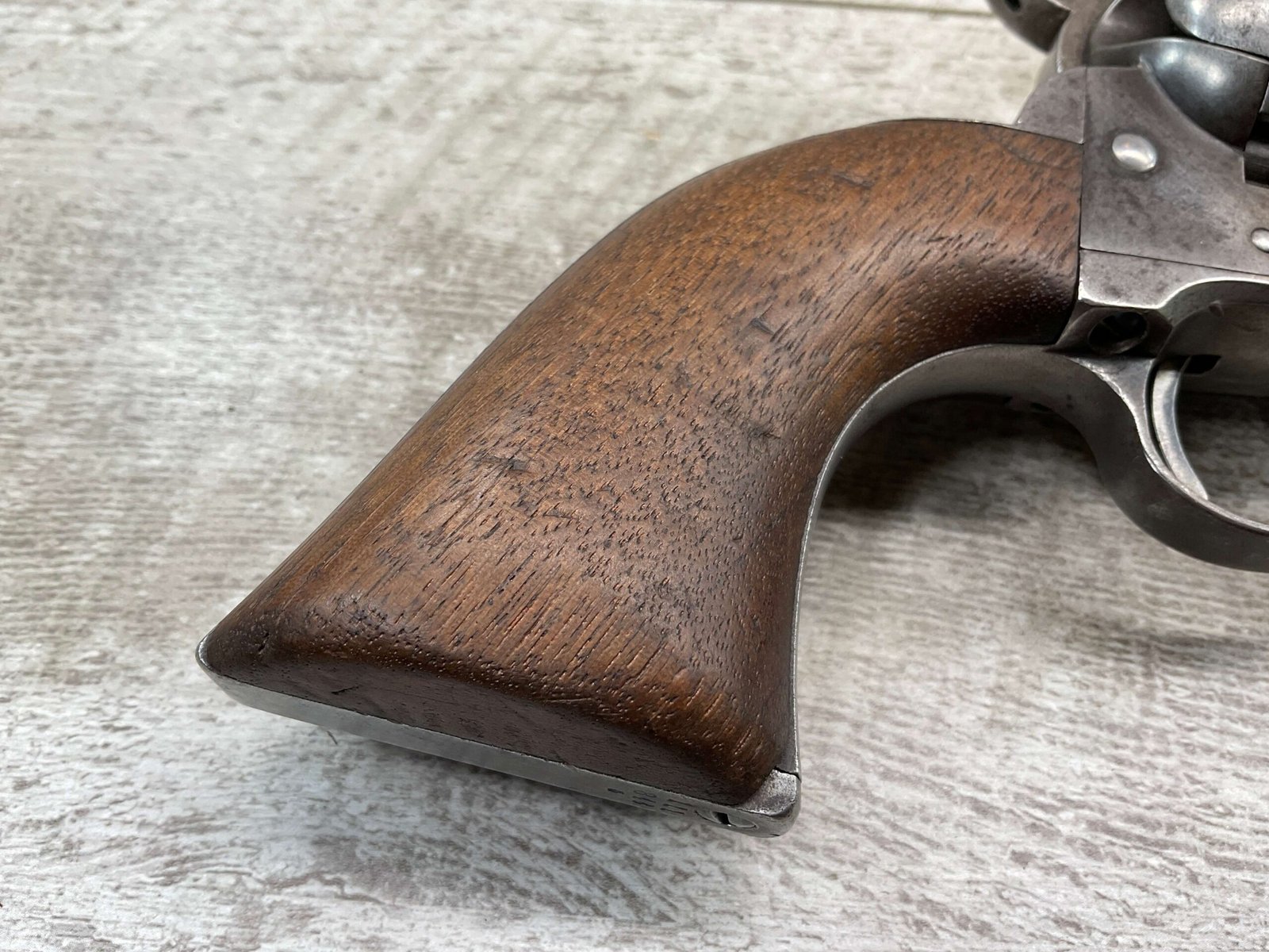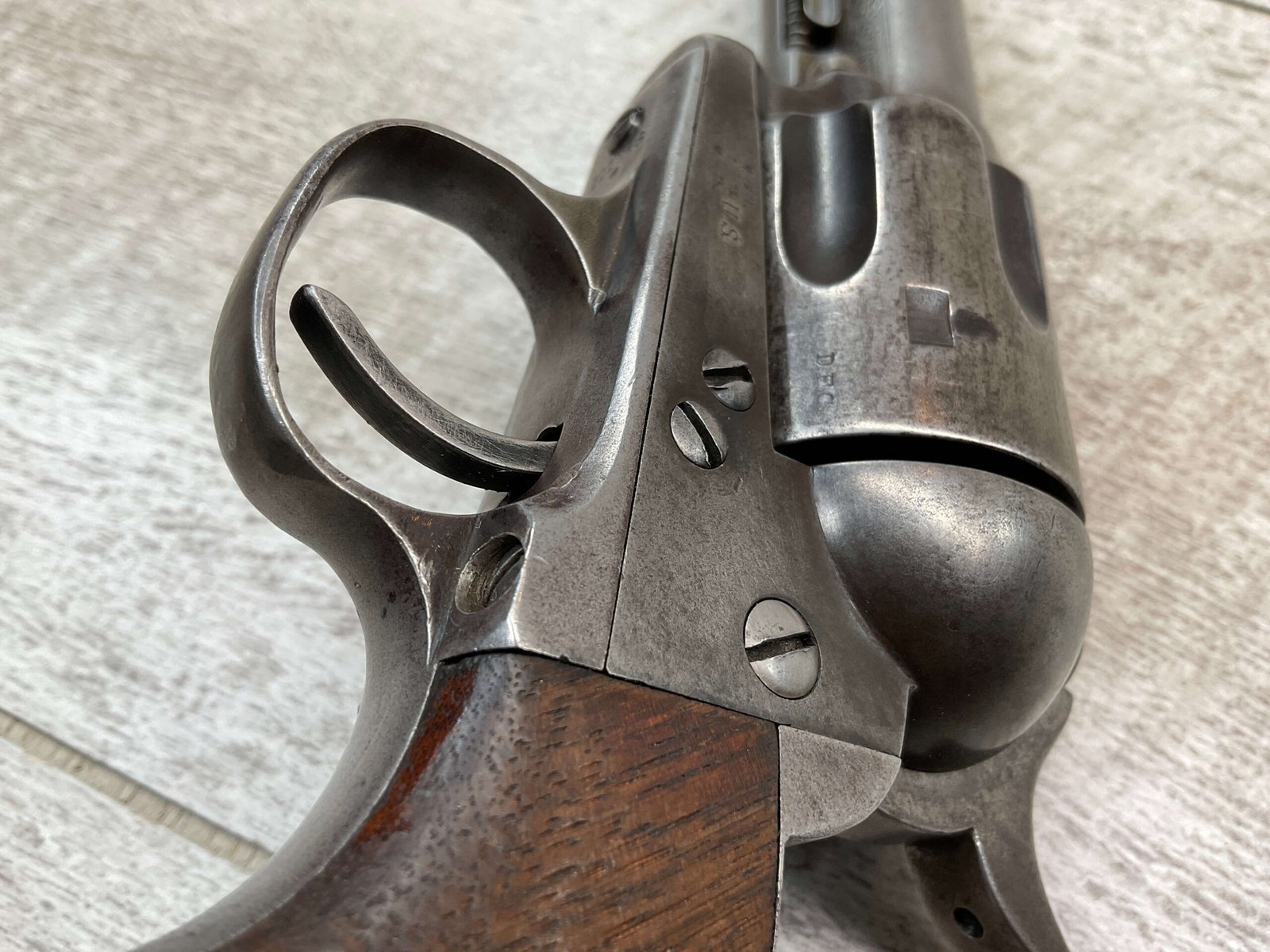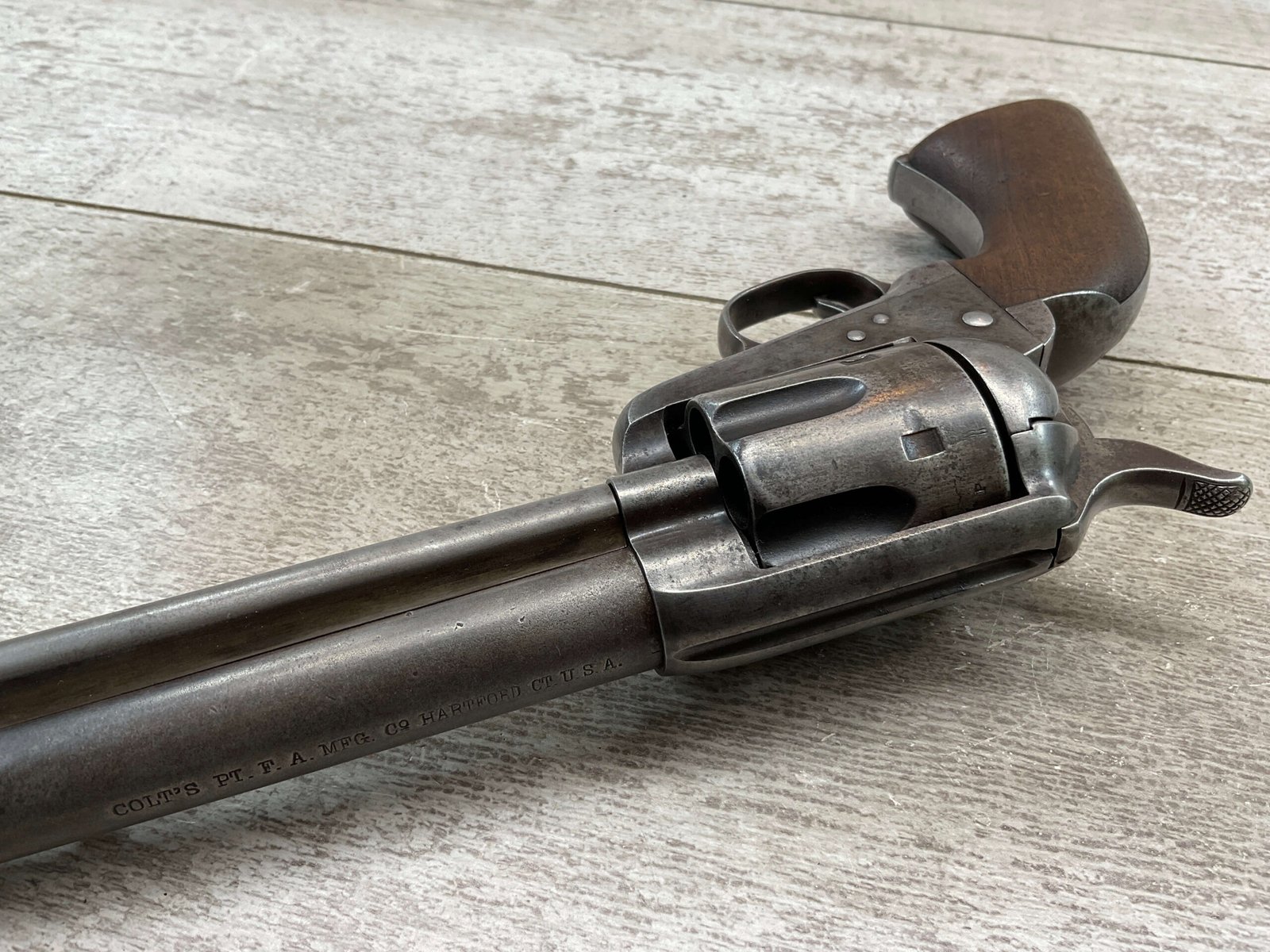 The Colt SAA was the primary sidearm of the U.S. military forces between 1873 and 1892. While frequently called the “cavalry” model, this revolver was carried by non-commissioned officers in the regular army and the state militias, and issued to each man in the mounted units. A total of 37,063 were purchased by the U.S. government at an average cost of $12.50 each. Contract specifications called for 7 ½ in. barrel, .45 Colt caliber, government blue and color case hardened finish (a softer blue color compared to the darker and more brilliant civilian finish, which required a higher polish and was therefore more expensive), and one-piece, oil finished walnut grips. Each gun was stamped with the initial(s) of a U.S. ordnance principal sub-inspector and finally, with the letters “U.S.” on the frame after being approved for delivery to the National Armory at Springfield, MA.