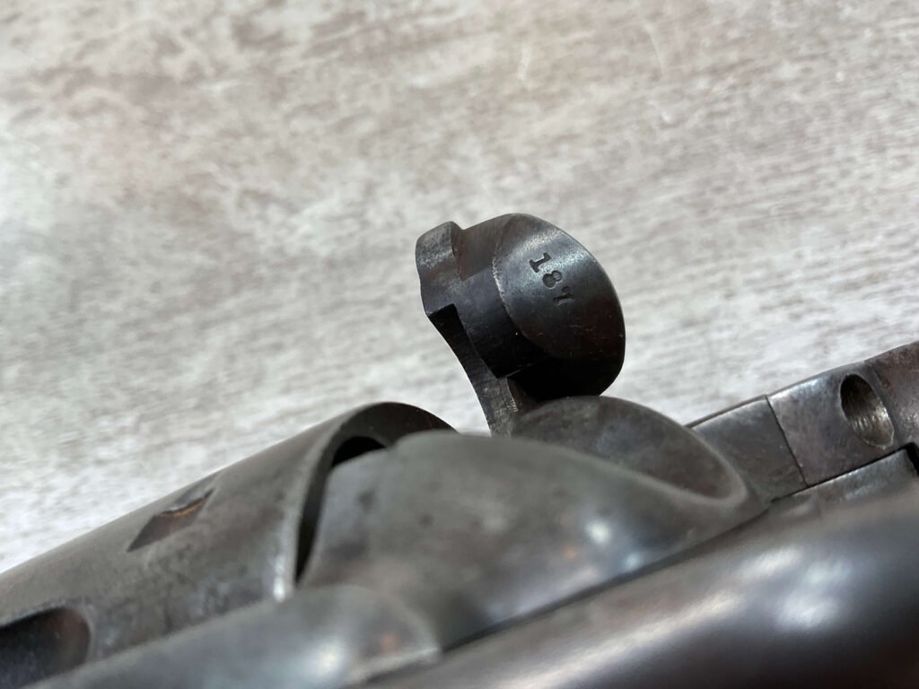 When military production resumed in the 30,000 serial range, the principal sub-inspectors during this eleven year period were John T. Cleveland (J.T.C.), Henry Nettleton (H.N.), and David F. Clark (D.F.C.). Starting in 1876, the marking procedure changed from one last name initial to two or all three of the sub-inspector’s initials. Also in 1876, the third patent date was added to the left side of the frame in a third line.