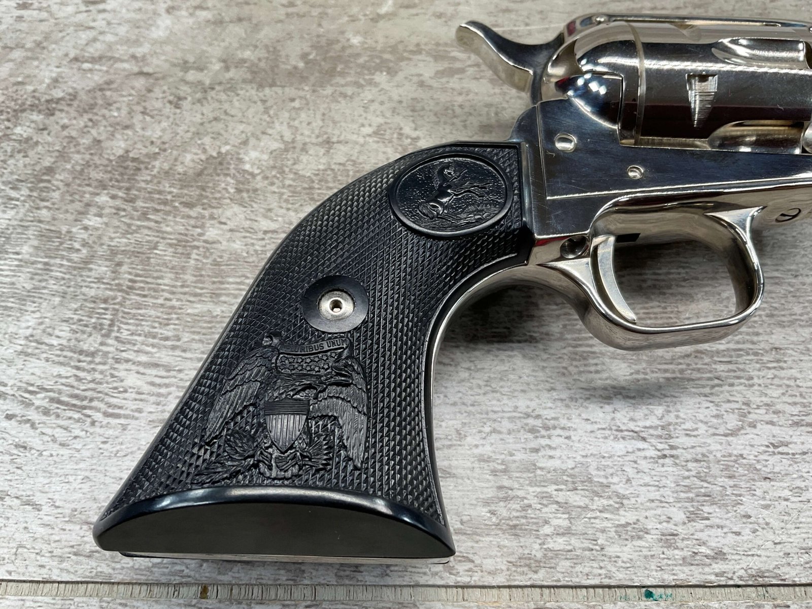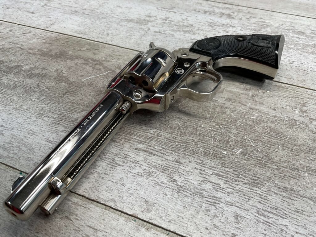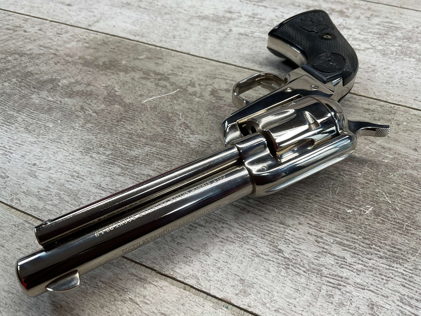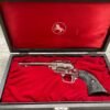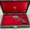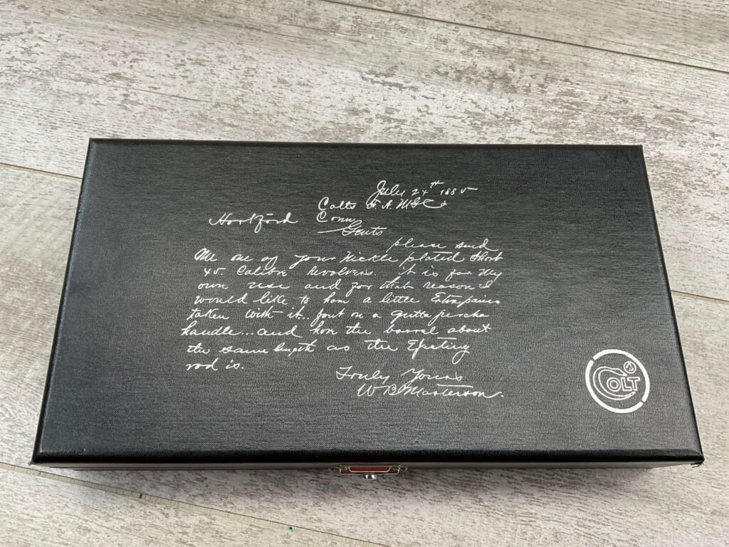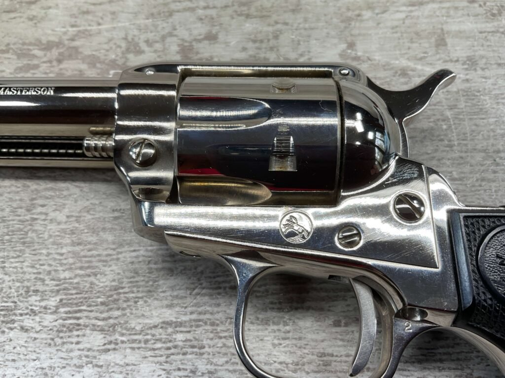 COLT SA FRONTIER SCOUT LAWMAN SERIES-BAT MASTERSON NICKEL REVOLVER, IN PRESENTATION CASE #1617LM, 4 3/4″ BARREL, EXC NICKEL FINISH W/NO HANDLING MARKS, EXC CLASSIC BLACK PLASTIC COLT GRIPS, LEATHERETTE PRESENTATION BOX, UNIFIRED & MINTY CONDITION