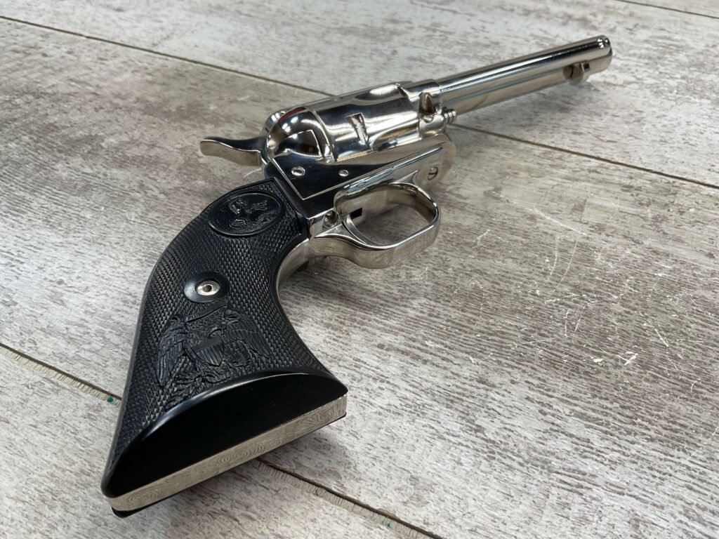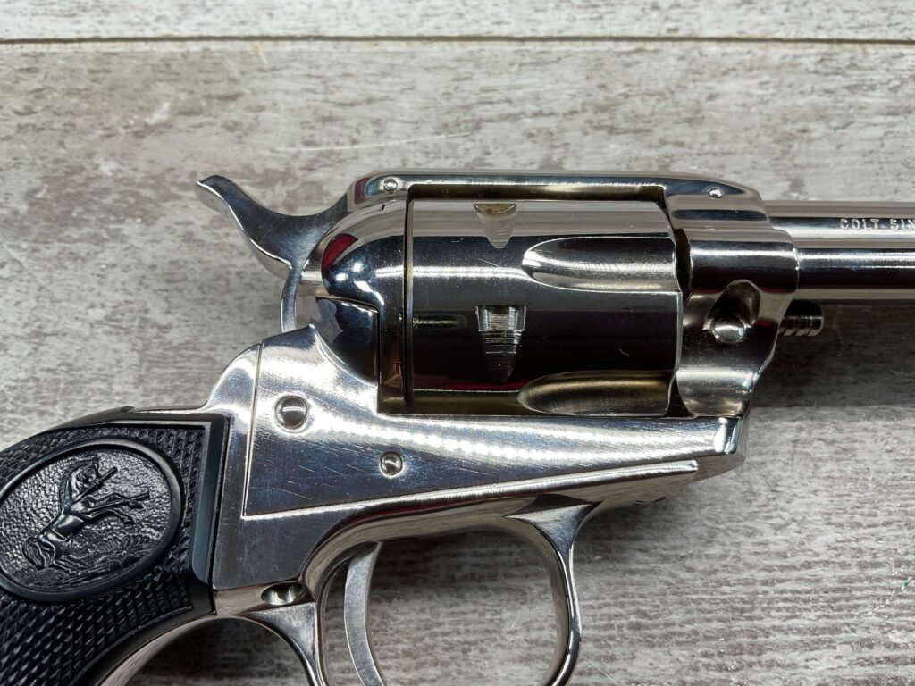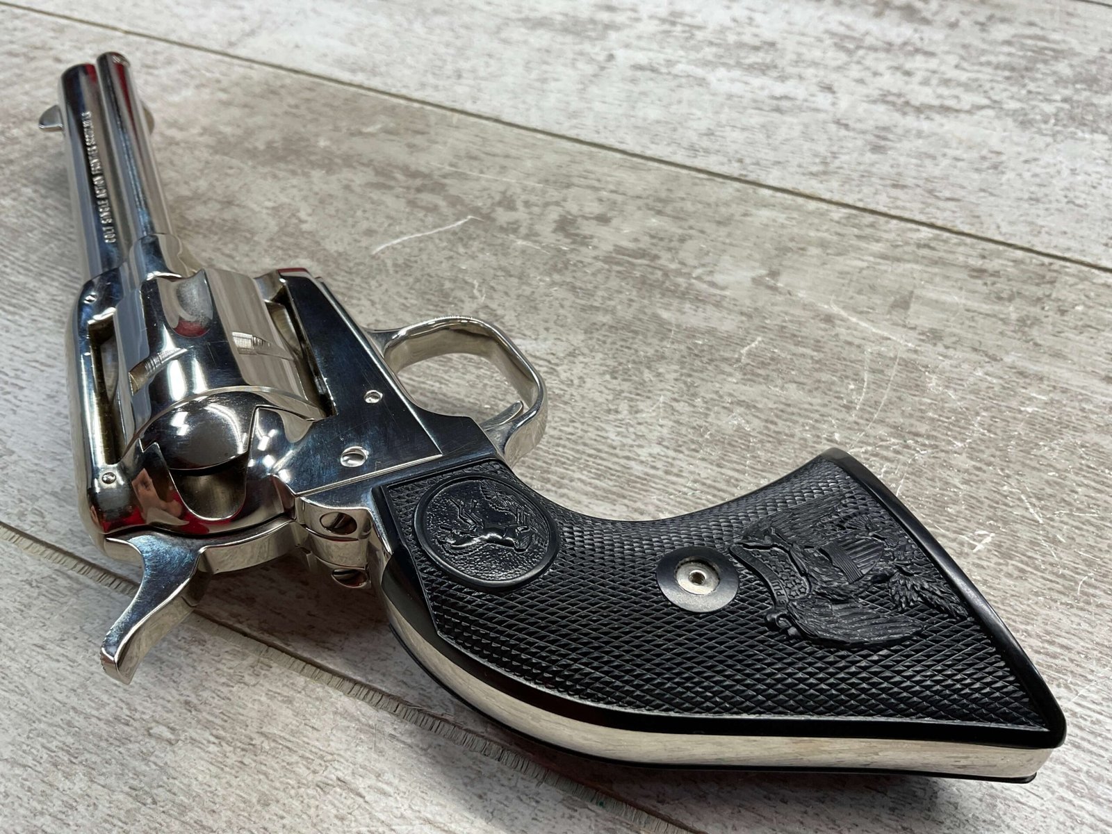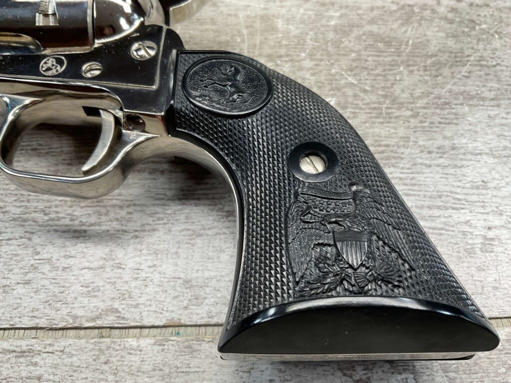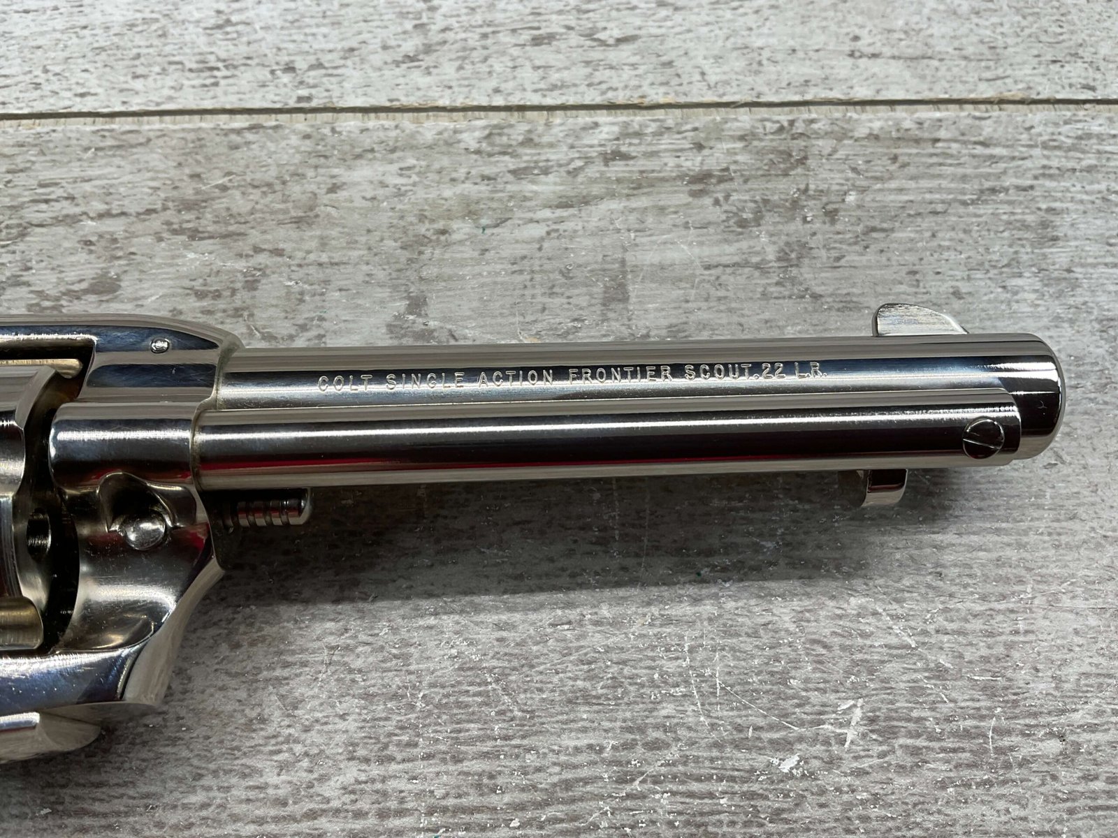 COLT SA FRONTIER SCOUT LAWMAN SERIES-BAT MASTERSON NICKEL REVOLVER, IN PRESENTATION CASE #1617LM, 4 3/4″ BARREL, EXC NICKEL FINISH W/NO HANDLING MARKS, EXC CLASSIC BLACK PLASTIC COLT GRIPS, LEATHERETTE PRESENTATION BOX, UNIFIRED & MINTY CONDITION