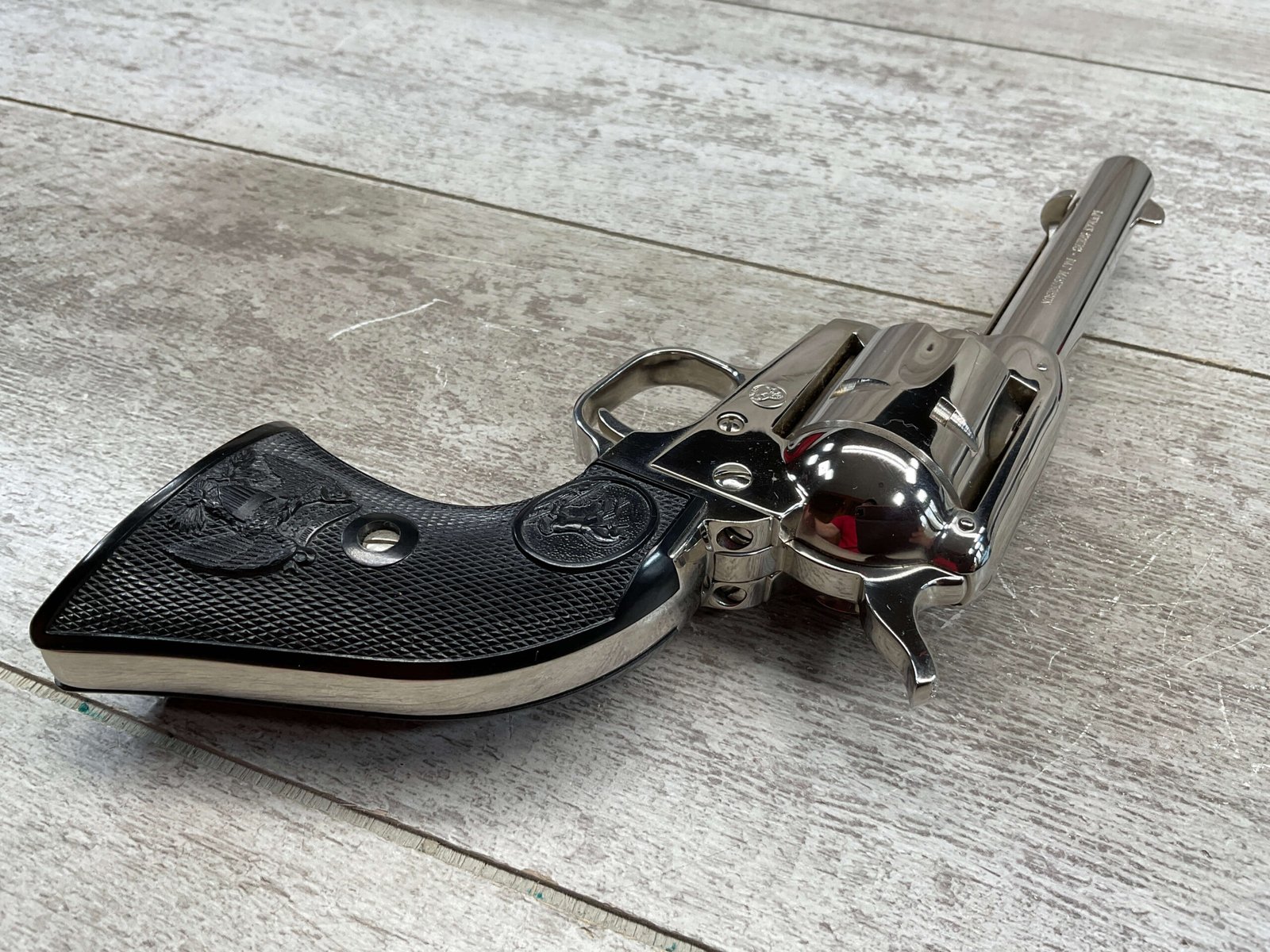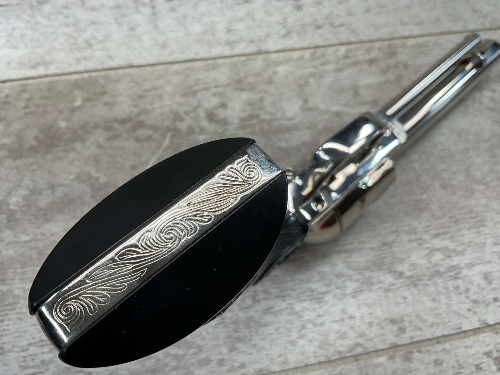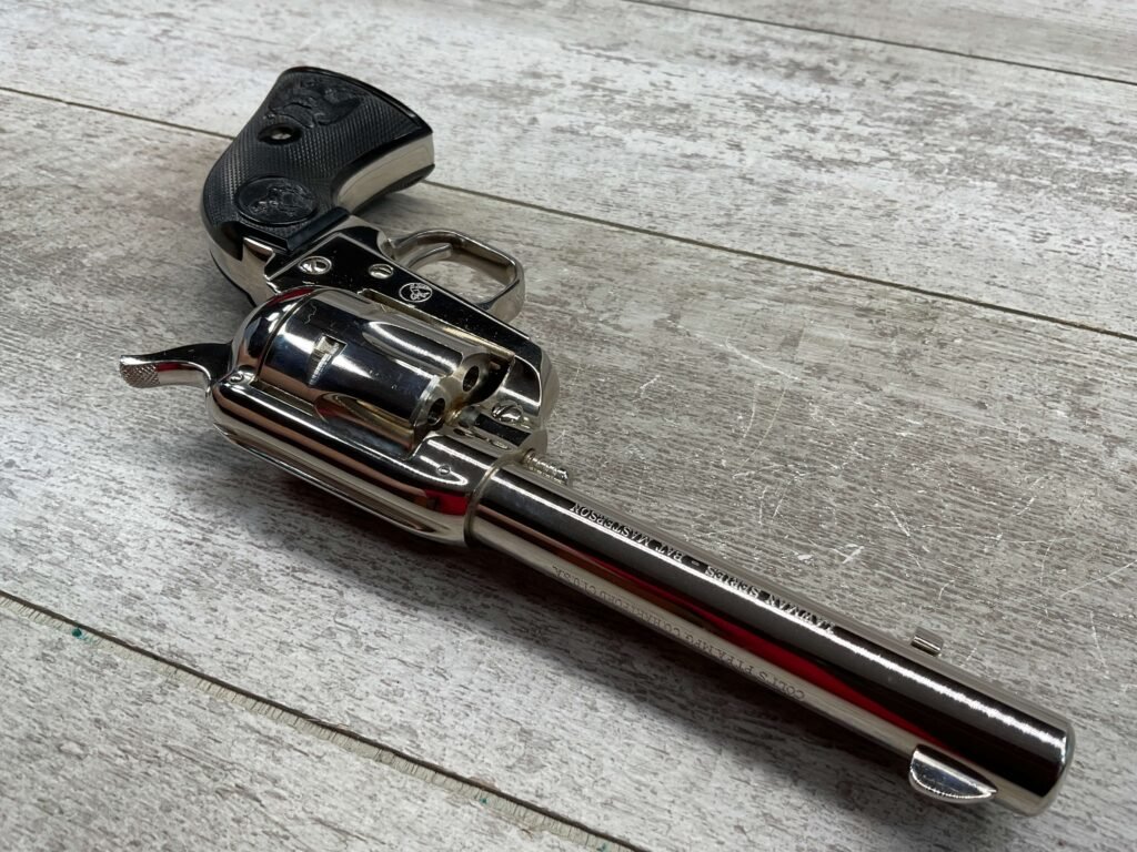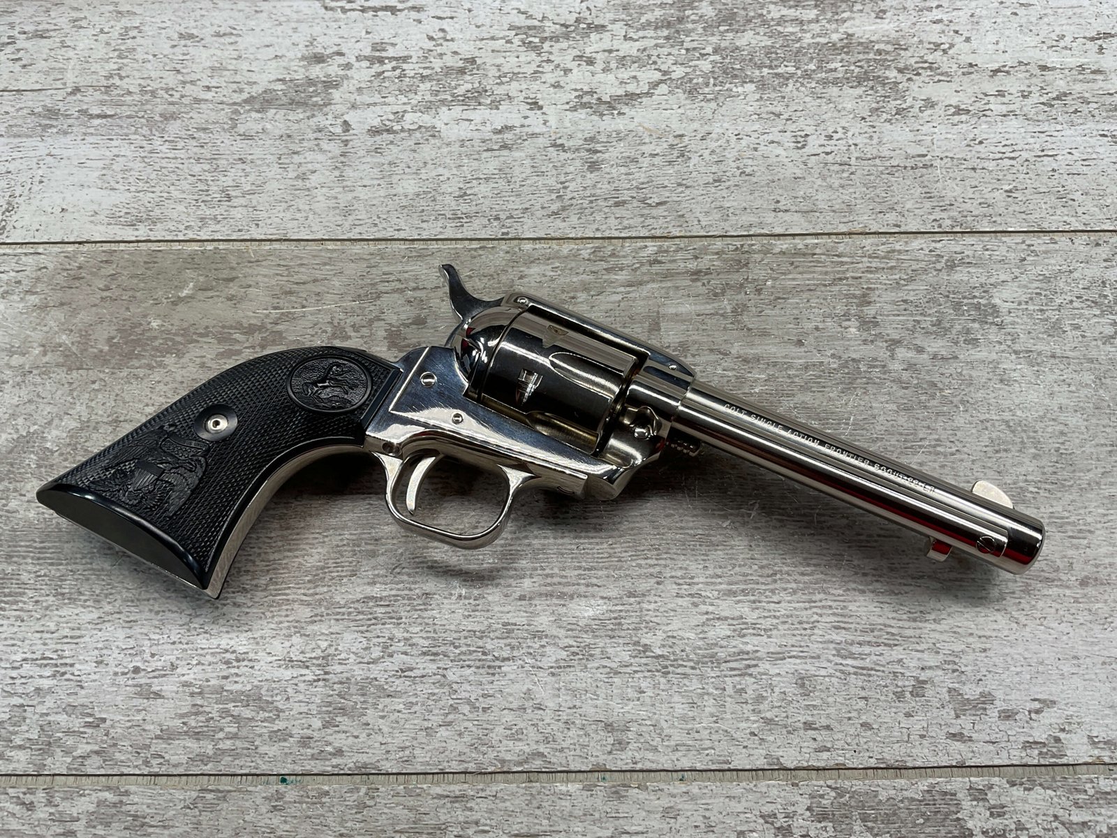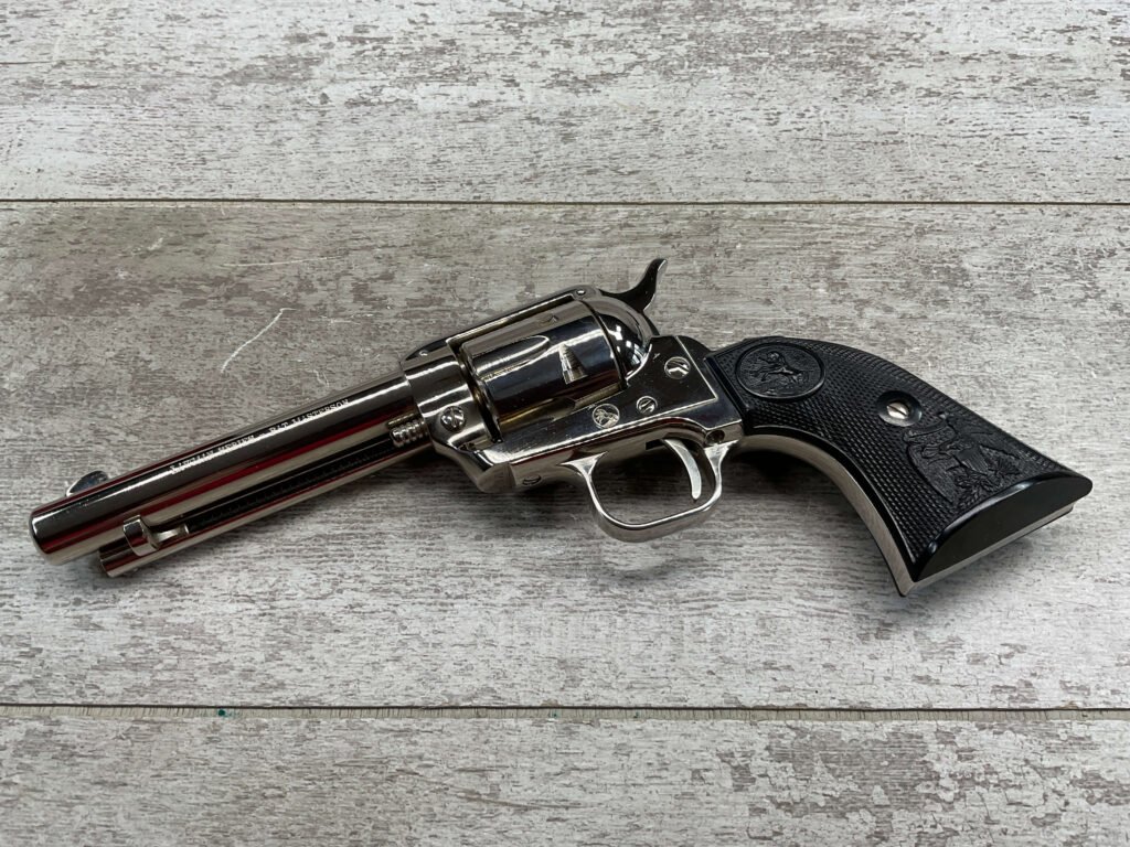 COLT SA FRONTIER SCOUT LAWMAN SERIES-BAT MASTERSON NICKEL REVOLVER, IN PRESENTATION CASE #1617LM, 4 3/4″ BARREL, EXC NICKEL FINISH W/NO HANDLING MARKS, EXC CLASSIC BLACK PLASTIC COLT GRIPS, LEATHERETTE PRESENTATION BOX, UNIFIRED & MINTY CONDITION