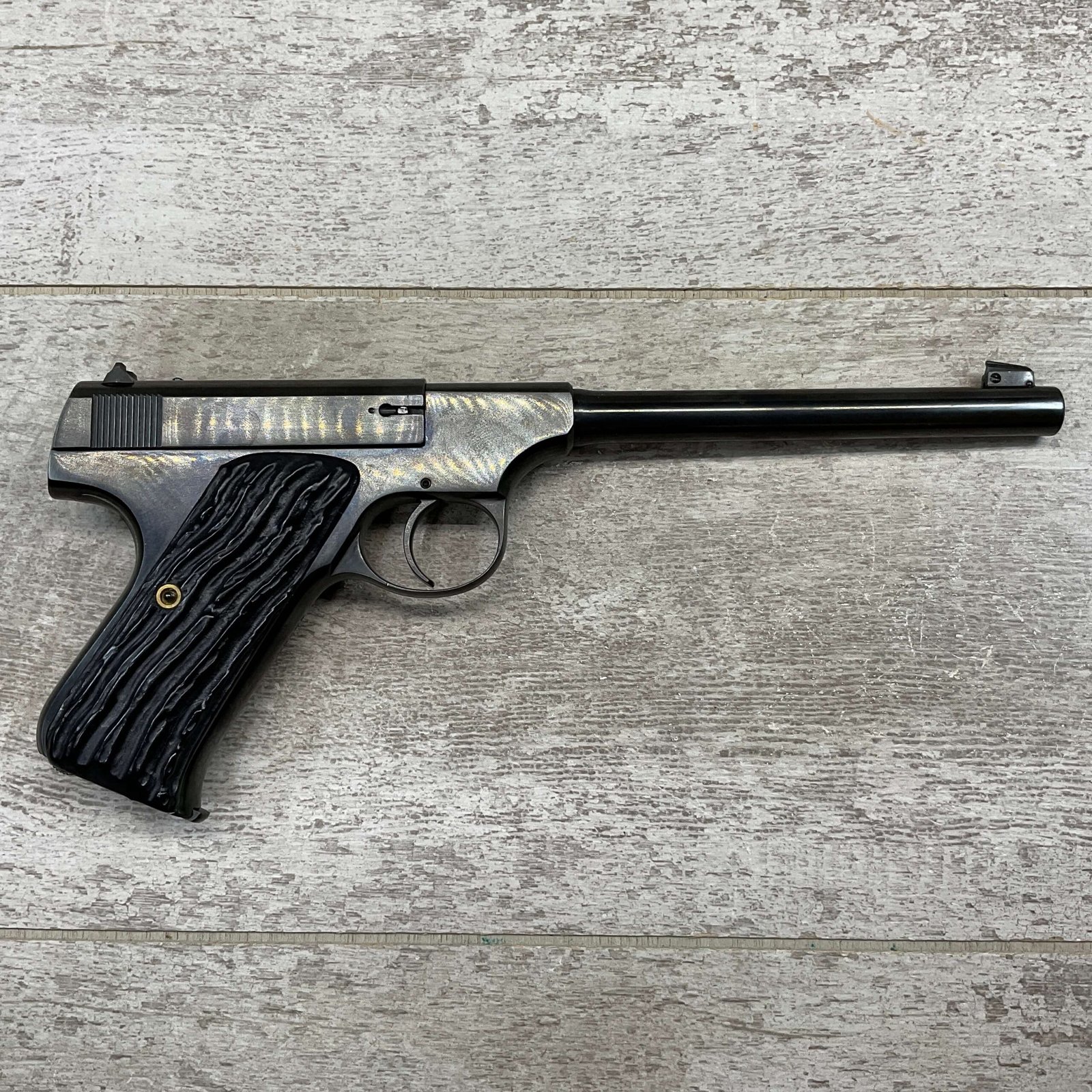 COLT WOODSMAN 1ST GENERATION .22LR SEMI AUTO PISTOL, 1928 MFR, #64821, 98% ORIGINAL BLUE FINISH, “CAL.22 / COLT” MARKED ORIGINAL MAGAZINE, EXC BORE & RIFLING, 6 5/8″ BARREL, AFTERMARKET BLACK FAUX STAG PLASTIC GRIPS (SHOULD HAVE CHECKERED WOOD GRIPS) EXC OVERALL & A GREAT ADDITION FOR THE SERIOUS COLLECTOR!!