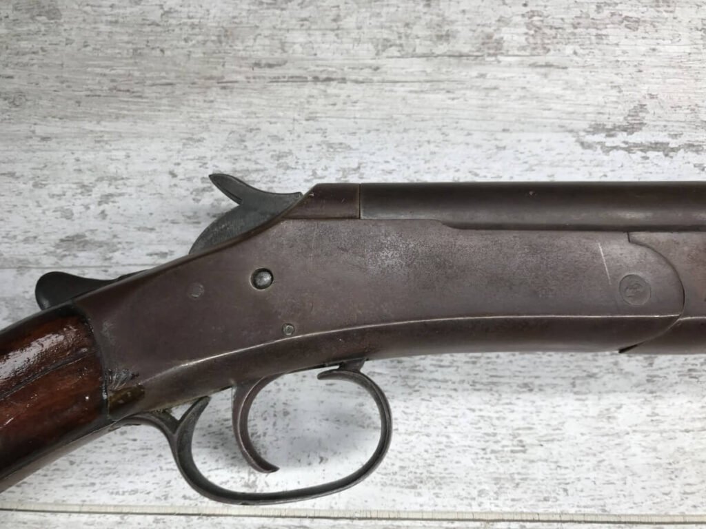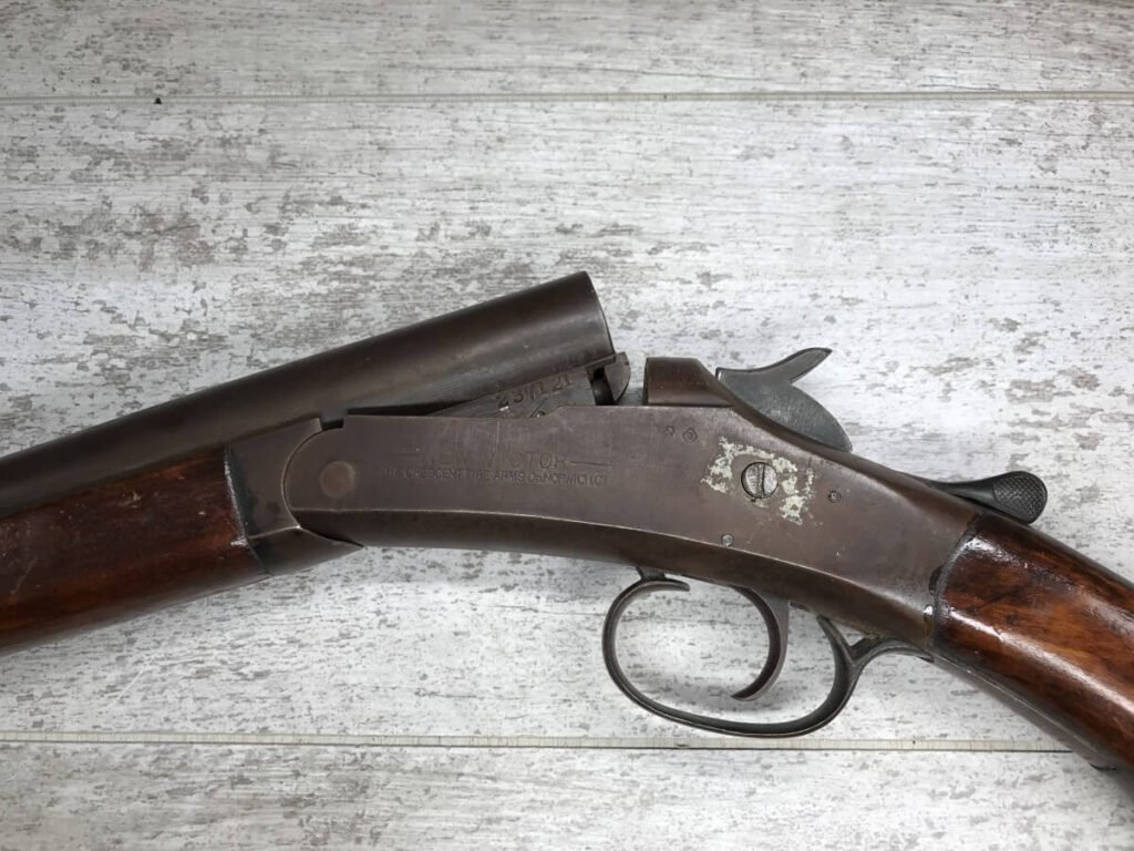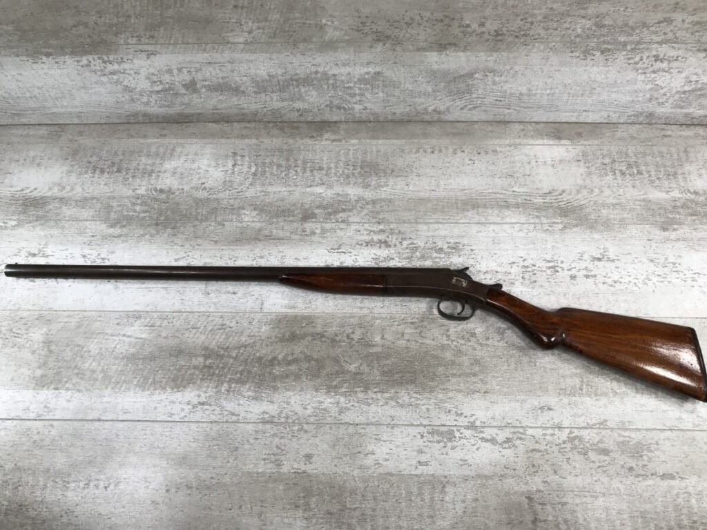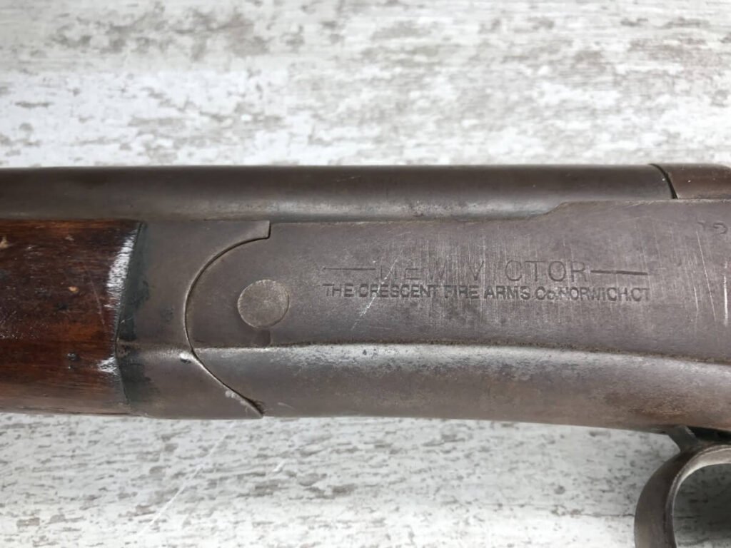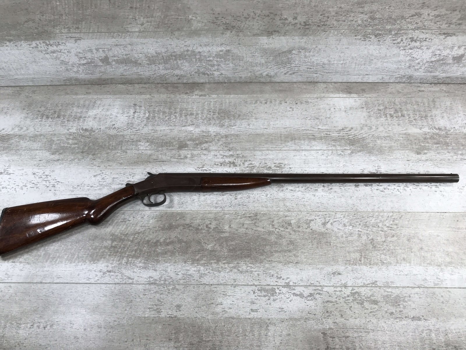 CRESCENT FIREARMS CO. 12GA TOP BREAK SINGLE SHOT SHOTGUN #NSN, BROWN PATINA, OK WOOD W/SOME CRACKS AND REVARNISH, REMINGTON PLASTIC BUTT PLATE, FAIR CONDITION, 60% EXCELLENT WALL HANGER!