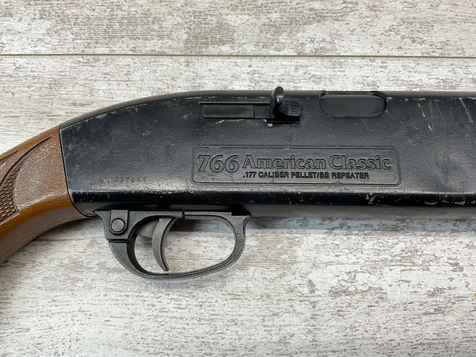 CROSMAN 766 AMERICAN CLASSIC .177 CAL AIR RIFLE, VINTAGE, #881657066, SINGLE SHOT PELLET – BB REPEATER, BODY HAS MANY SCRATCHES AND MARKS, OVERALL 85%