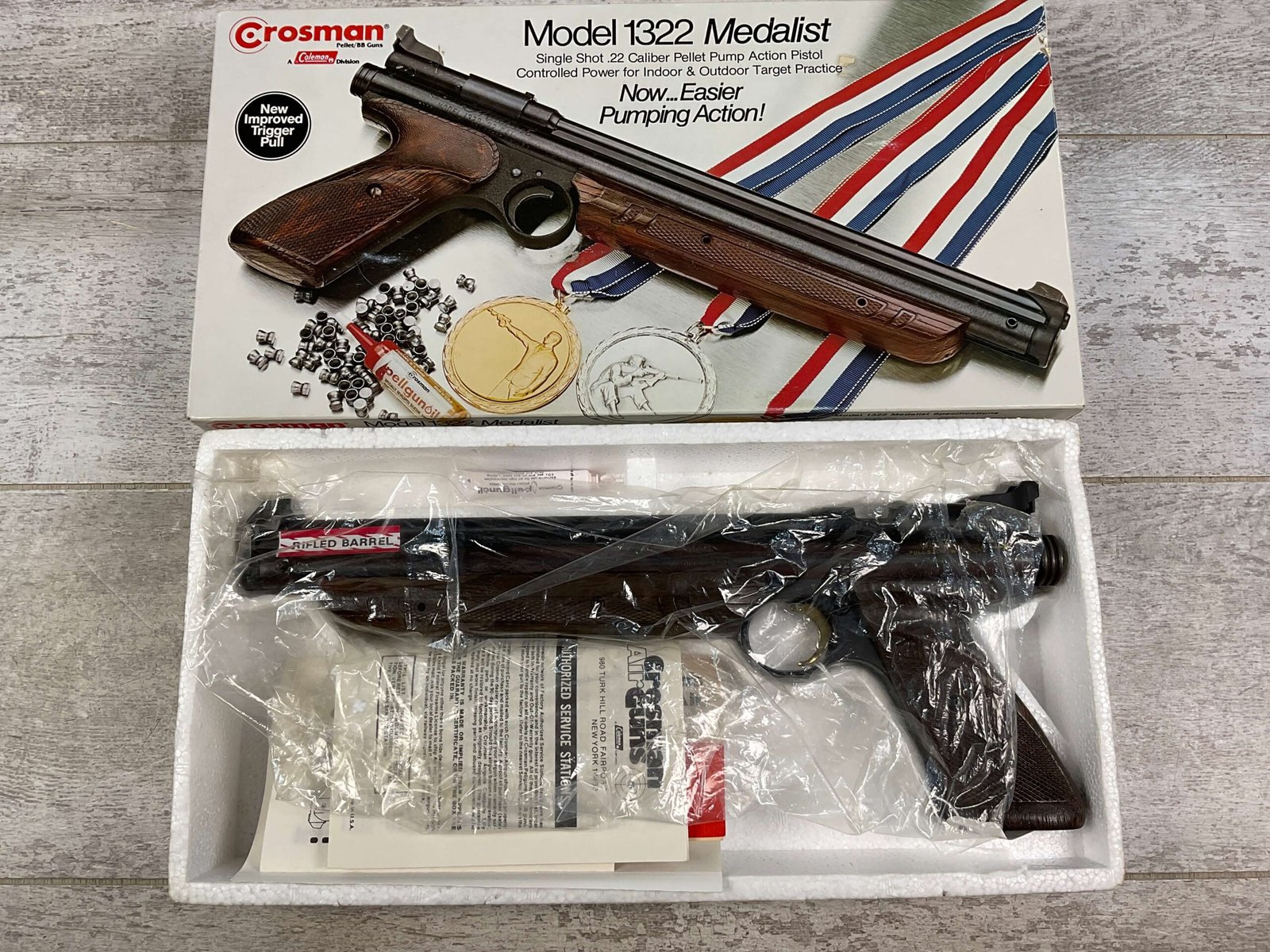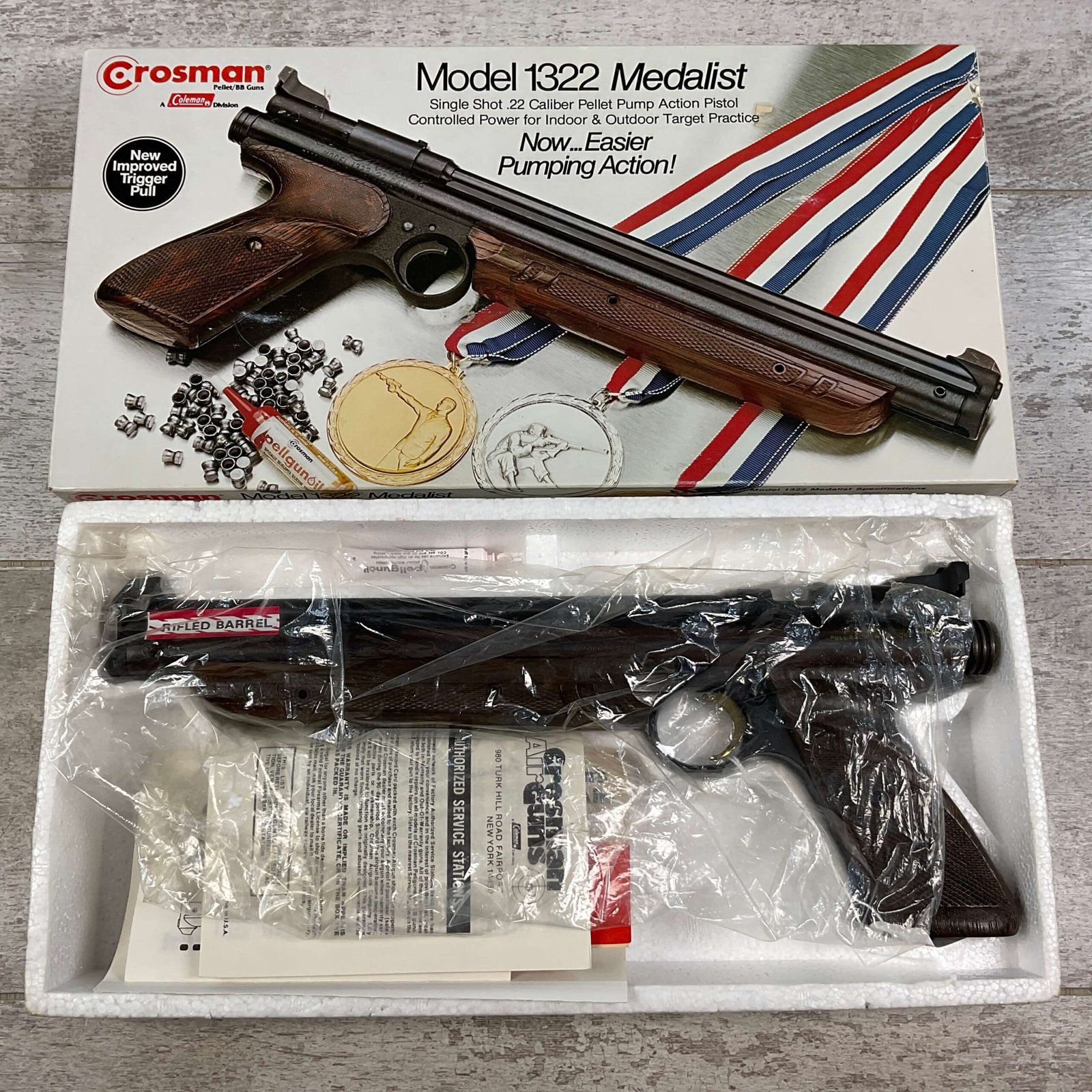 CROSMAN MODEL 1322 .22CAL PELLET PISTOL, VINTAGE IN BOX, EXC CONDITION VINTAGE BOX, ACCESSORIES INCLUDED, VERY NICE!