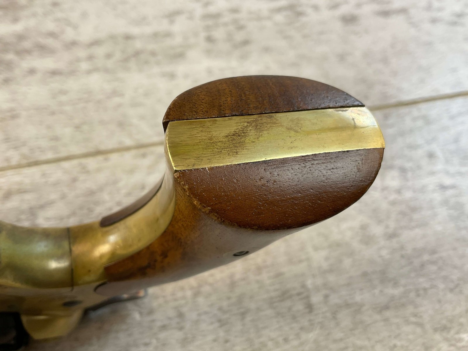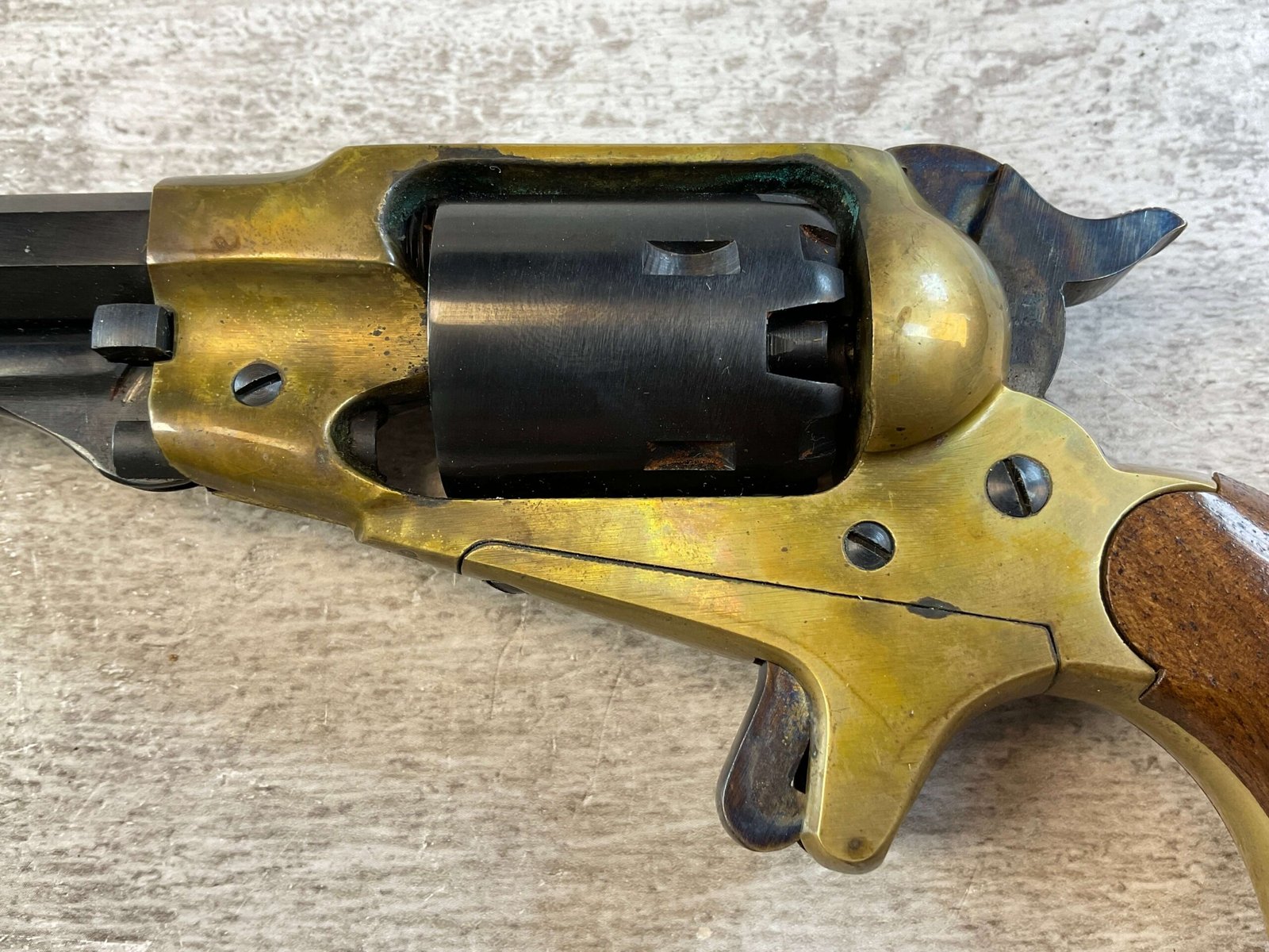 CVA 1863 REMINGTON .31 CAL PERCUSSION POCKET REVOLVER #20936, .31 CAL, ALL MATCHING, 3.5″ OCTAGON BARREL, 5 SHOT CYLINDER, MADE IN ITALY, MODERN REPRODUCTION (COPY OF REMINGTON 1863), VG BRASS FRAME, EXC BLUE ON CYLINDER & BARREL, CASE COLOR HARDENED HAMMER & TRIGGER, SPUR TRIGGER, CONDITION AS SHOWN IN PICTURES, FROM THE JAMES EARL JONES “FAVORITES” COLLECTION W/ CERTIFICATE OF AUTHENTICITY.