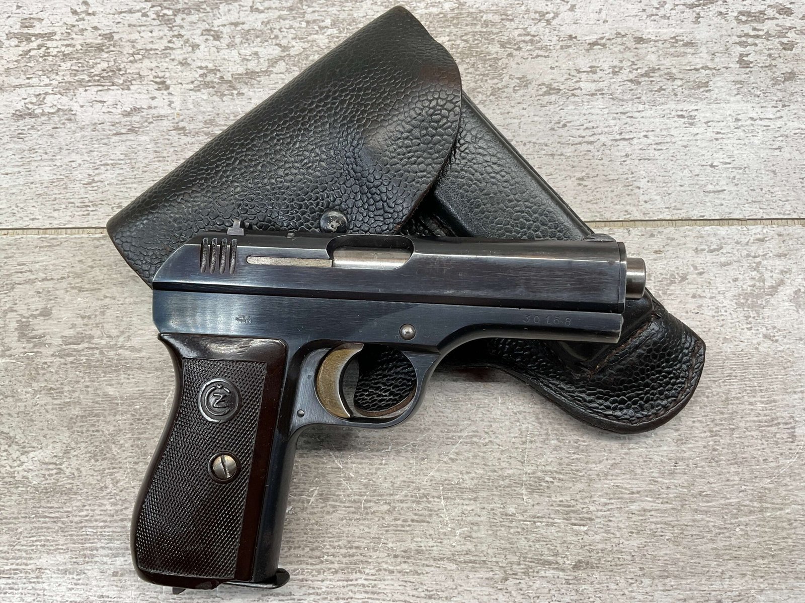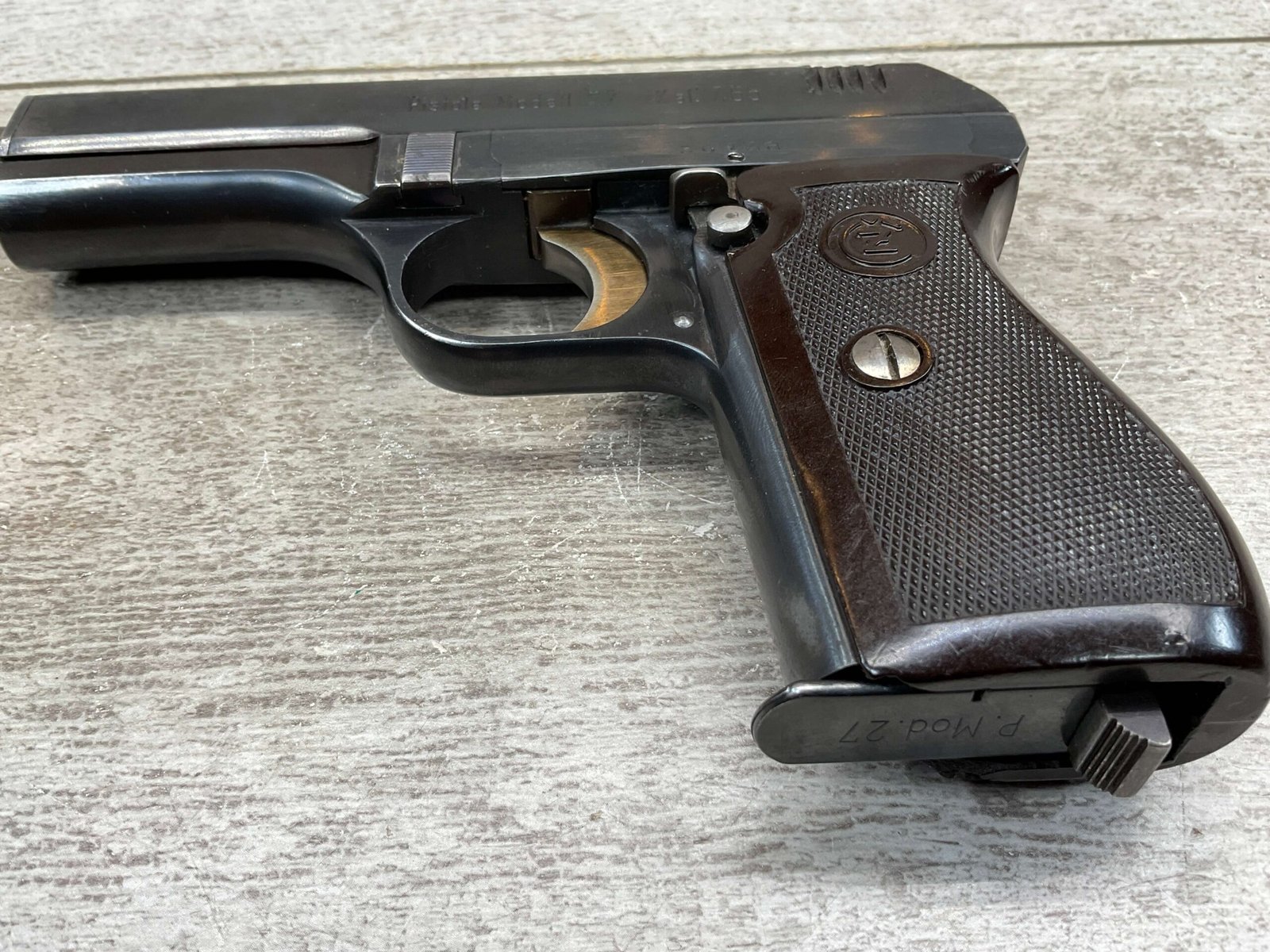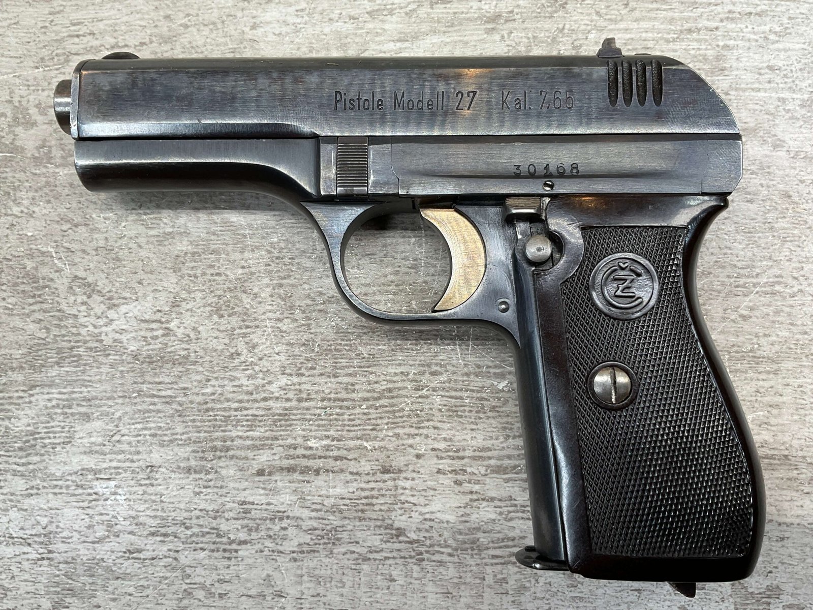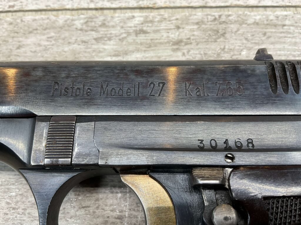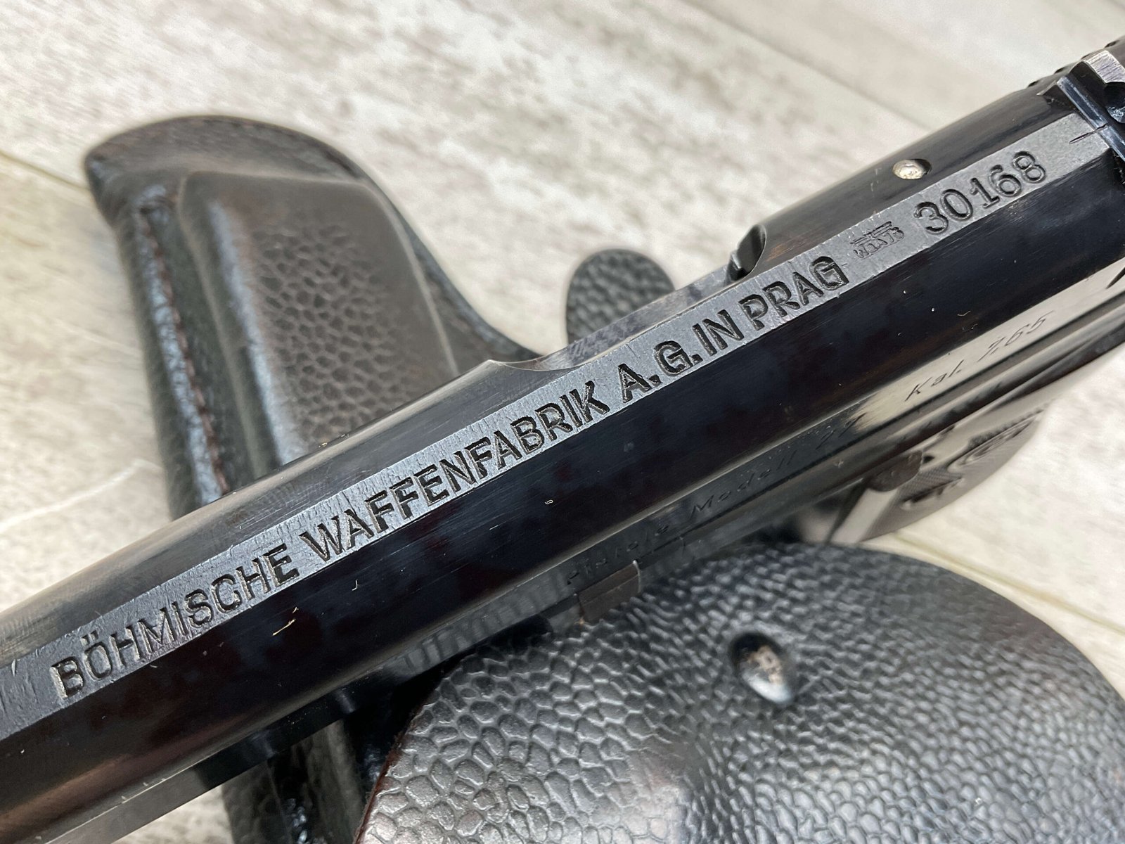 CZ27 7.65MM NAZI MARKED W/2 MAGS & HOLSTER #30168, “PISTOLE MODELL 27 KAL 7.65” ON LEFT SIDE OF SLIDE, “BOHMISCHE WAFFENFABRIK A.G. IN PRAG WaA76 30168″” TOP OF SLIDE, EXC BLACK PEBBLE GRAIN HOLSTER & EXTRA MAG “P.MOD 27” MARKED BASE, EXC BRIGHT BORE & RIFLING, VG PLASTIC GRIPS W/ SMALL PIECE MISSING ON RIGHT SIDE, “WaA76 PROOFED FRAME & BARREL, ALL MATCHING, 95%+ OVERALL