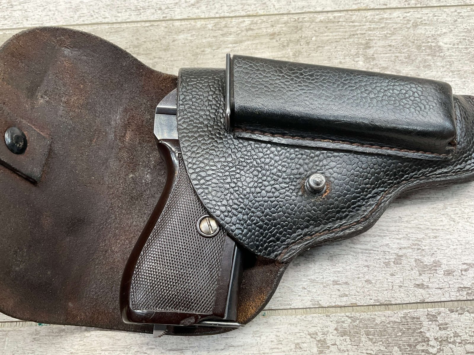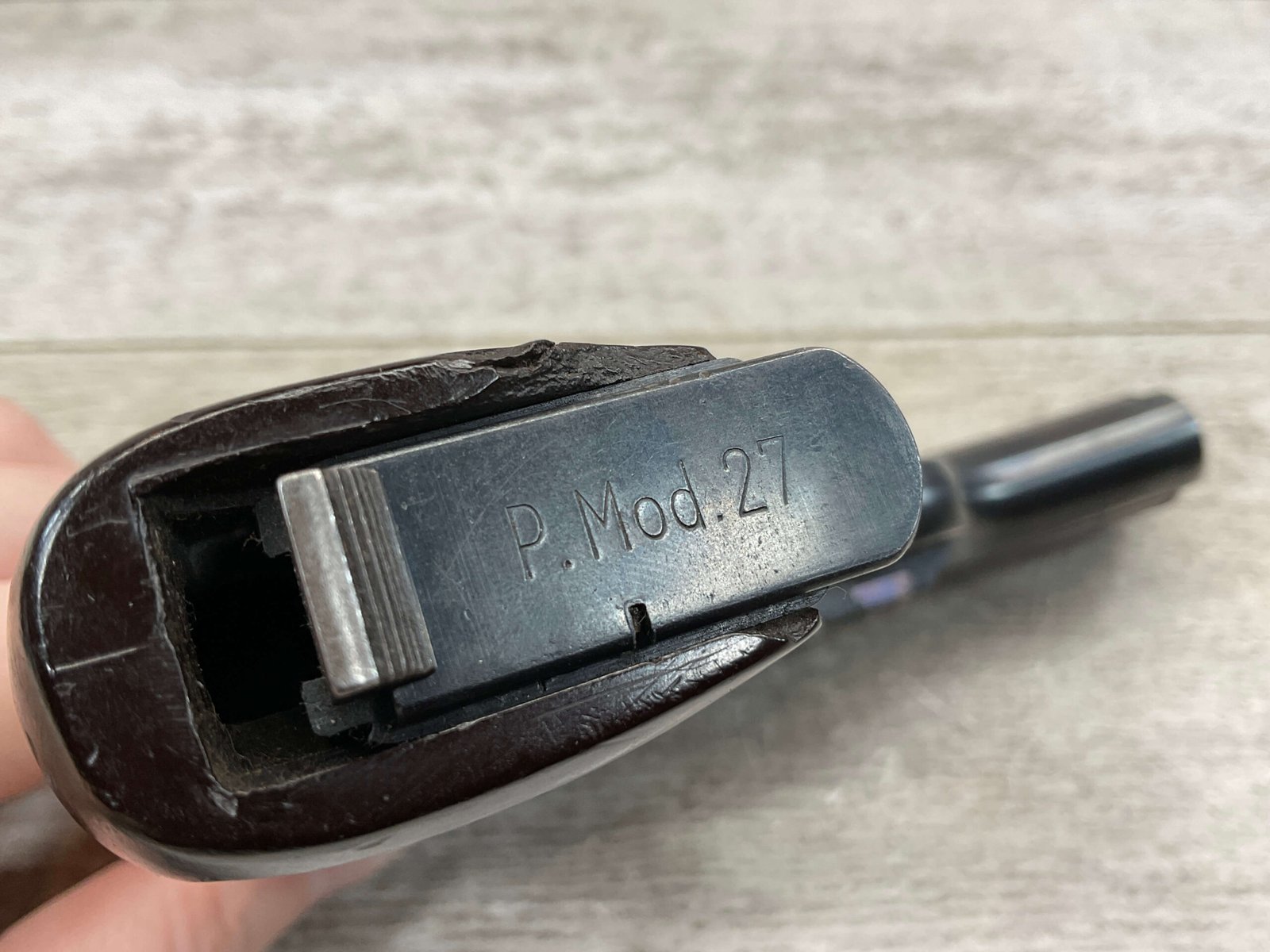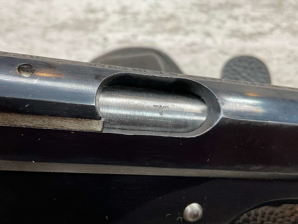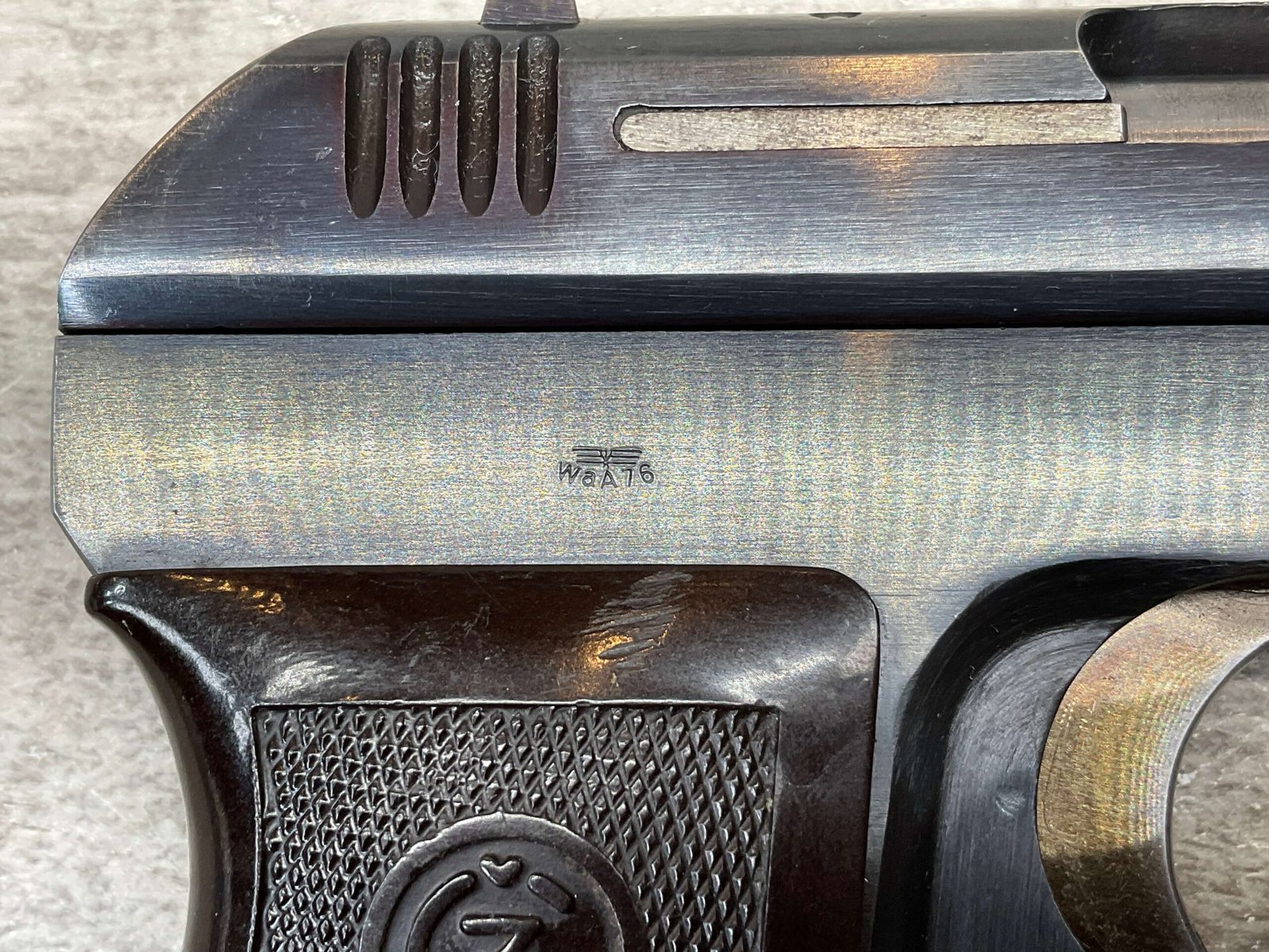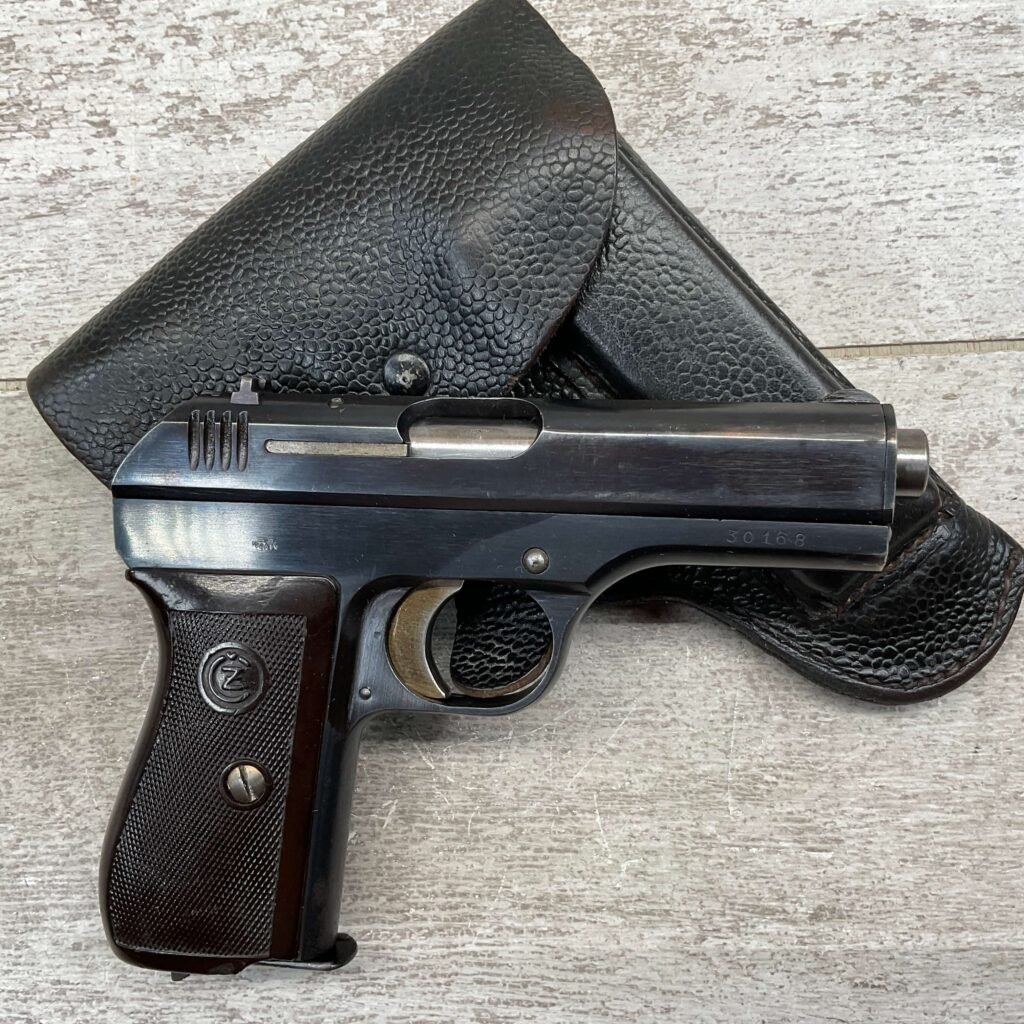 CZ27 7.65MM NAZI MARKED W/2 MAGS & HOLSTER #30168, “PISTOLE MODELL 27 KAL 7.65” ON LEFT SIDE OF SLIDE, “BOHMISCHE WAFFENFABRIK A.G. IN PRAG WaA76 30168″” TOP OF SLIDE, EXC BLACK PEBBLE GRAIN HOLSTER & EXTRA MAG “P.MOD 27” MARKED BASE, EXC BRIGHT BORE & RIFLING, VG PLASTIC GRIPS W/ SMALL PIECE MISSING ON RIGHT SIDE, “WaA76 PROOFED FRAME & BARREL, ALL MATCHING, 95%+ OVERALL