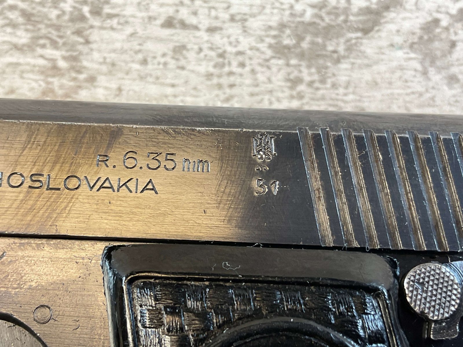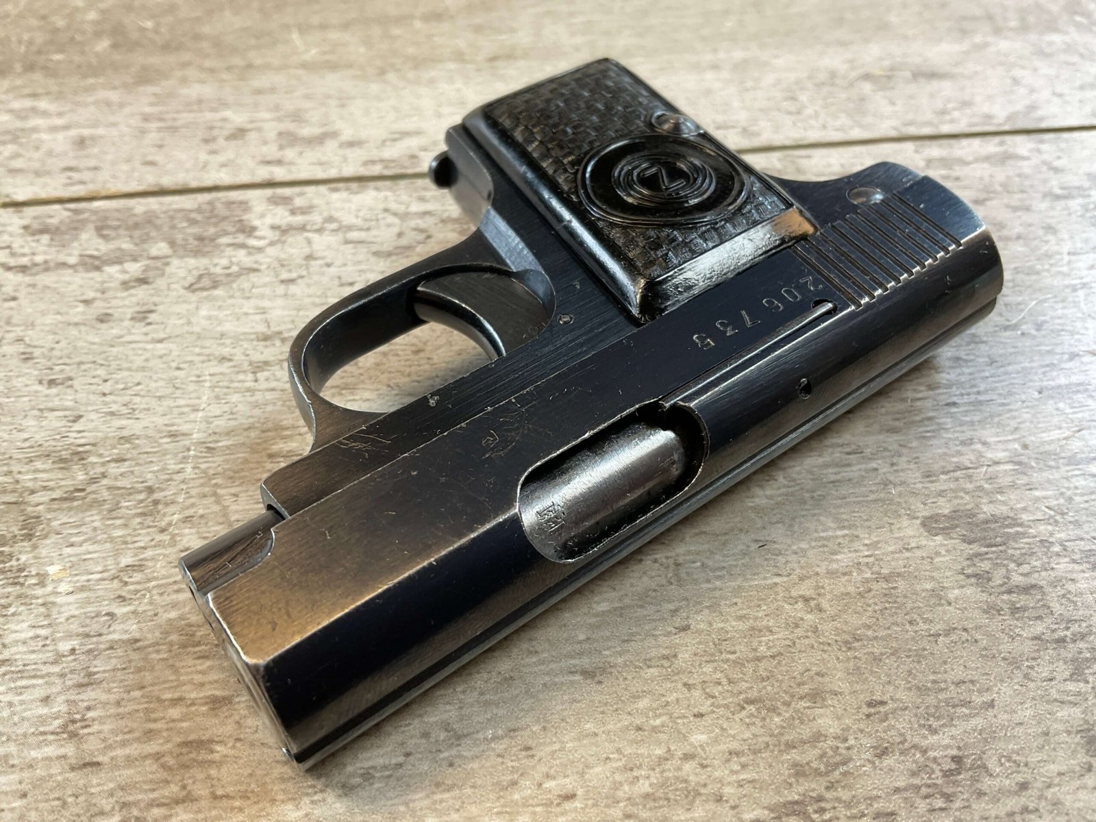 CZECH CZ DUO 6.35MM SEMI AUTO PISTOL, 1951 MFR #58109, 6.35mm, 2″ BBL, ALL MATCHING, EXCELLENT GRIPS W/NO CHIPS & VERY LIGHT WEAR, LEFT SIDE OF SLIDE MARKED “Z AUT. PISTOLE OVER MADE IN CZECHOSLOVAKIA, R.6.35mm”, RIGHT SIDE HAS SERIAL #, EXC ORIGINAL BLUE FINISH W/LIGHT HIGH EDGE WEAR, ORIGINAL MAGAZINE, MIRROR BRIGHT BORE W/ EXC MICRO RIFLING, 90%+ OVERALL