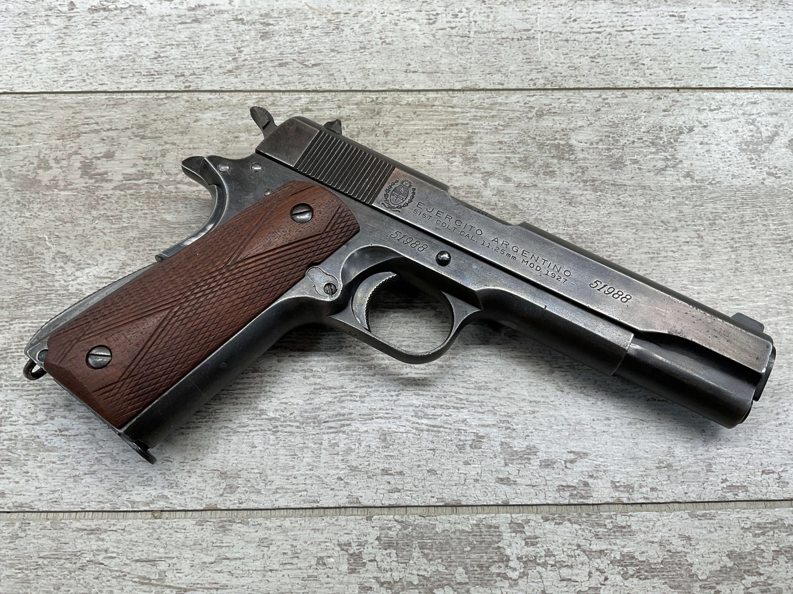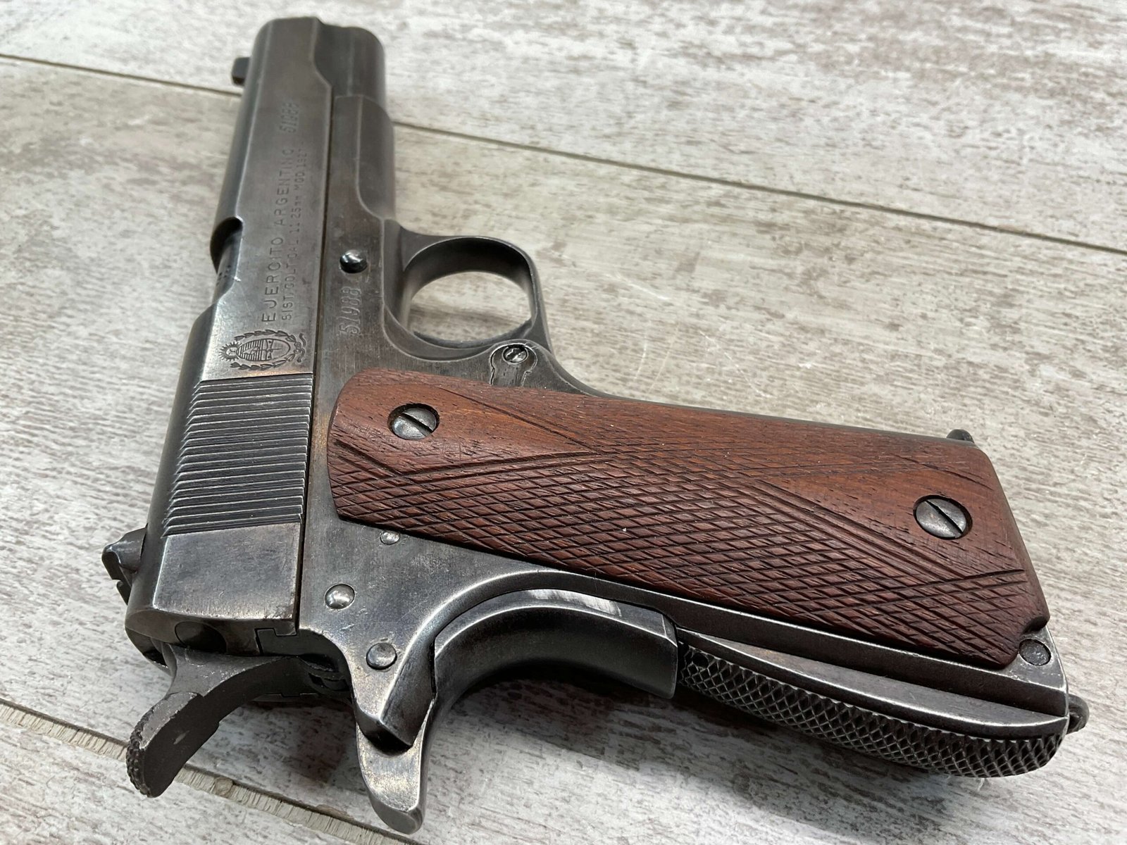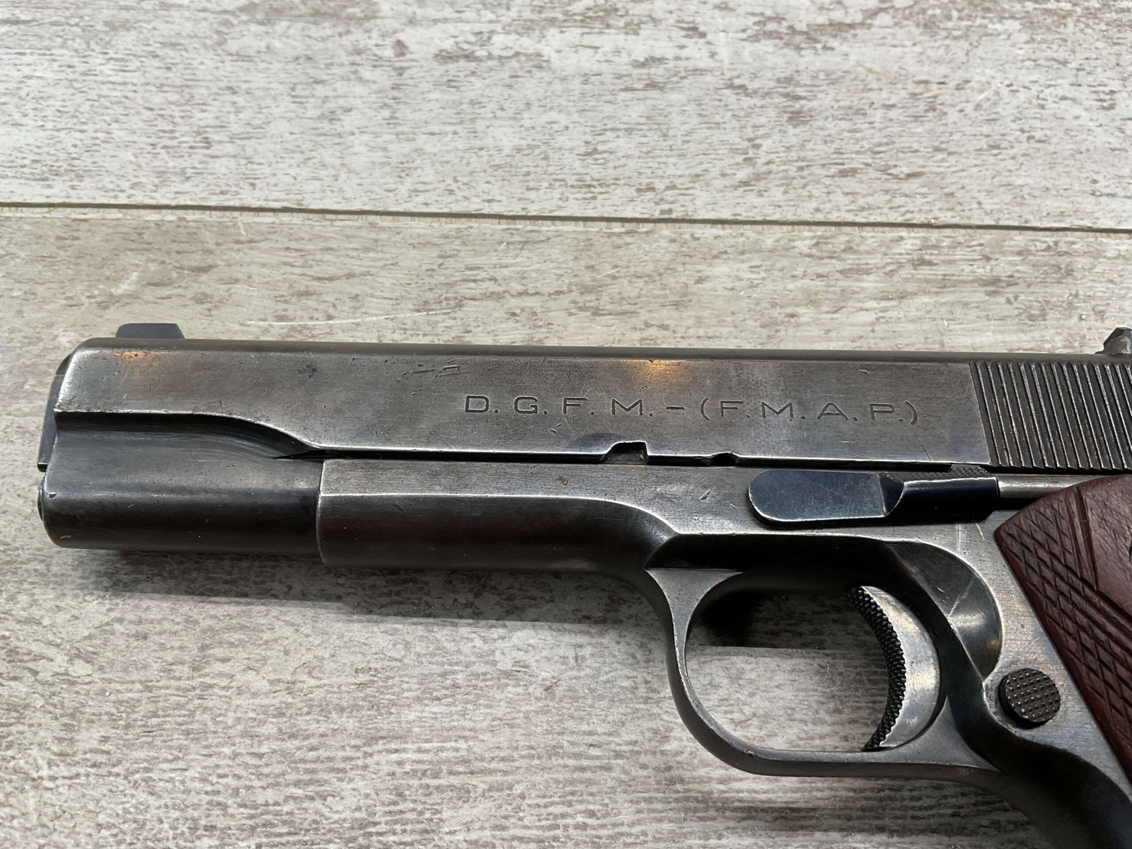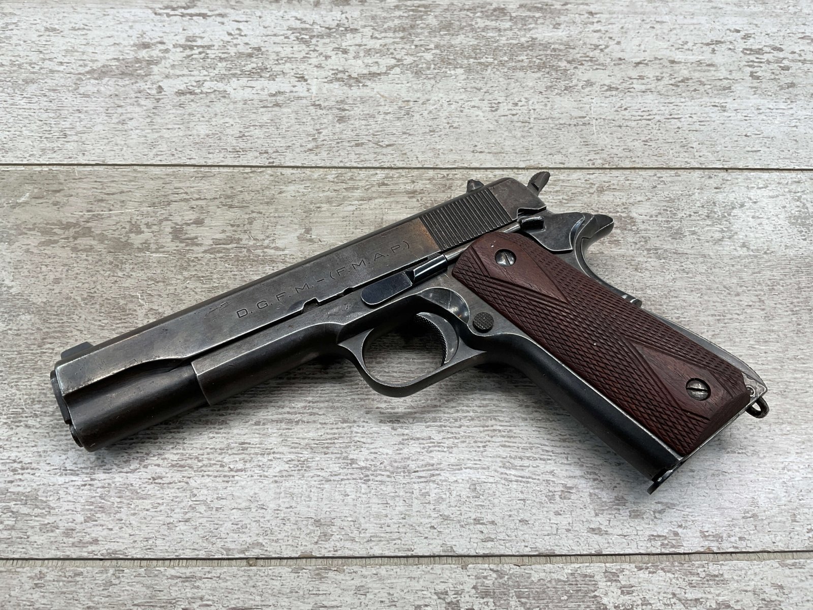 The D.G.F.M Model 1927 was produced at the Argentine arsenal Fábrica Militar de Armas Portátiles “Domingo Matheu” in Rosario. It is nearly identical to the Colt M1911A1 but often features slight differences in markings and may have been produced with local materials and craftsmanship.