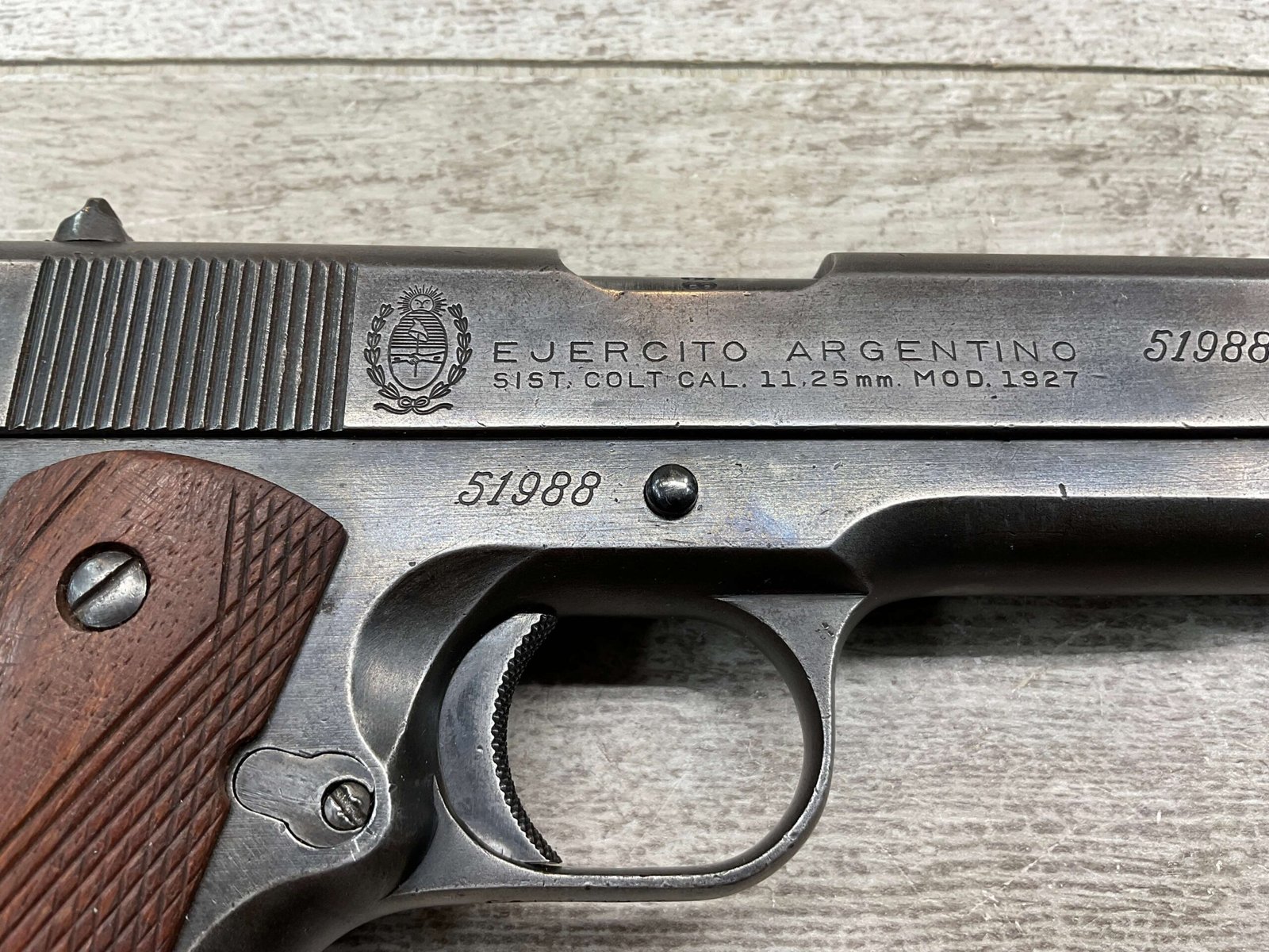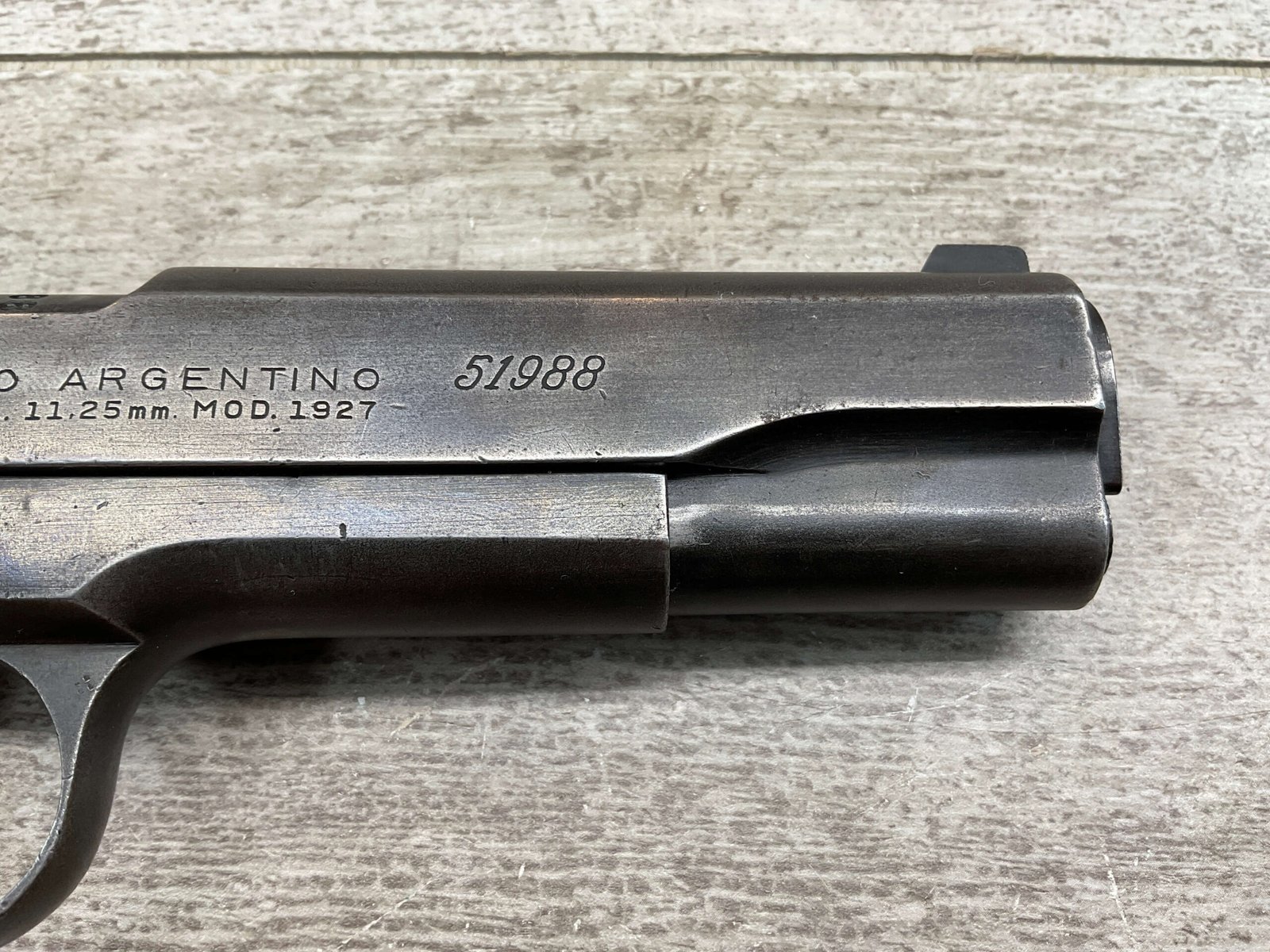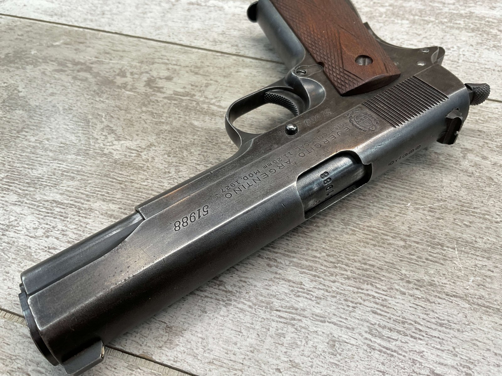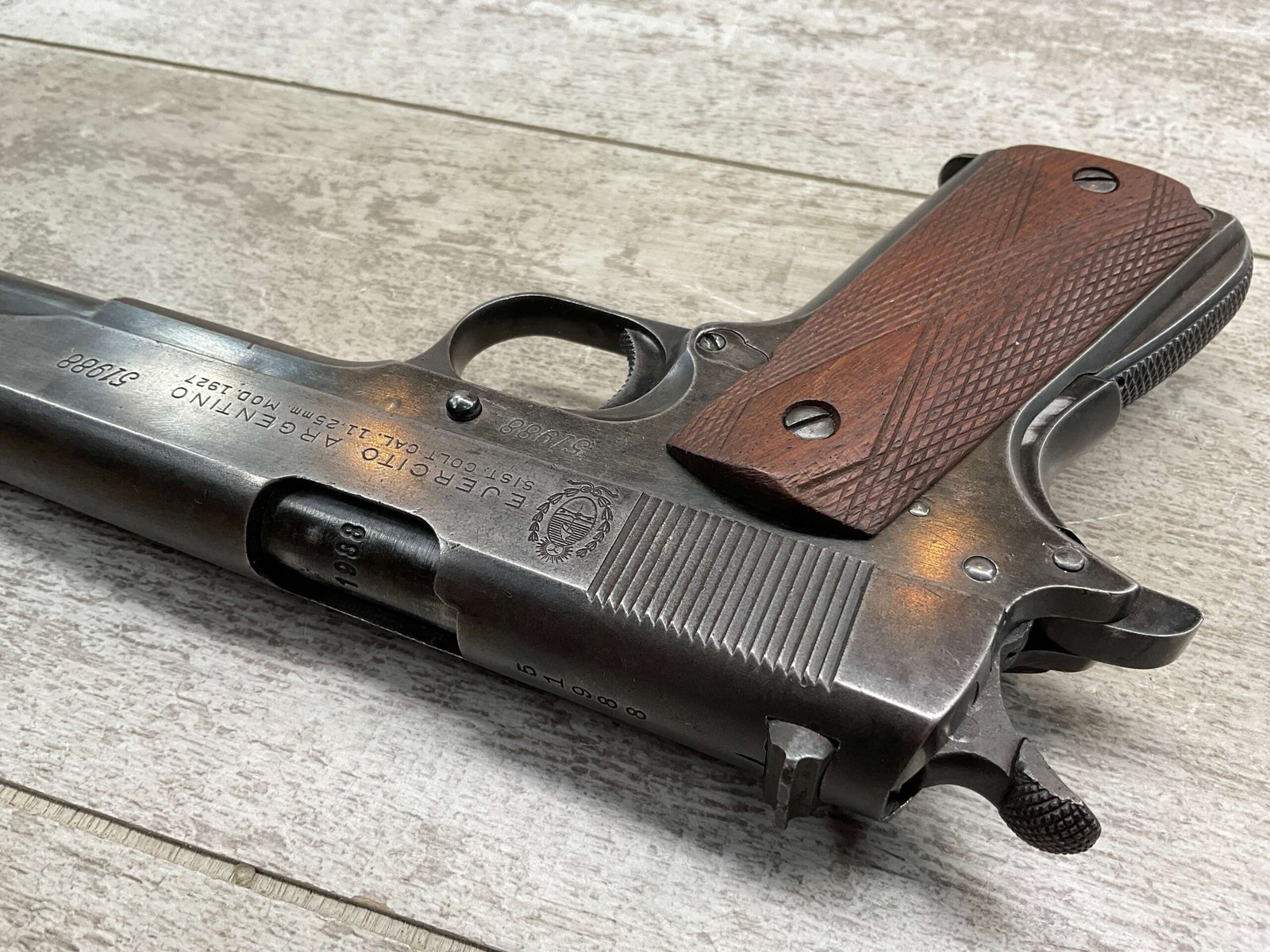 The D.G.F.M Model 1927 was produced at the Argentine arsenal Fábrica Militar de Armas Portátiles “Domingo Matheu” in Rosario. It is nearly identical to the Colt M1911A1 but often features slight differences in markings and may have been produced with local materials and craftsmanship.