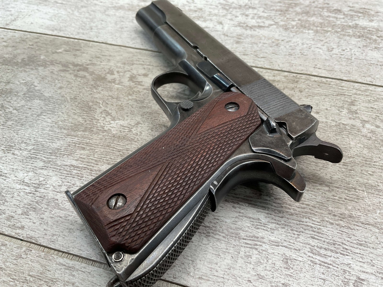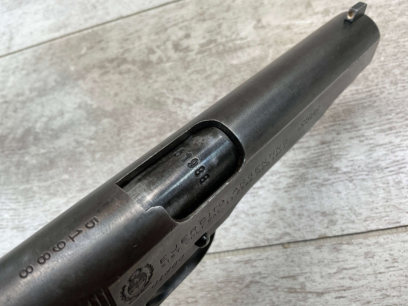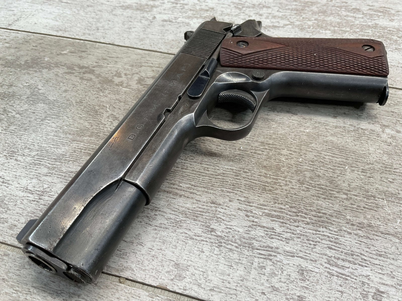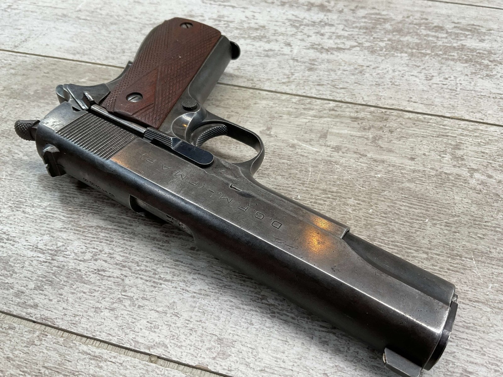 The D.G.F.M Model 1927 was produced at the Argentine arsenal Fábrica Militar de Armas Portátiles “Domingo Matheu” in Rosario. It is nearly identical to the Colt M1911A1 but often features slight differences in markings and may have been produced with local materials and craftsmanship.