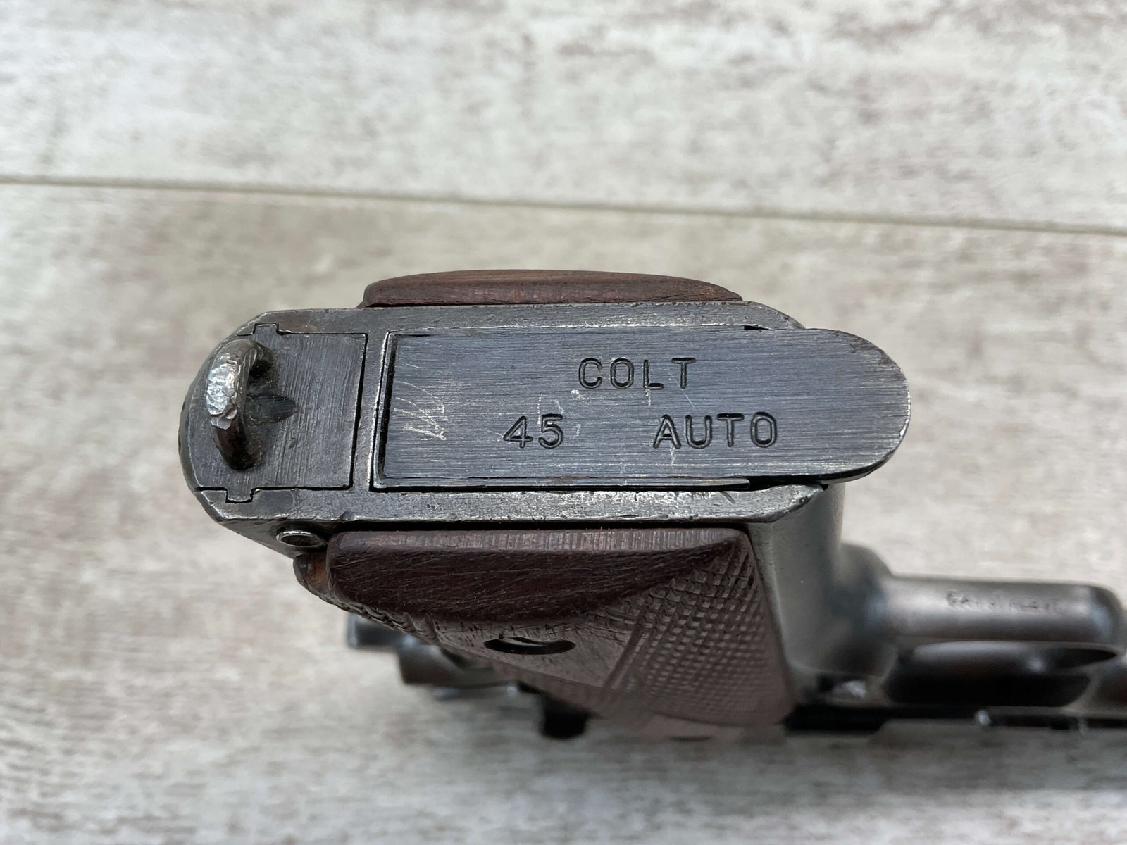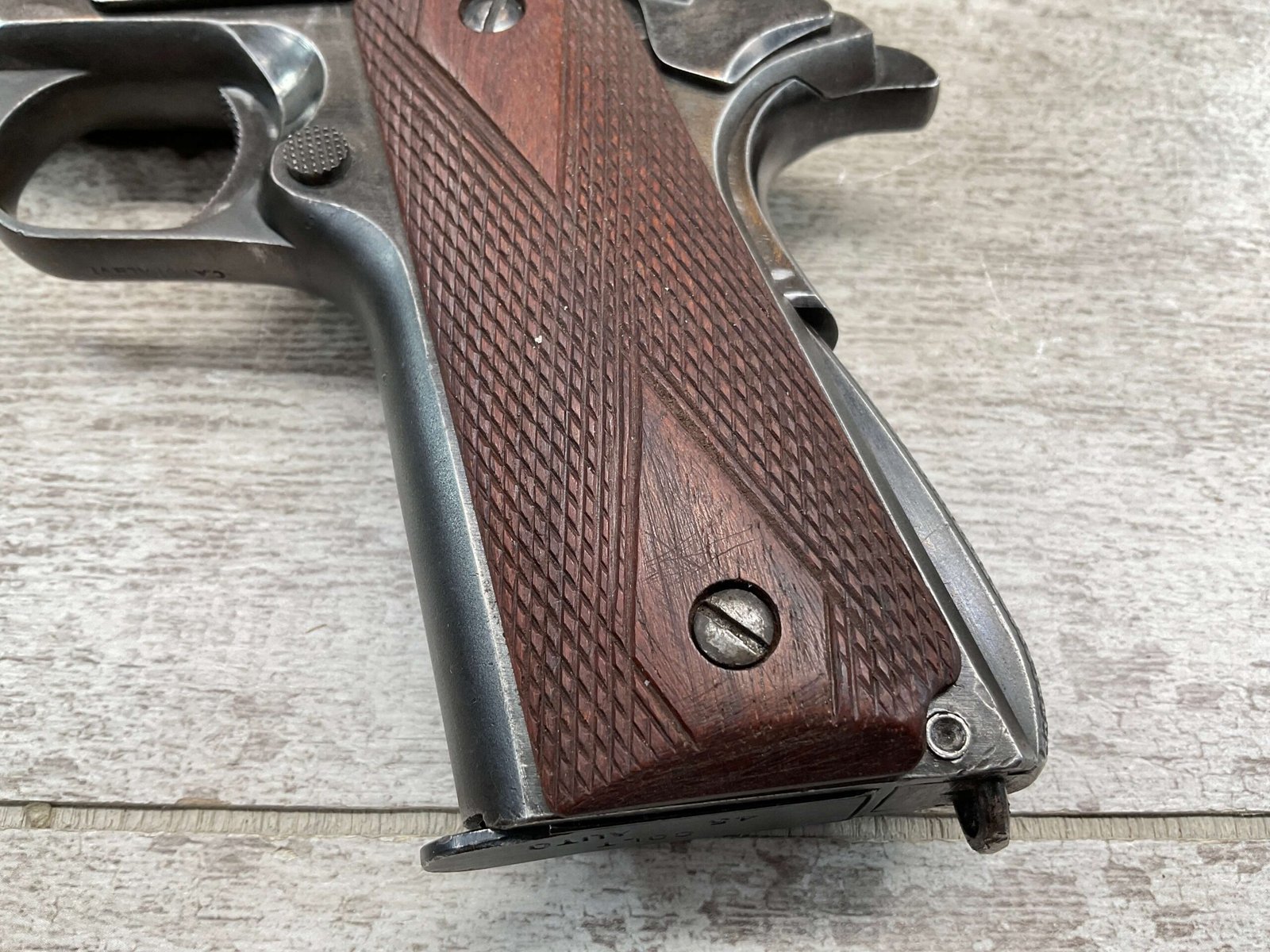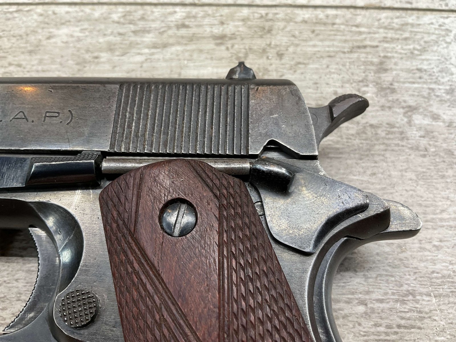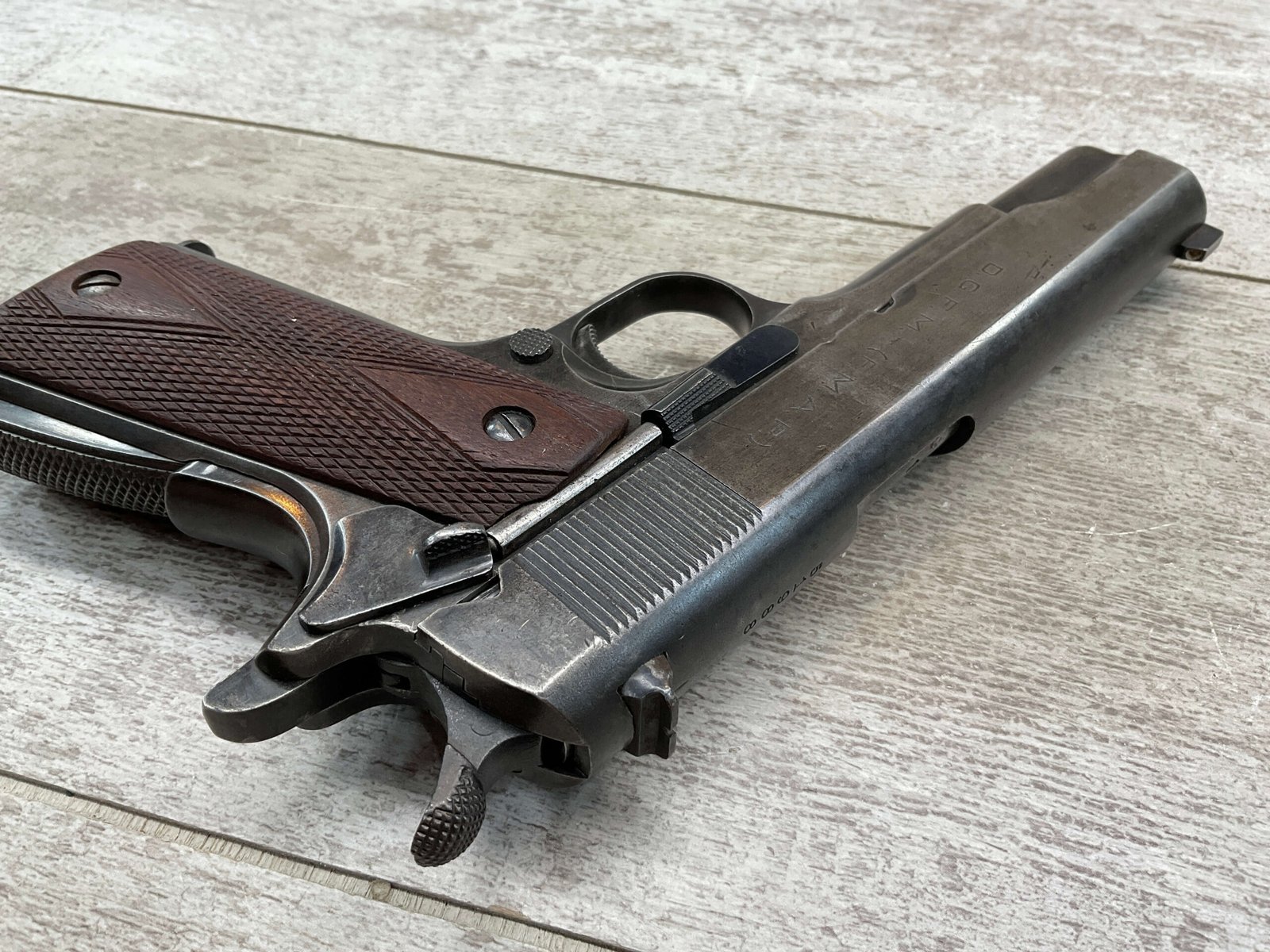 The D.G.F.M Model 1927 was produced at the Argentine arsenal Fábrica Militar de Armas Portátiles “Domingo Matheu” in Rosario. It is nearly identical to the Colt M1911A1 but often features slight differences in markings and may have been produced with local materials and craftsmanship.