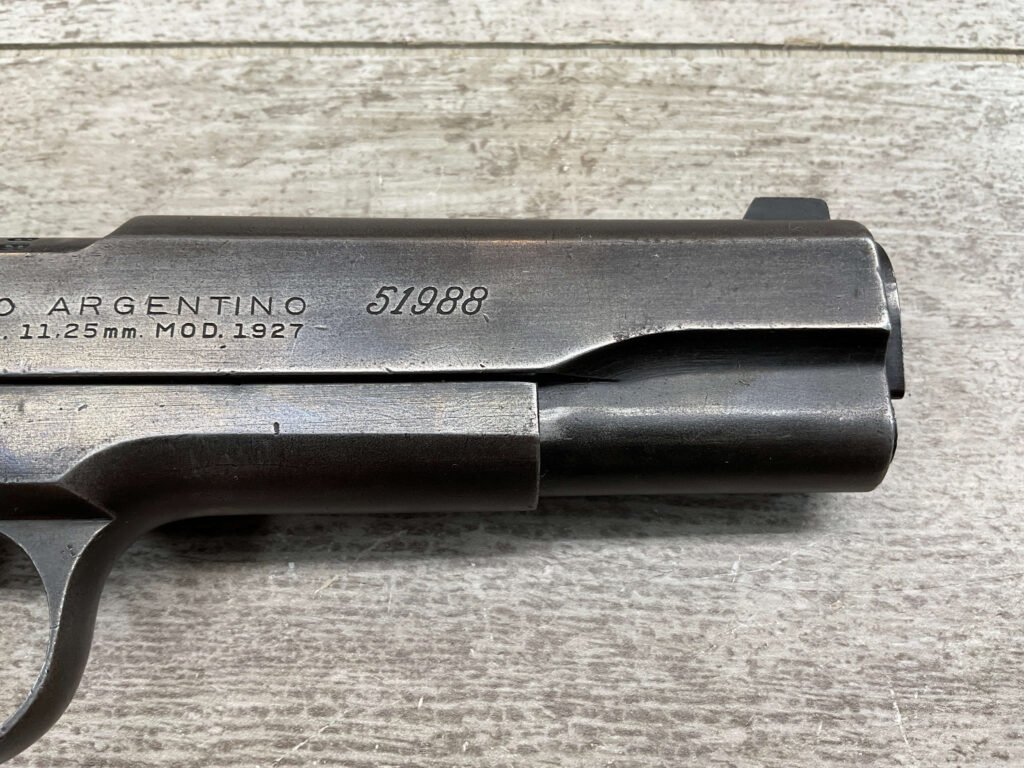 The D.G.F.M Model 1927 refers to the Argentine “Dirección General de Fabricaciones Militares” (Directorate General of Military Manufacturing) Model 1927 pistol. This firearm is a variant of the Colt M1911A1 pistol that was manufactured under license in Argentina.
