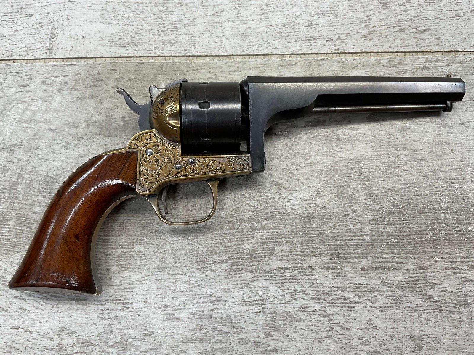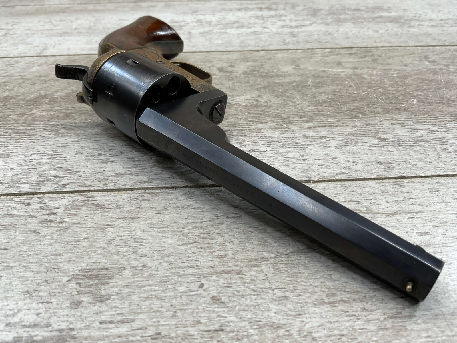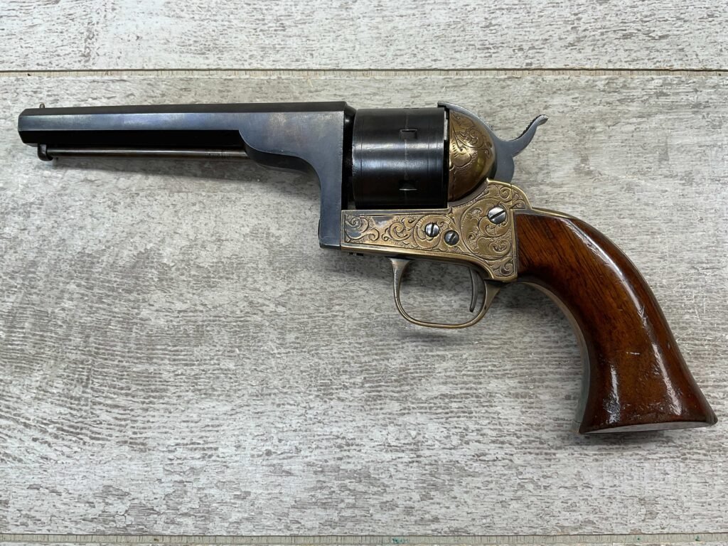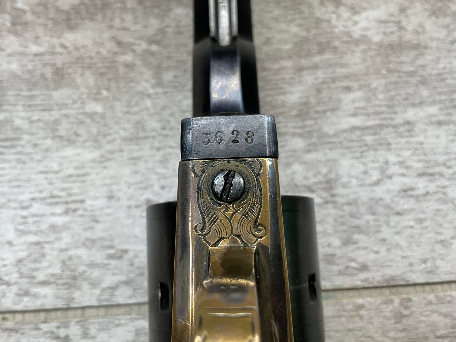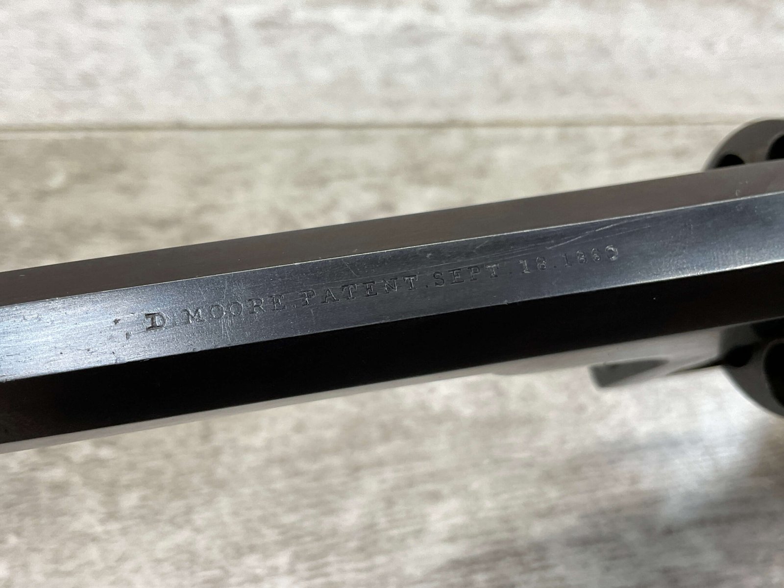 D. MOORE 1860 .32RF SA ENGRAVED BELT REVOLVER, ANTIQUE #3628, EXCELLENT RESTORATION ENGRAVED BRASS FRAMES, “D. MOORE. PATENT. SEPT. 18. 1860″ MARKED OCTAGONÂ 5” BARREL, FULLY FUNCTIONING, 7 ROUND SWING OUT CYLINDER W/ LIGHT DRAG LINE, DARK PITTED BORE W/ FAIR RIFLING, VG-EXC SMOOTH WALNUT GRIPS, NOT A REPRODUCTION, OVERALL CONDITION AS SEEN IN PHOTOS.