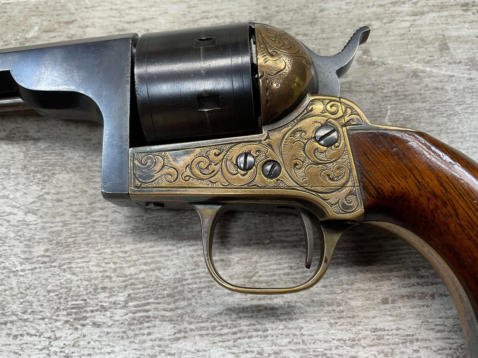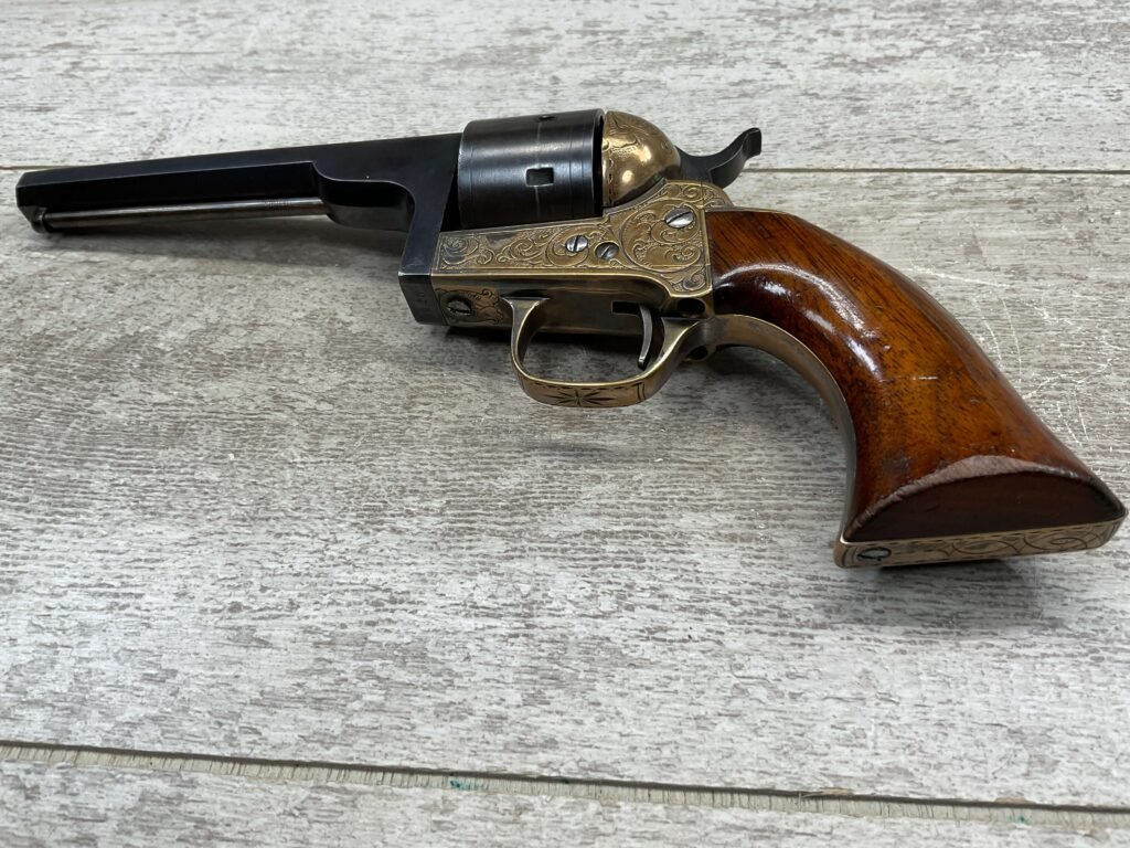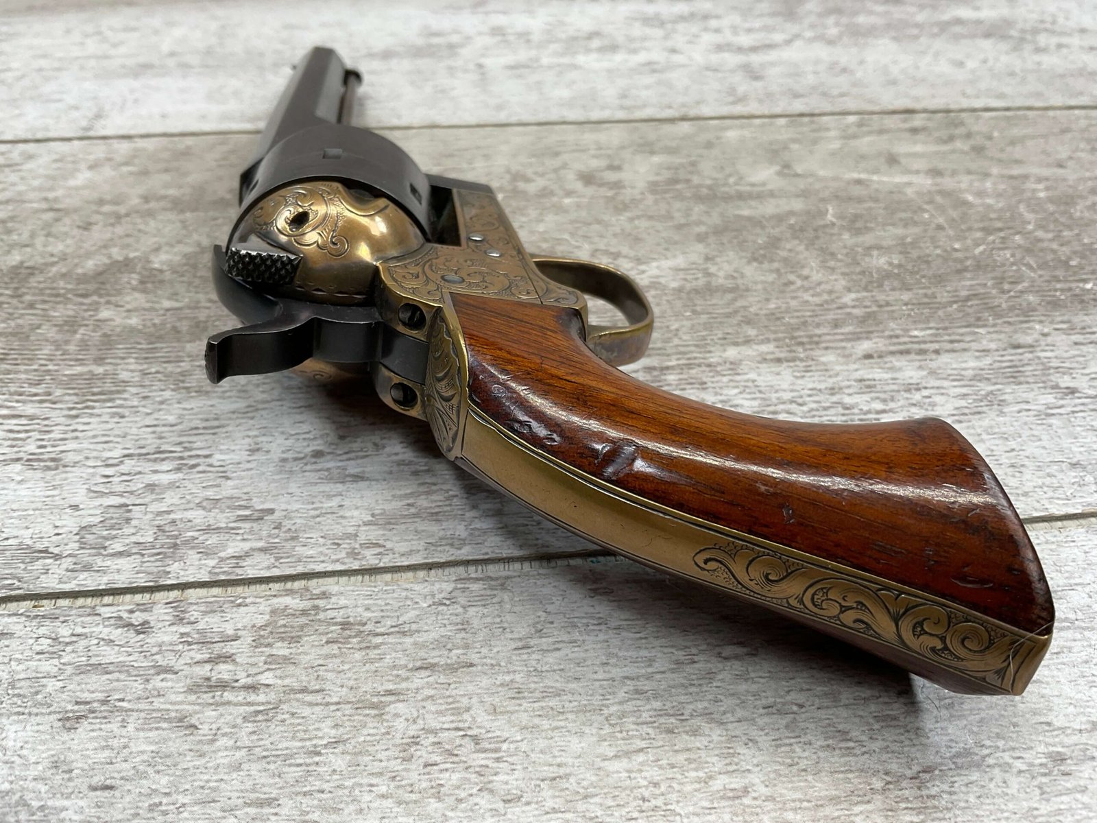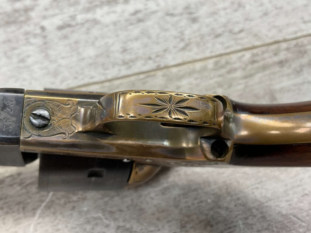D. MOORE 1860 .32RF SA ENGRAVED BELT REVOLVER, ANTIQUE #3628, EXCELLENT RESTORATION ENGRAVED BRASS FRAMES, “D. MOORE. PATENT. SEPT. 18. 1860″ MARKED OCTAGONÂ 5” BARREL, FULLY FUNCTIONING, 7 ROUND SWING OUT CYLINDER W/ LIGHT DRAG LINE, DARK PITTED BORE W/ FAIR RIFLING, VG-EXC SMOOTH WALNUT GRIPS, NOT A REPRODUCTION, OVERALL CONDITION AS SEEN IN PHOTOS.