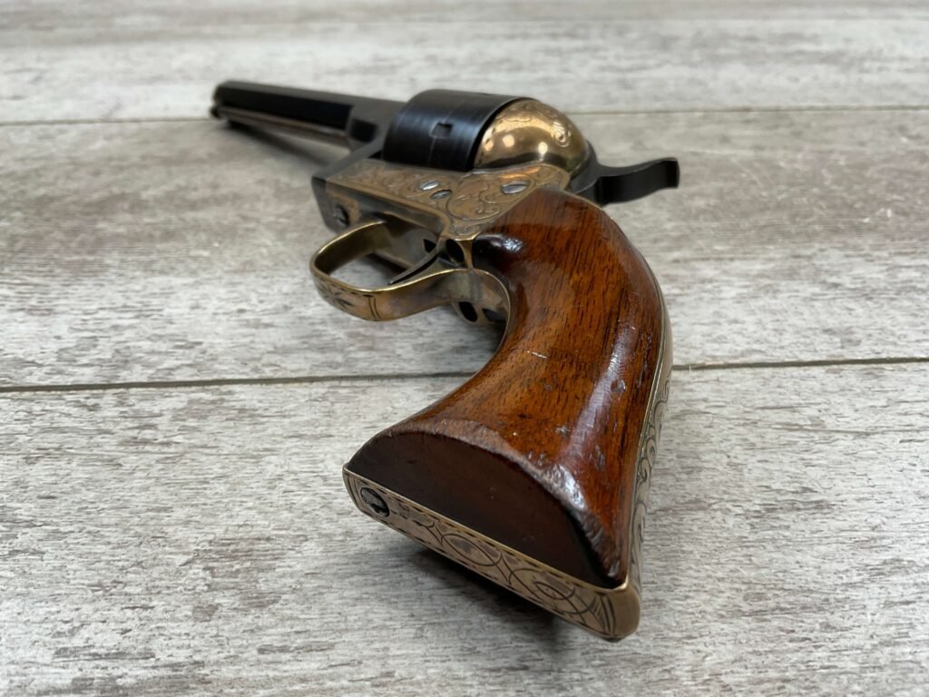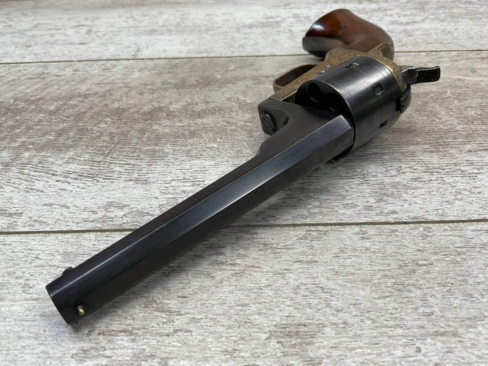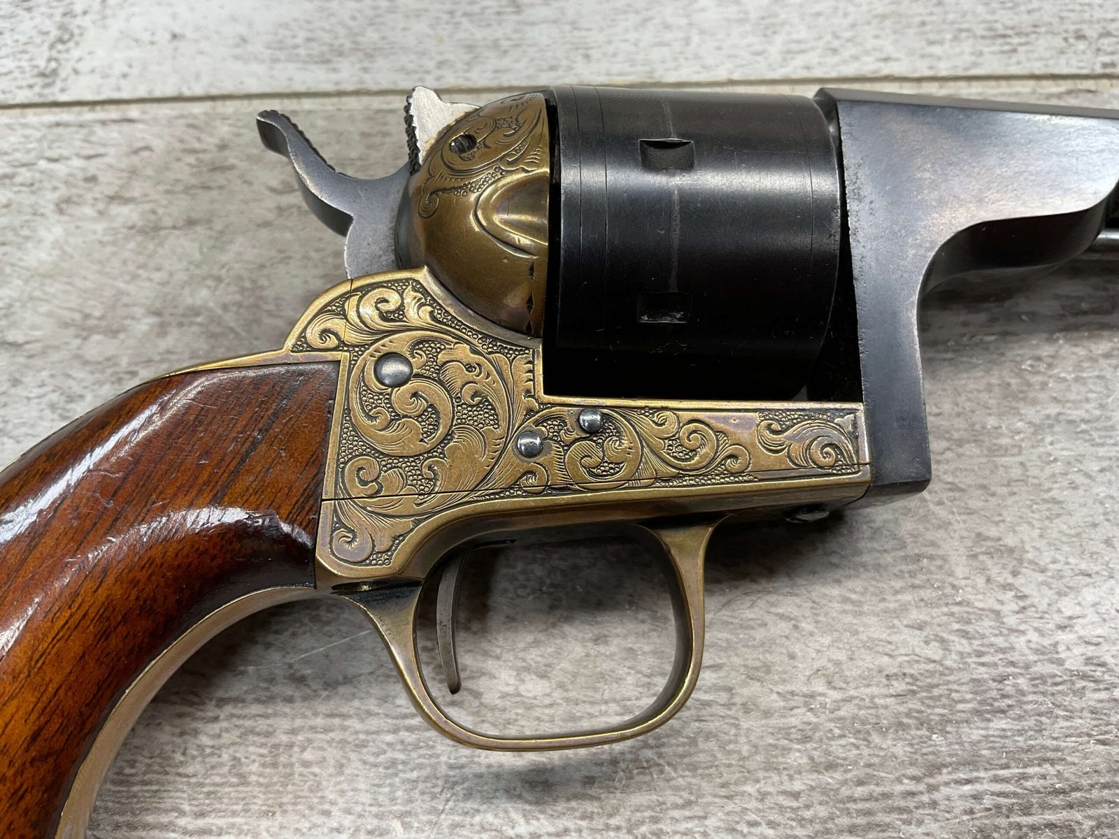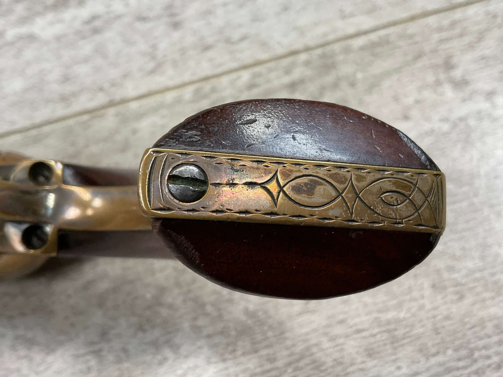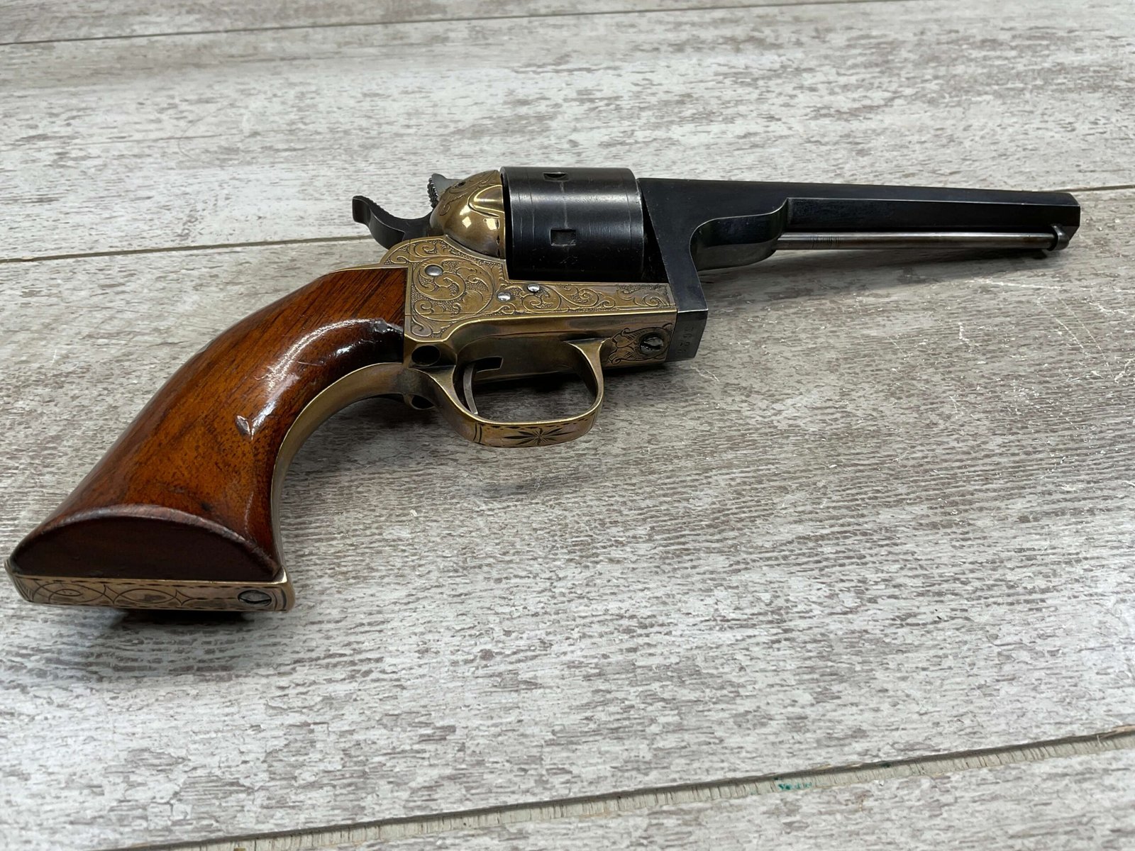 D. MOORE 1860 .32RF SA ENGRAVED BELT REVOLVER, ANTIQUE #3628, EXCELLENT RESTORATION ENGRAVED BRASS FRAMES, “D. MOORE. PATENT. SEPT. 18. 1860″ MARKED OCTAGONÂ 5” BARREL, FULLY FUNCTIONING, 7 ROUND SWING OUT CYLINDER W/ LIGHT DRAG LINE, DARK PITTED BORE W/ FAIR RIFLING, VG-EXC SMOOTH WALNUT GRIPS, NOT A REPRODUCTION, OVERALL CONDITION AS SEEN IN PHOTOS.