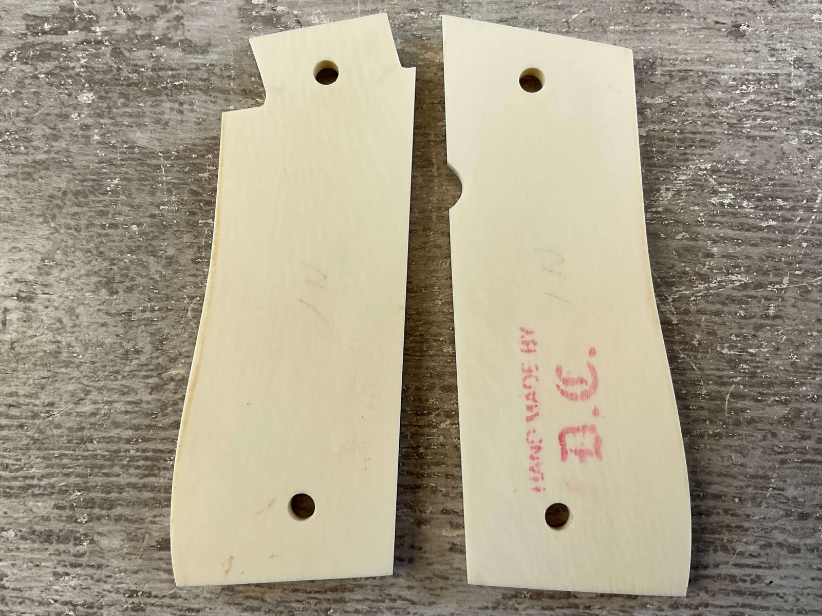 DAN CHESIAK HANDMADE 1911 COMPACT/OFFICER REAL IVORY GRIPS, JAMES EARL JONES COLLECTION, REAL-IVORY GRIPS (BLACK LIGHT TESTED), BACK OF RIGHT GRIP MARKED “HAND MADE BY D.C.”, TOPS & BOTTOMS OF GRIPS HAVE THE IVORY “CROSSHATCHING” NORMALLY PRESENT ON REAL IVORY GRIPS. THESE ARE BEAUTIFUL, RARE GRIPS NOW HARD TO FIND AFTER THE ARTIST’S (DAN’S) PASSING!
