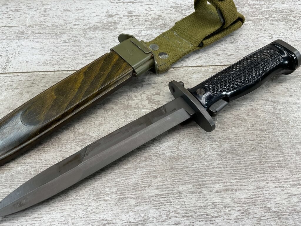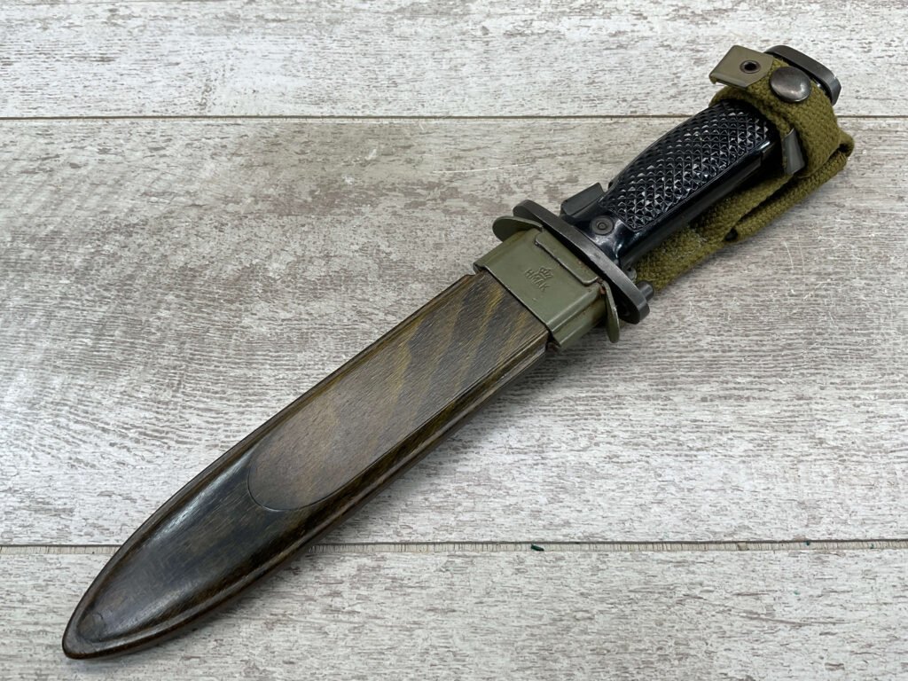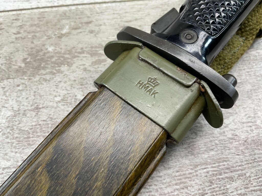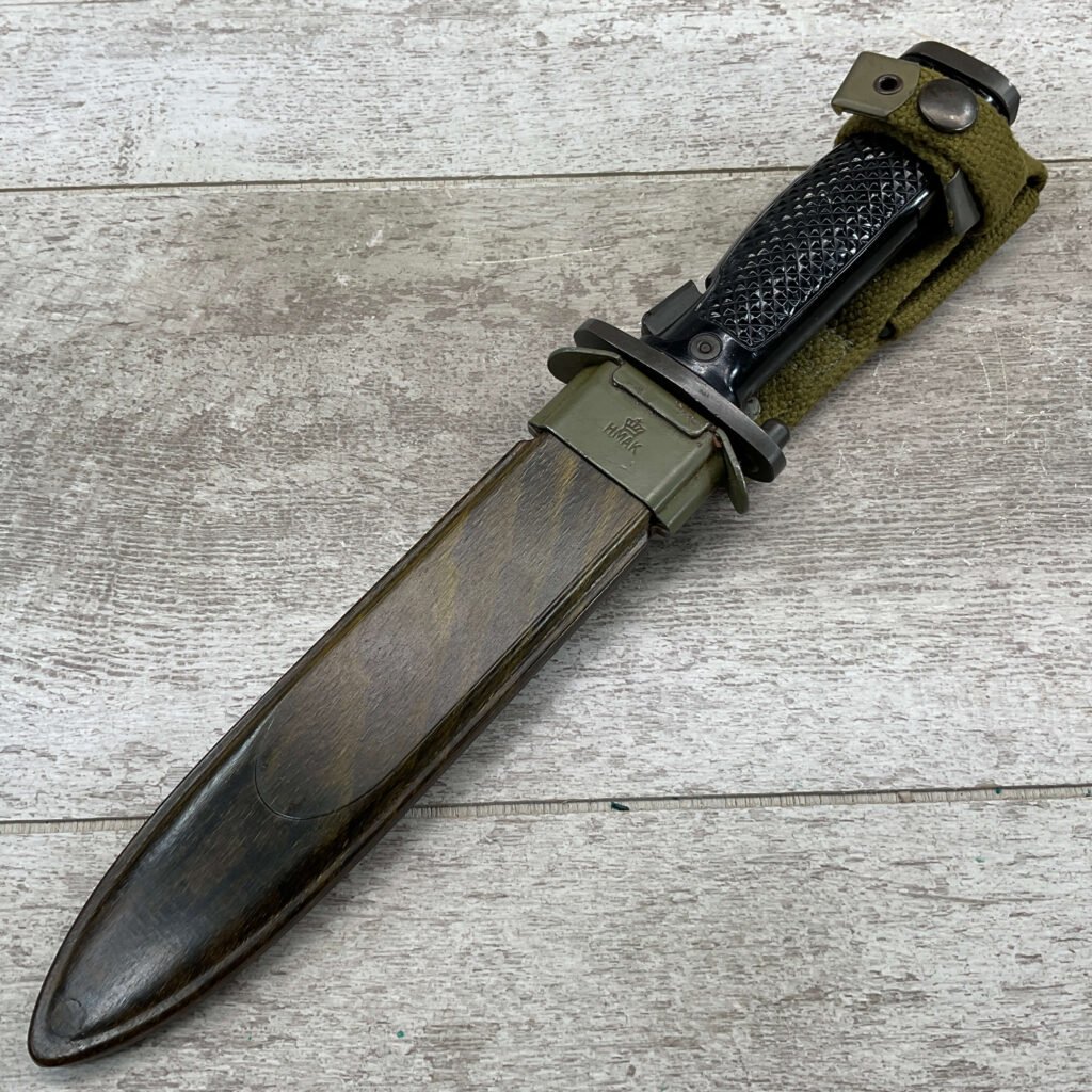 DANISH M1962-HTK M/62 BAYONET W/ SHEATH FOR M1 GARAND, COPY OF M5A1 BAYONET, MADE BY E&F HORSTER, MARKED WITH “HTKM/62 WITH CROWN, HAERENS TEKNISKE KORPS (ARMY TECHNICAL CORPS) MFR BETWEEN 1960 AND 1969, W/ MATCHING SHEATH, EXC CONDITION.