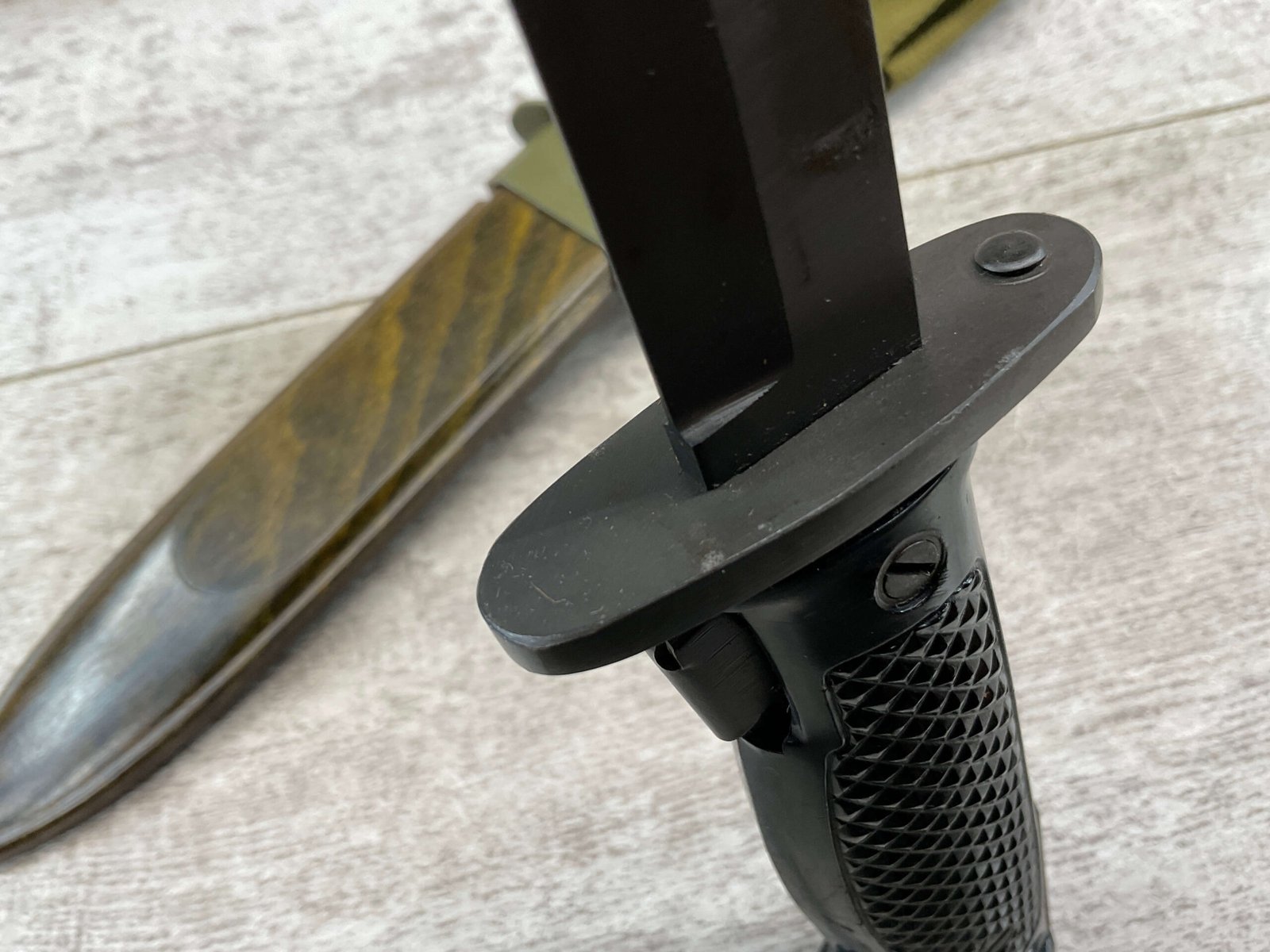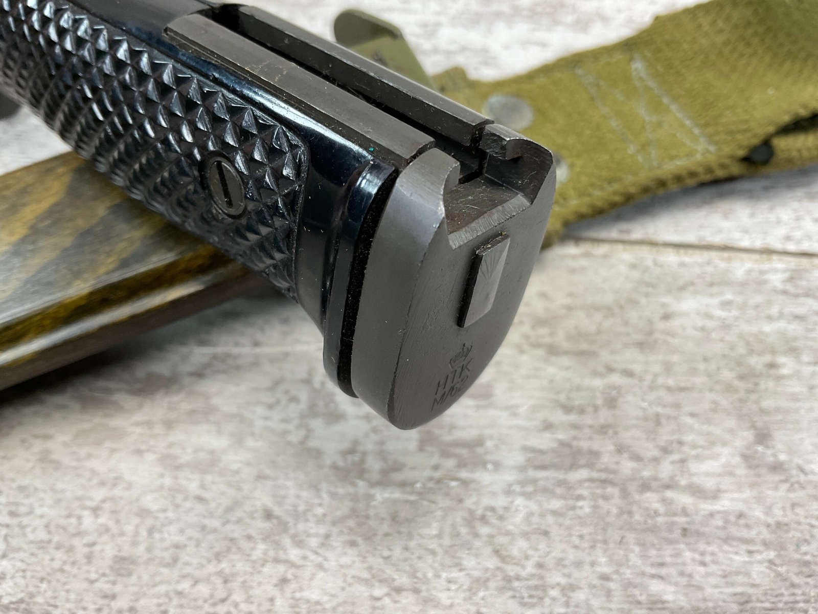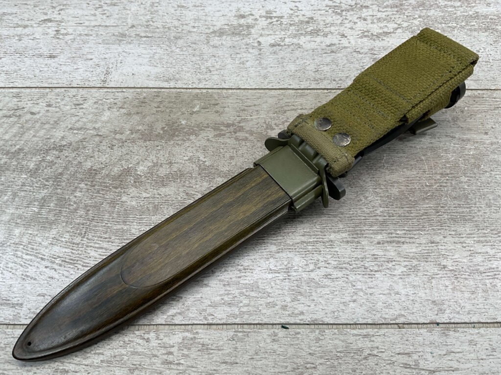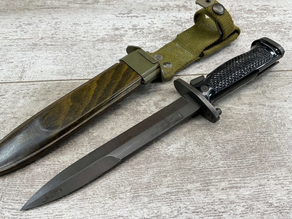 DANISH M1962-HTK M/62 BAYONET W/ SHEATH FOR M1 GARAND, COPY OF M5A1 BAYONET, MADE BY E&F HORSTER, MARKED WITH “HTKM/62 WITH CROWN, HAERENS TEKNISKE KORPS (ARMY TECHNICAL CORPS) MFR BETWEEN 1960 AND 1969, W/ MATCHING SHEATH, EXC CONDITION.