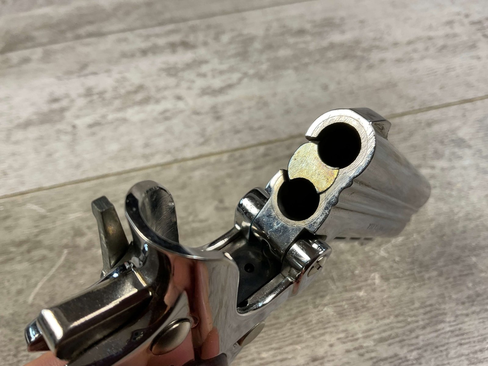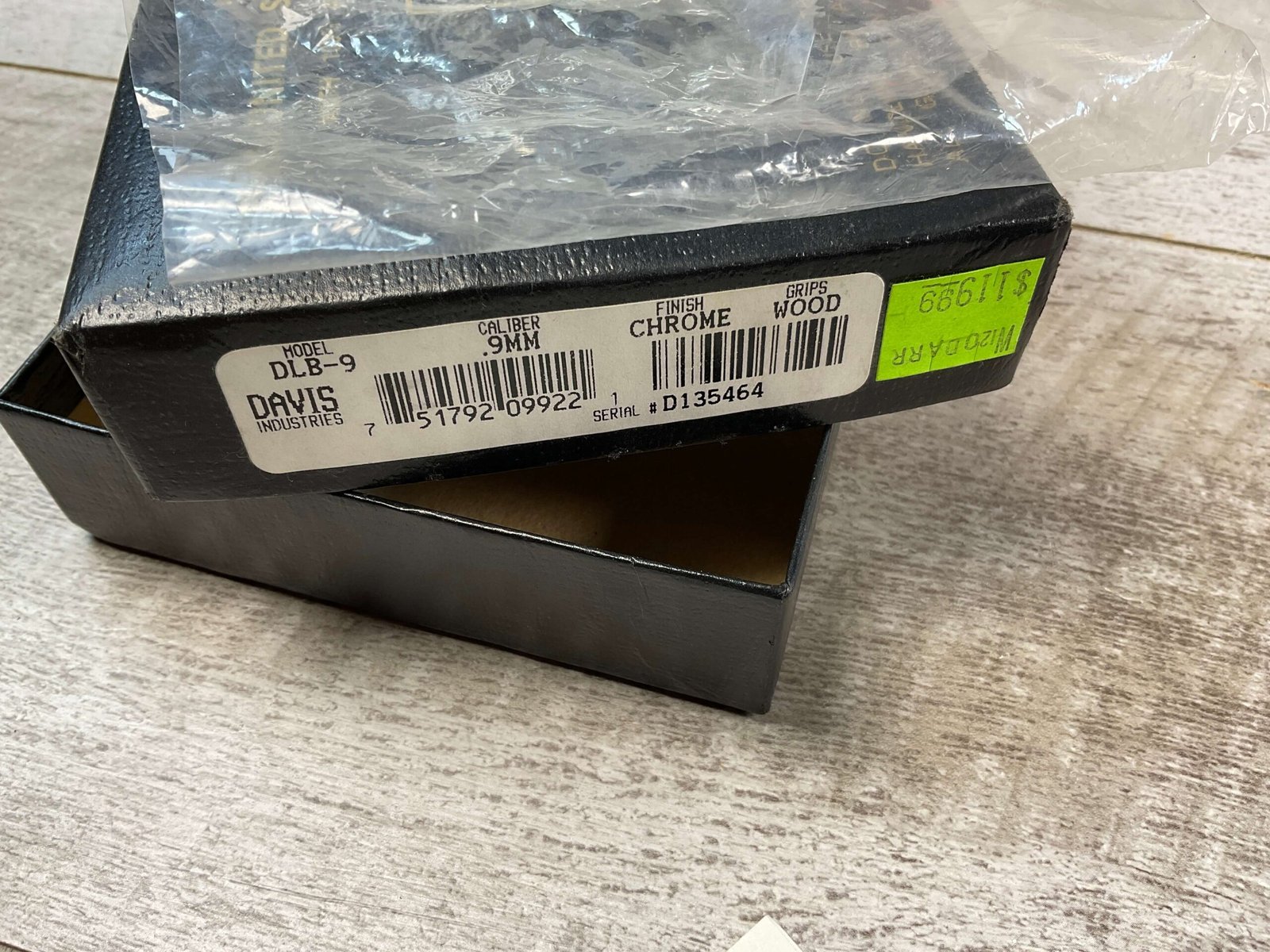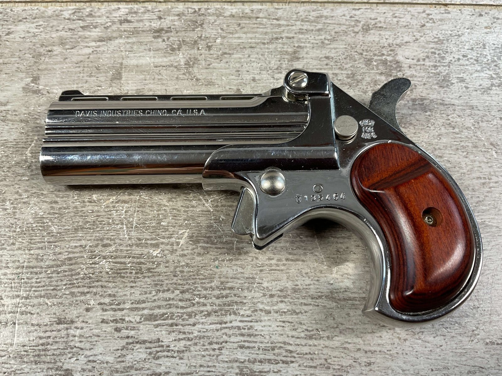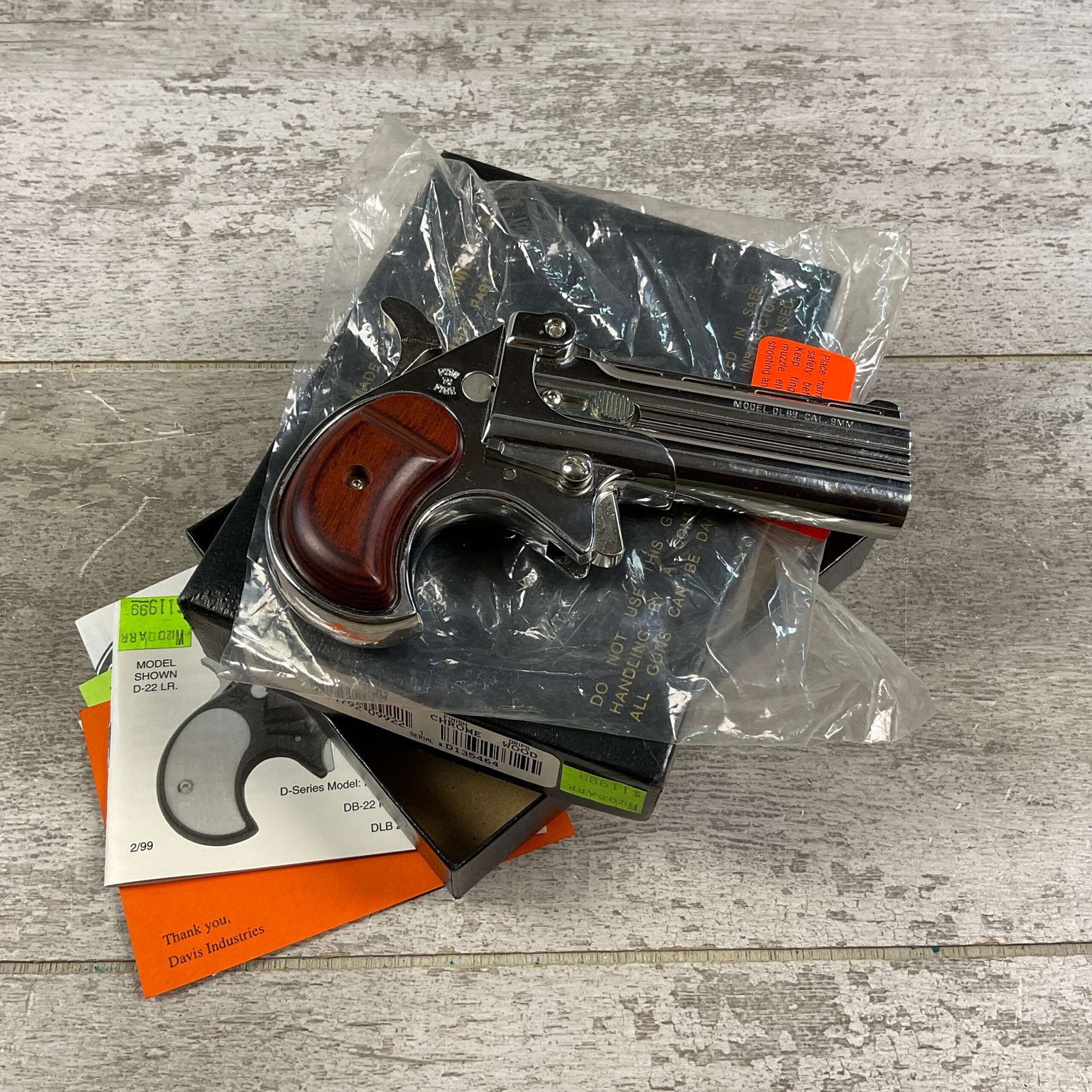 DAVIS INDUSTRIES DLB-9 CHROME 9MM DERINGER PISTOL #D135464, EXC CHROME FINISH, EXC ROSEWOOD GRIPS, LIKE NEW, EXC BORE & RIFLING, IN ORIGINAL BOX, MANUAL EJECTOR, 98%+ OVEDRALL, CONDITION AS SHOWN IN PICTURES