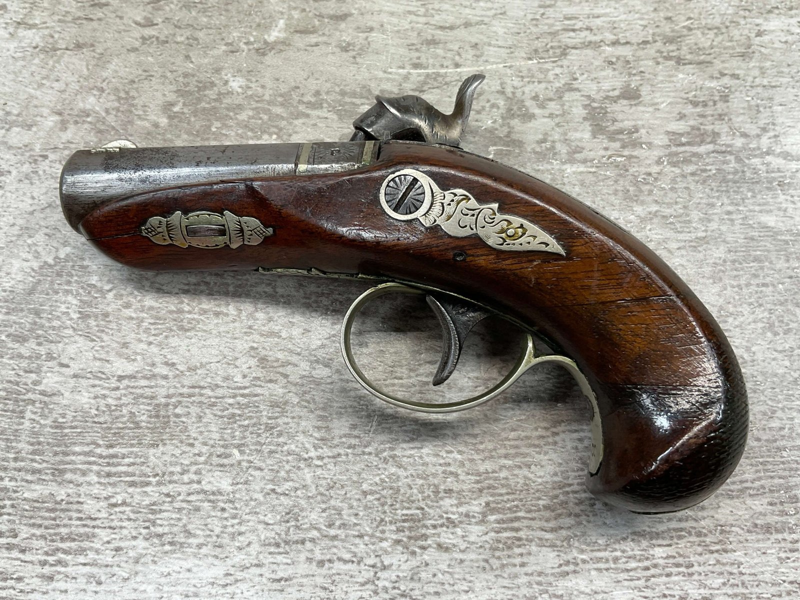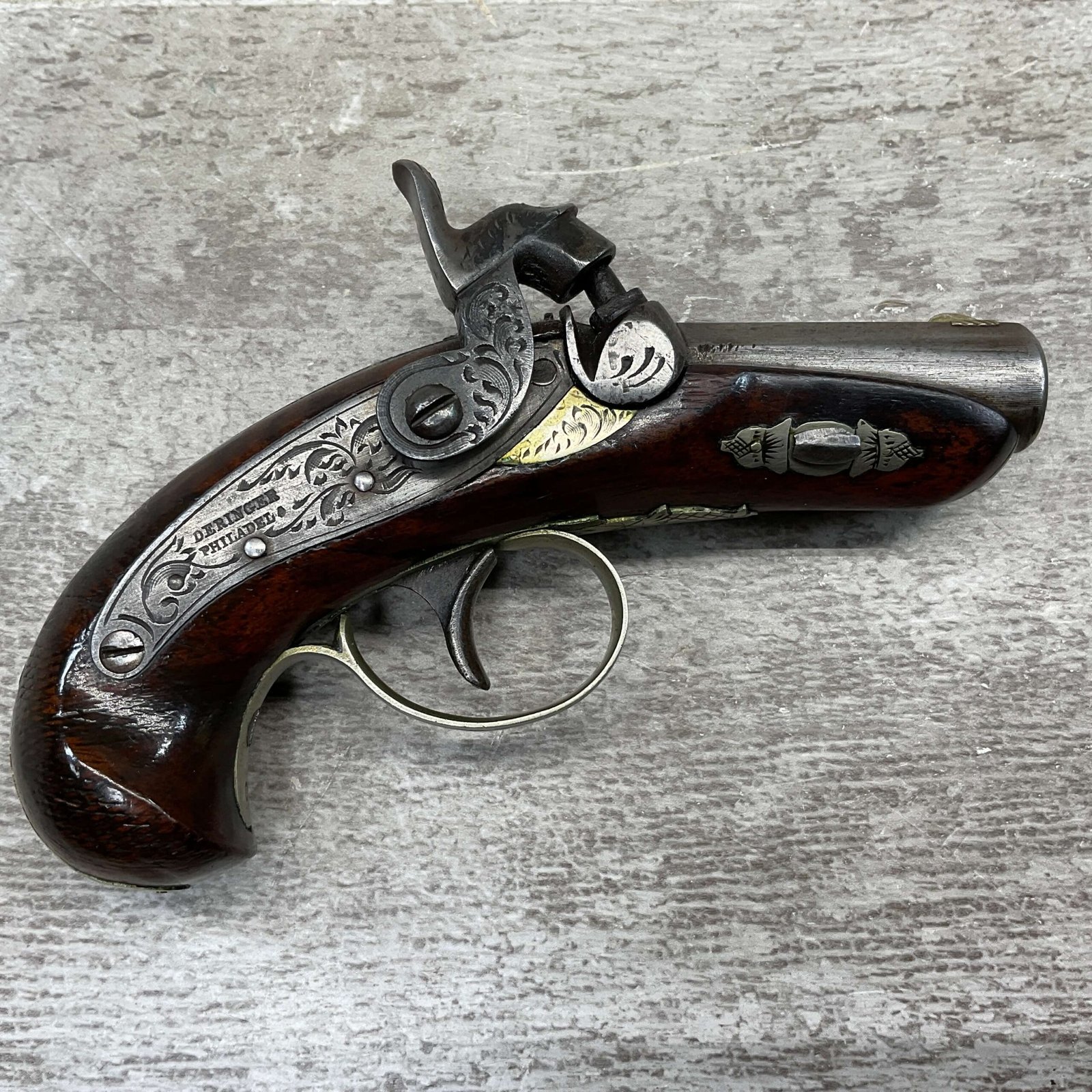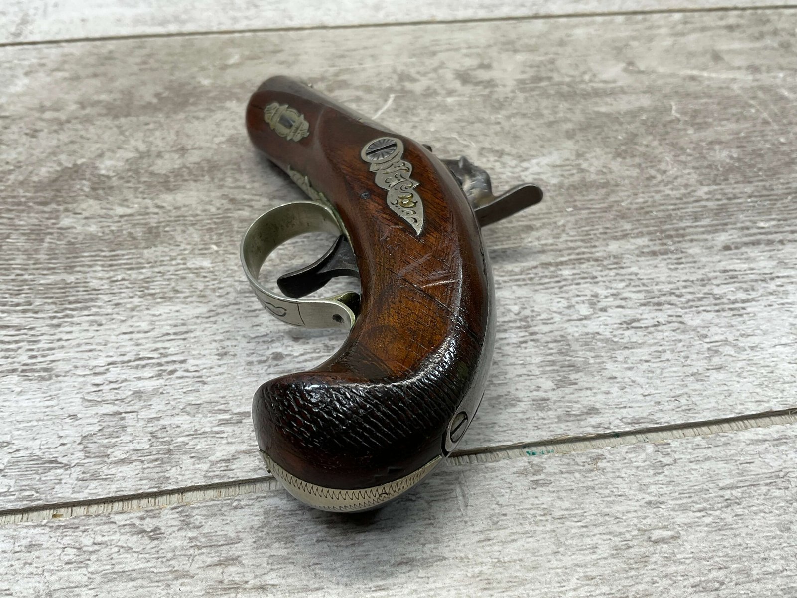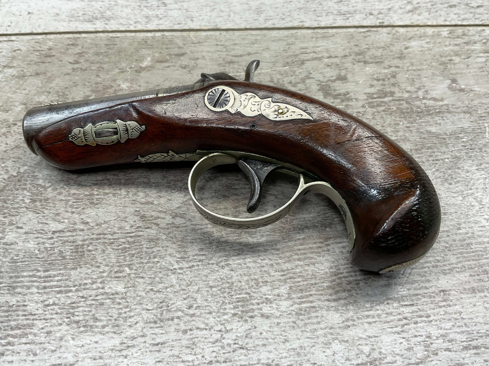 DERINGER PHILADELPHIA .40CAL PERCUSSION PISTOL, ANTIQUE #NSN, 1 3/4″ BBL, INLAID BANDS ON BOLSTER,ALTERED LOST SHIELD & ADDED BAND BACK STRAP (VERY OLD REPAIR), ANTIQUE/BLACK POWDER-NO FFL NEEDED, WILL SHIP DIRECTLY TO YOUR HOME, NOT A REPRODUCTION, OVERALL CONDITION AS SEEN IN PHOTOS!!
