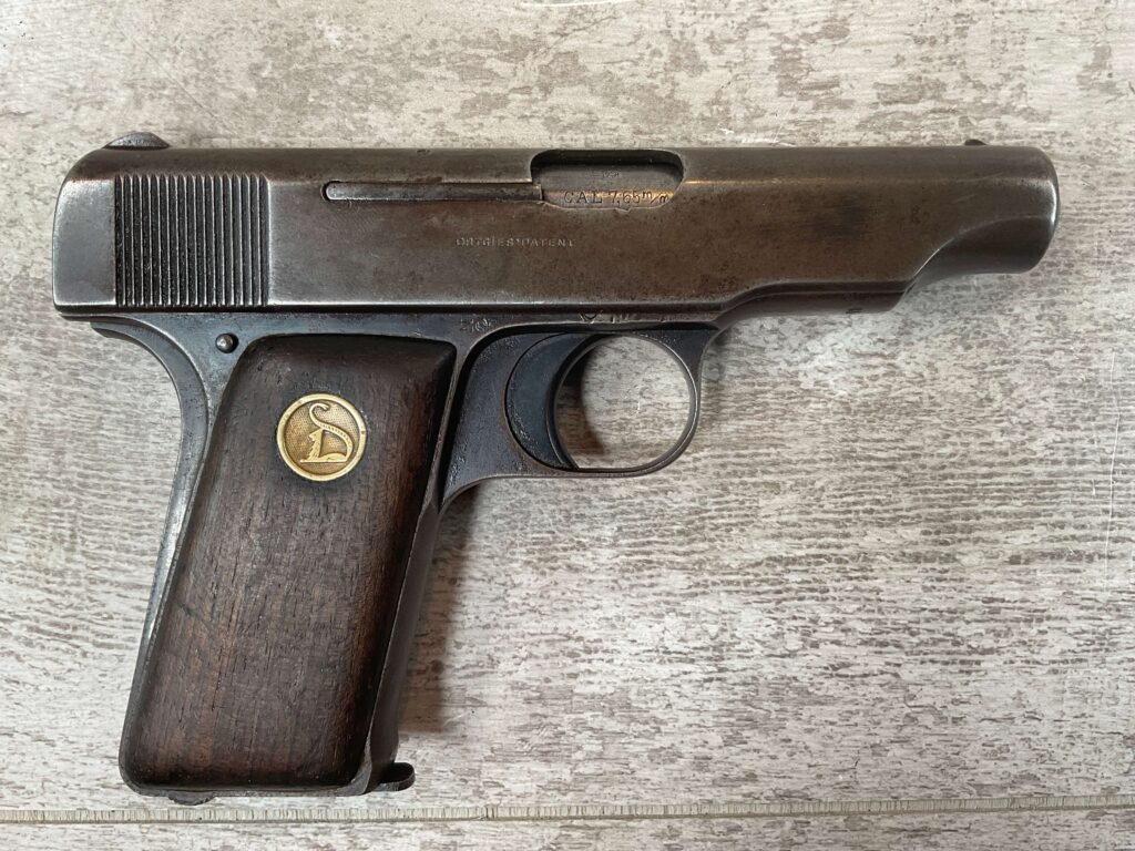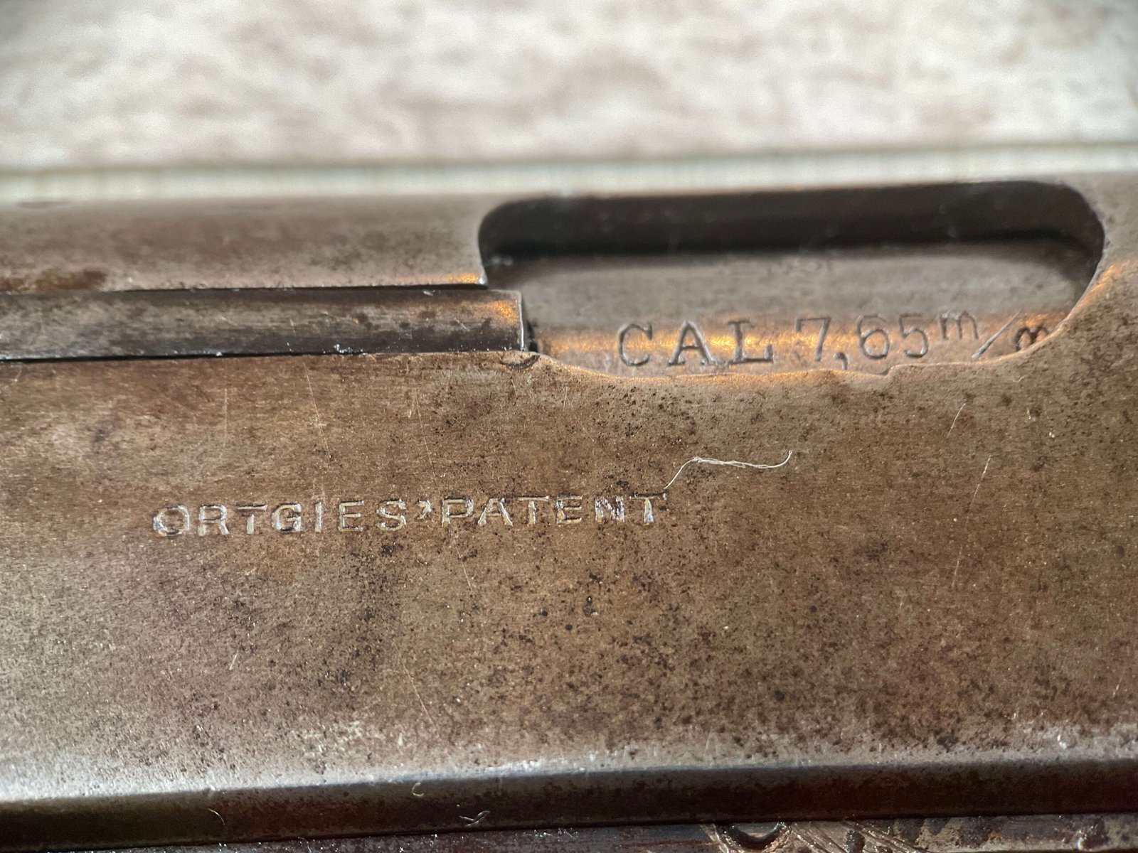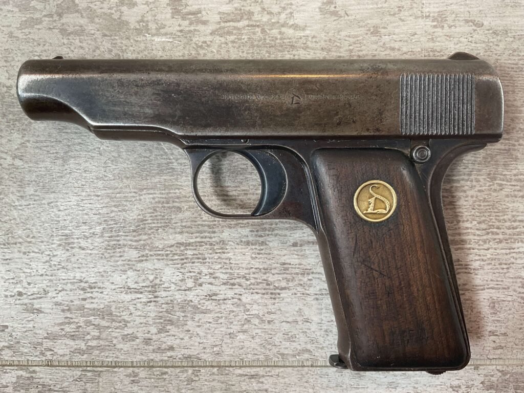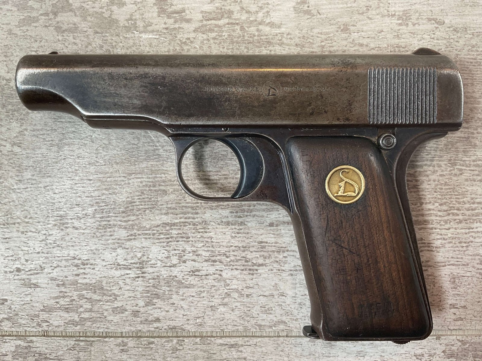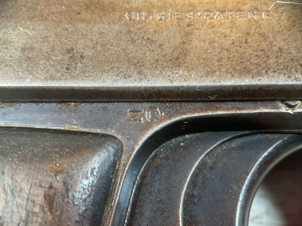 DEUTSCHE WERKE ORTGIE’S 7.65MM PISTOL #85686 3.4″ BBL, 7 ROUNDS, MATCHING W/ORIGINAL FINISH WHICH IS TURNING BROWN PETINA, EXC SMOOTH WALNUT GRIPS, GRIP SAFETY, “MADE IN GERMANY” STAMPED ON LEFT GRIPS, CROWN/N STAMPED, “DEUTSCHE WERK – WERK ERFURT” ON LEFT SIDE OF SLIDE, “ORTGIES’PATENT” ON RIGHT SIDE OF SLIDE, NO MARKINGS ON MAGAZINE, 1 MAGAZINE, PRODUCED FROM 1919-1924, VG OVERALL CONDITION