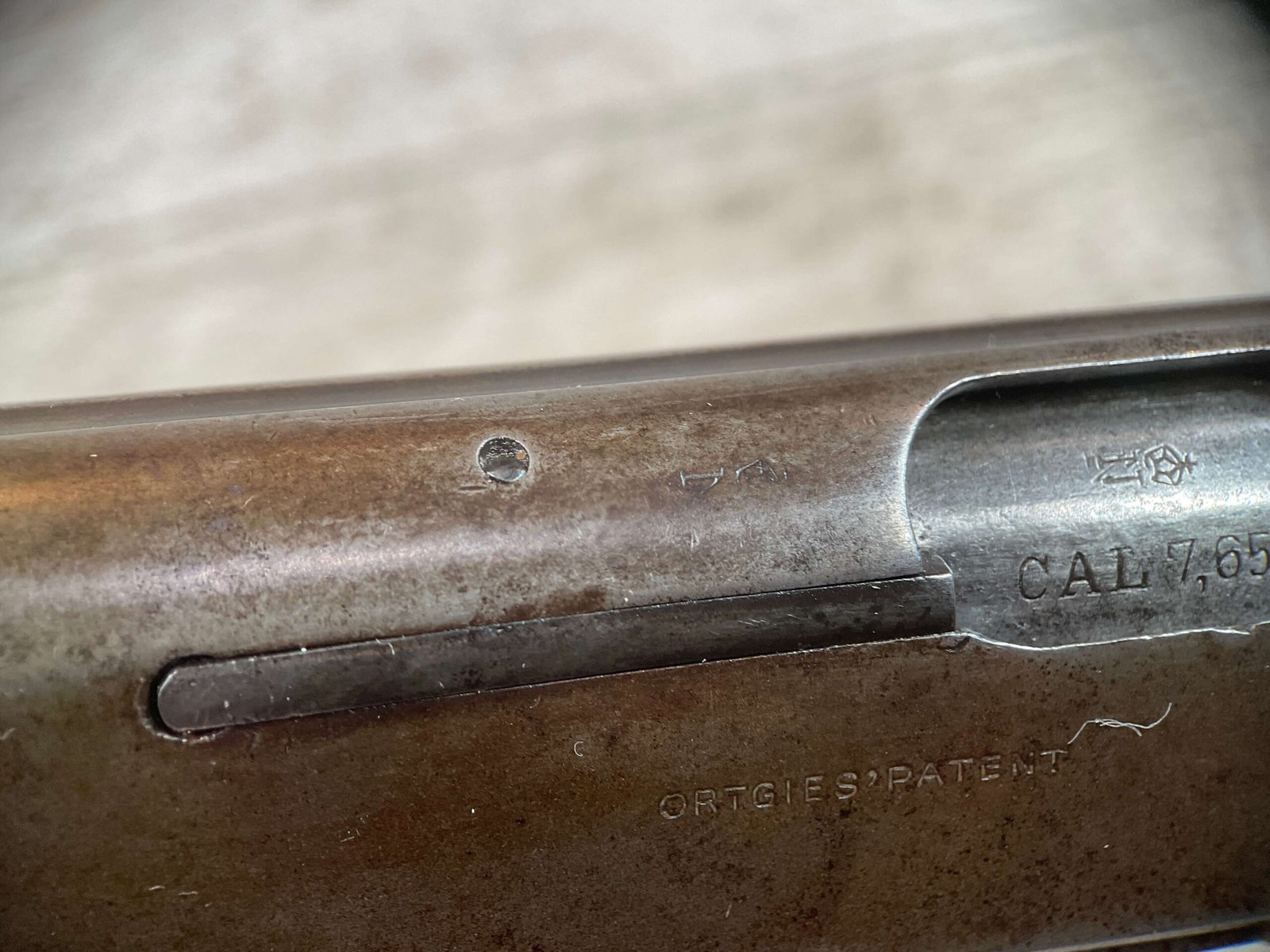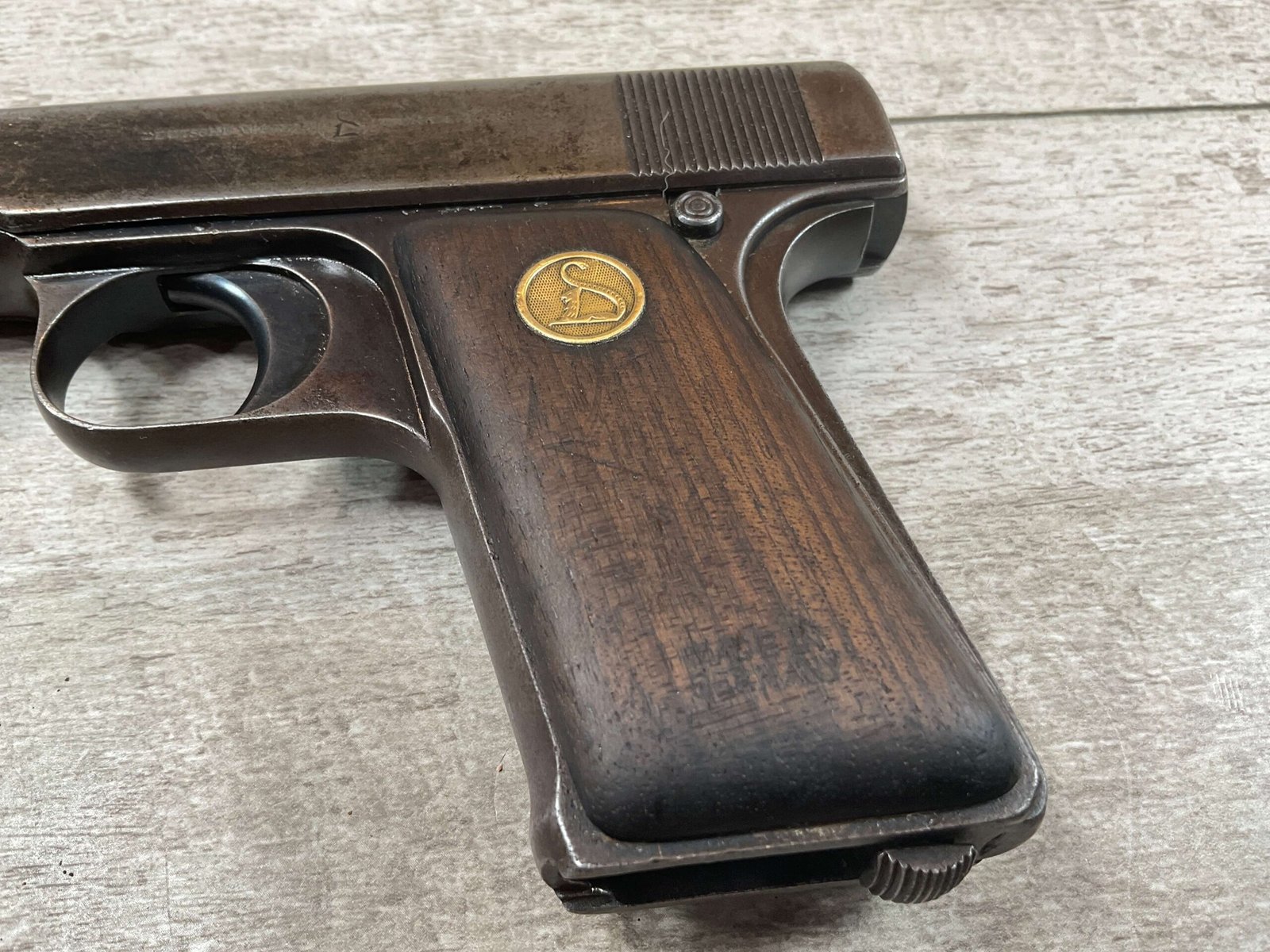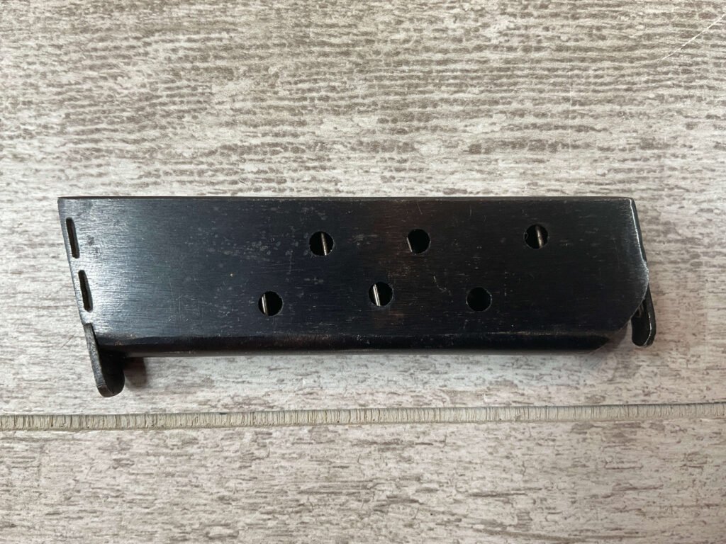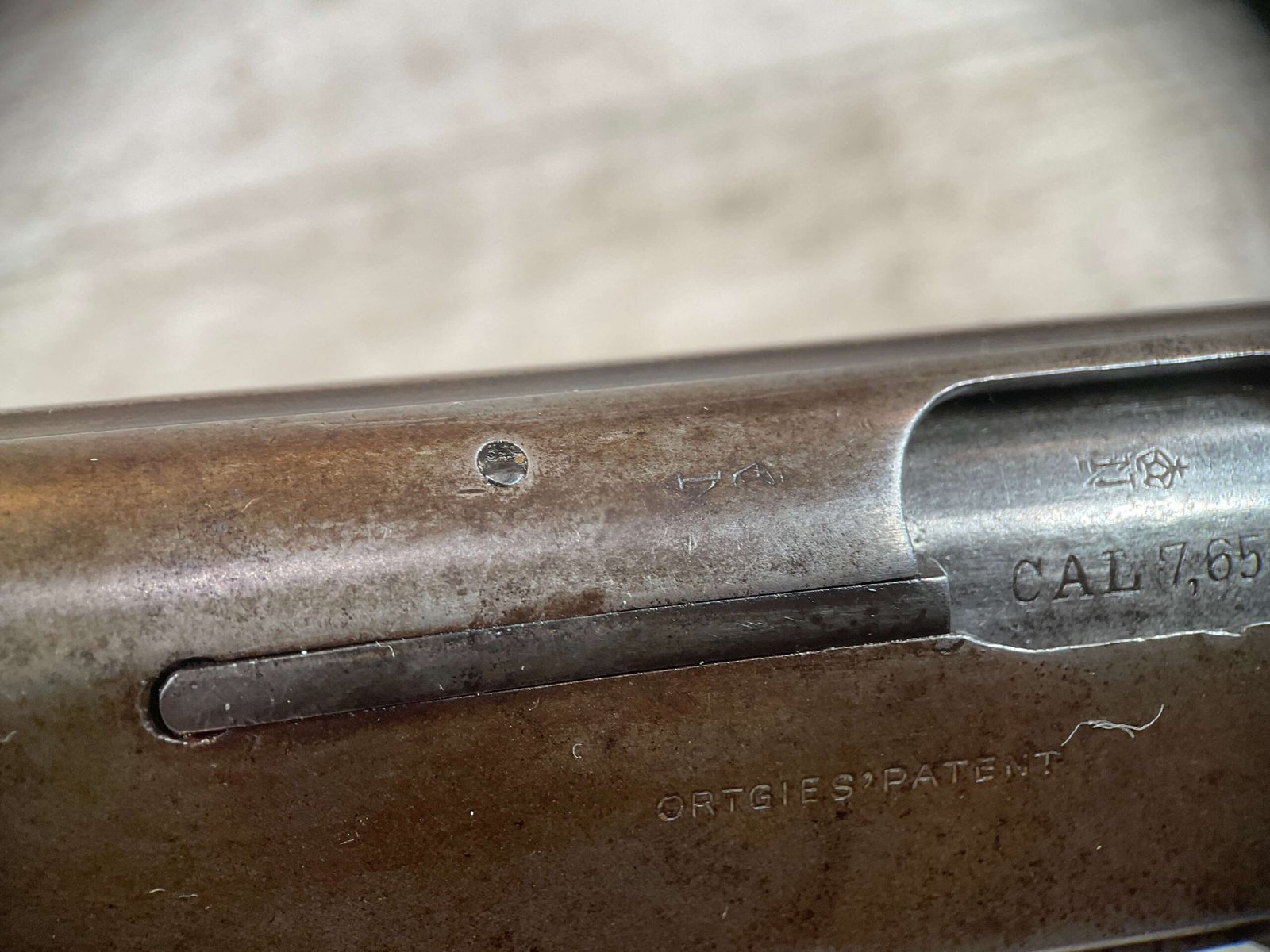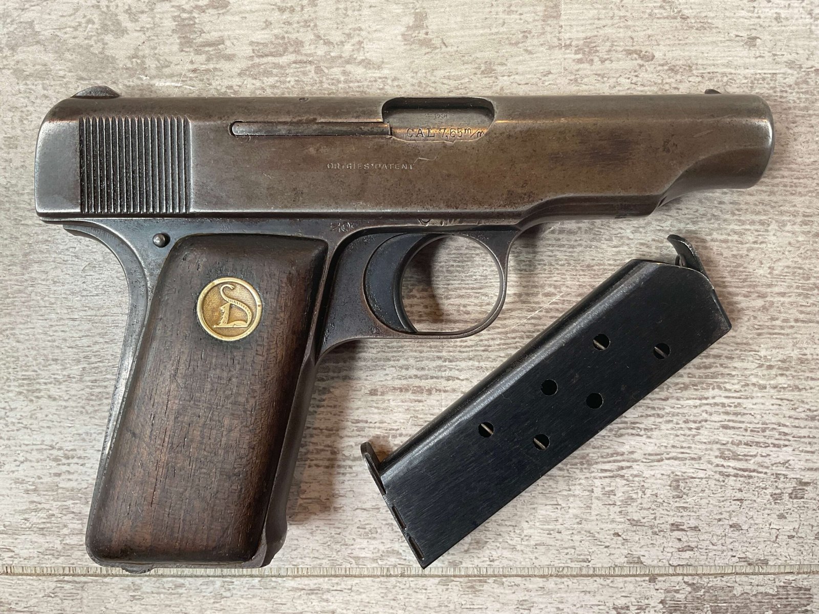 DEUTSCHE WERKE ORTGIE’S 7.65MM PISTOL #85686 3.4″ BBL, 7 ROUNDS, MATCHING W/ORIGINAL FINISH WHICH IS TURNING BROWN PETINA, EXC SMOOTH WALNUT GRIPS, GRIP SAFETY, “MADE IN GERMANY” STAMPED ON LEFT GRIPS, CROWN/N STAMPED, “DEUTSCHE WERK – WERK ERFURT” ON LEFT SIDE OF SLIDE, “ORTGIES’PATENT” ON RIGHT SIDE OF SLIDE, NO MARKINGS ON MAGAZINE, 1 MAGAZINE, PRODUCED FROM 1919-1924, VG OVERALL CONDITION