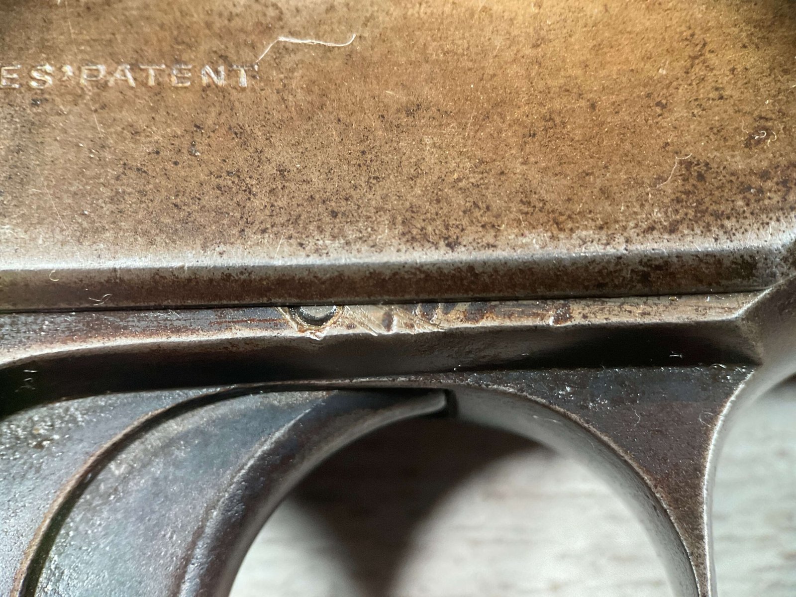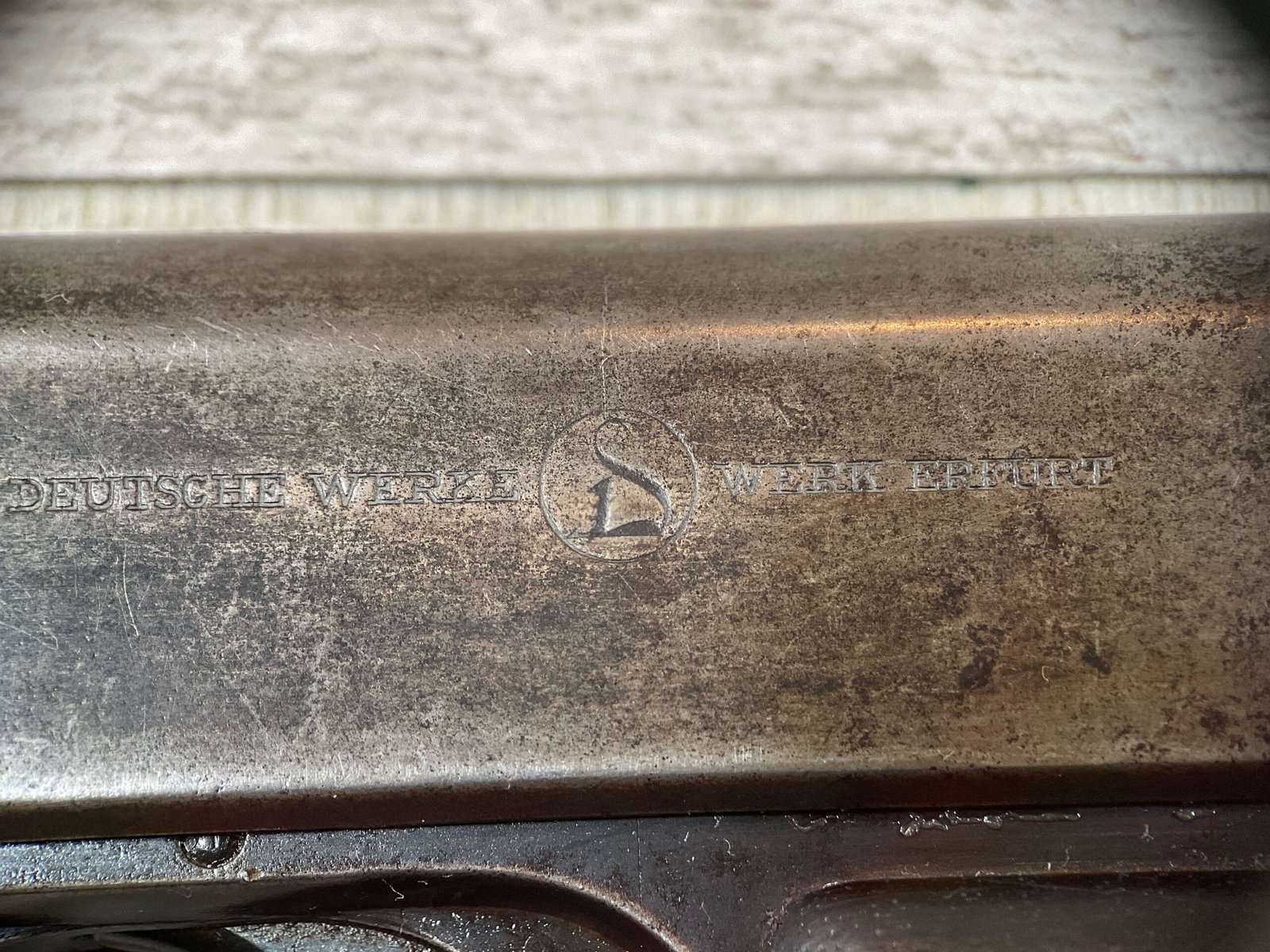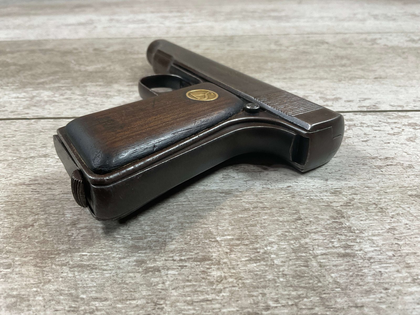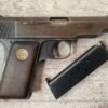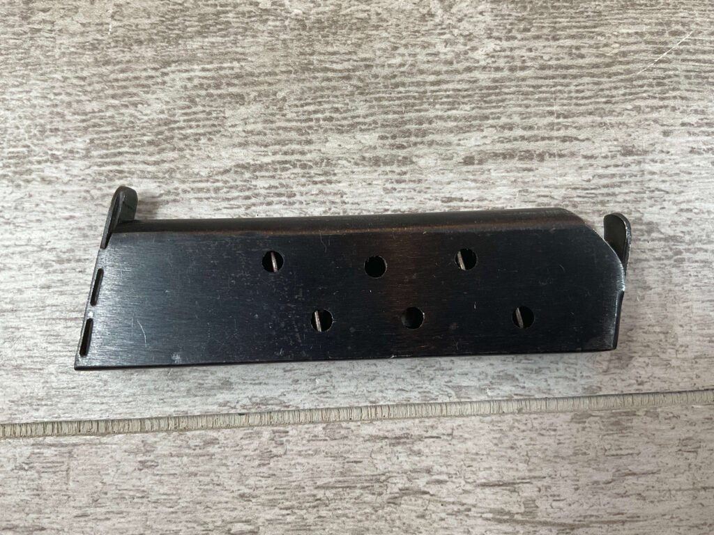 DEUTSCHE WERKE ORTGIE’S 7.65MM PISTOL #85686 3.4″ BBL, 7 ROUNDS, MATCHING W/ORIGINAL FINISH WHICH IS TURNING BROWN PETINA, EXC SMOOTH WALNUT GRIPS, GRIP SAFETY, “MADE IN GERMANY” STAMPED ON LEFT GRIPS, CROWN/N STAMPED, “DEUTSCHE WERK – WERK ERFURT” ON LEFT SIDE OF SLIDE, “ORTGIES’PATENT” ON RIGHT SIDE OF SLIDE, NO MARKINGS ON MAGAZINE, 1 MAGAZINE, PRODUCED FROM 1919-1924, VG OVERALL CONDITION