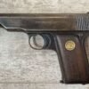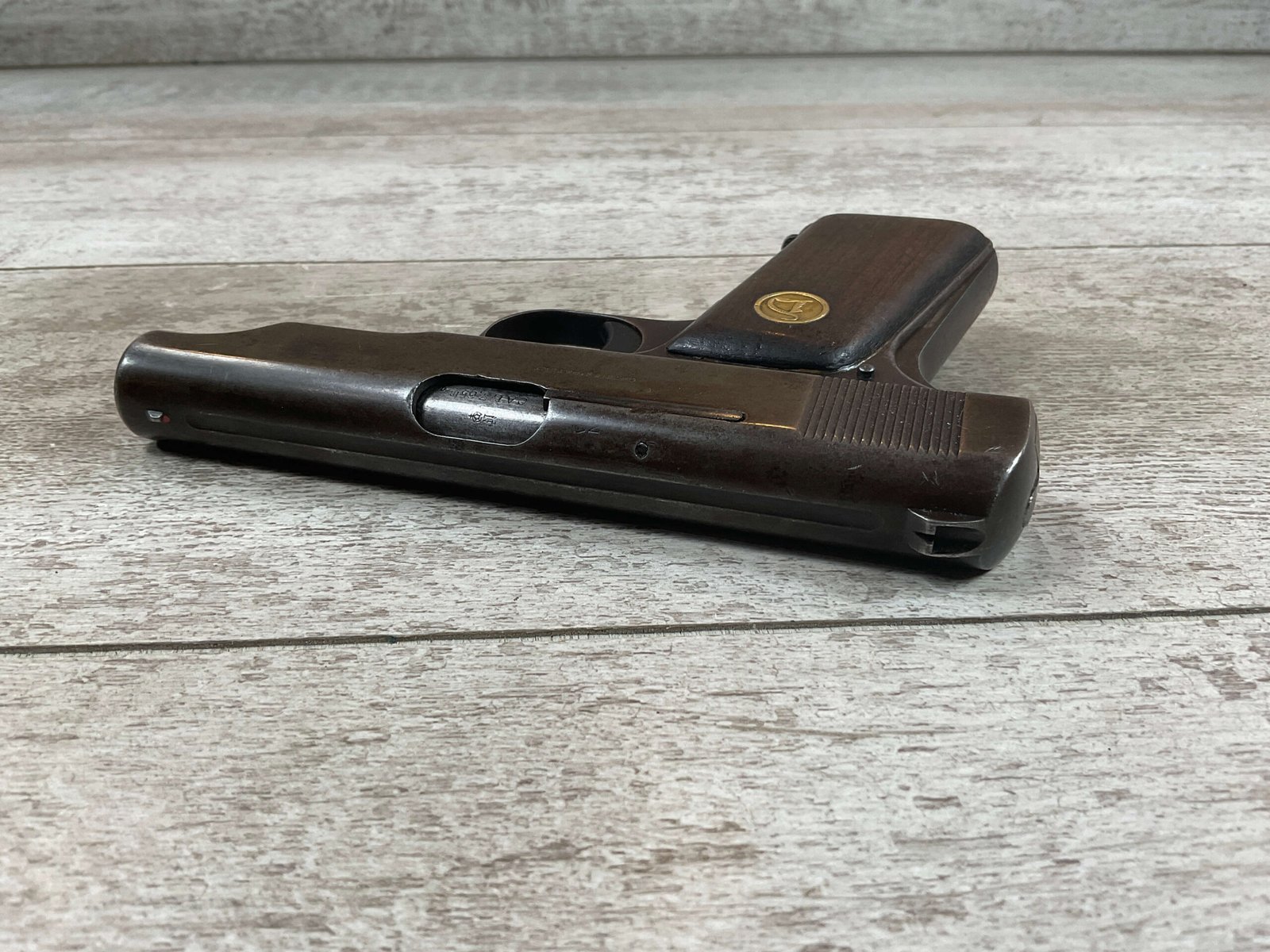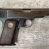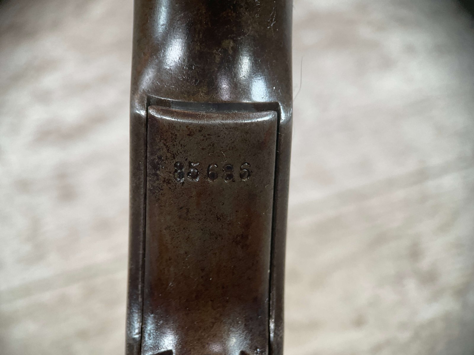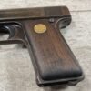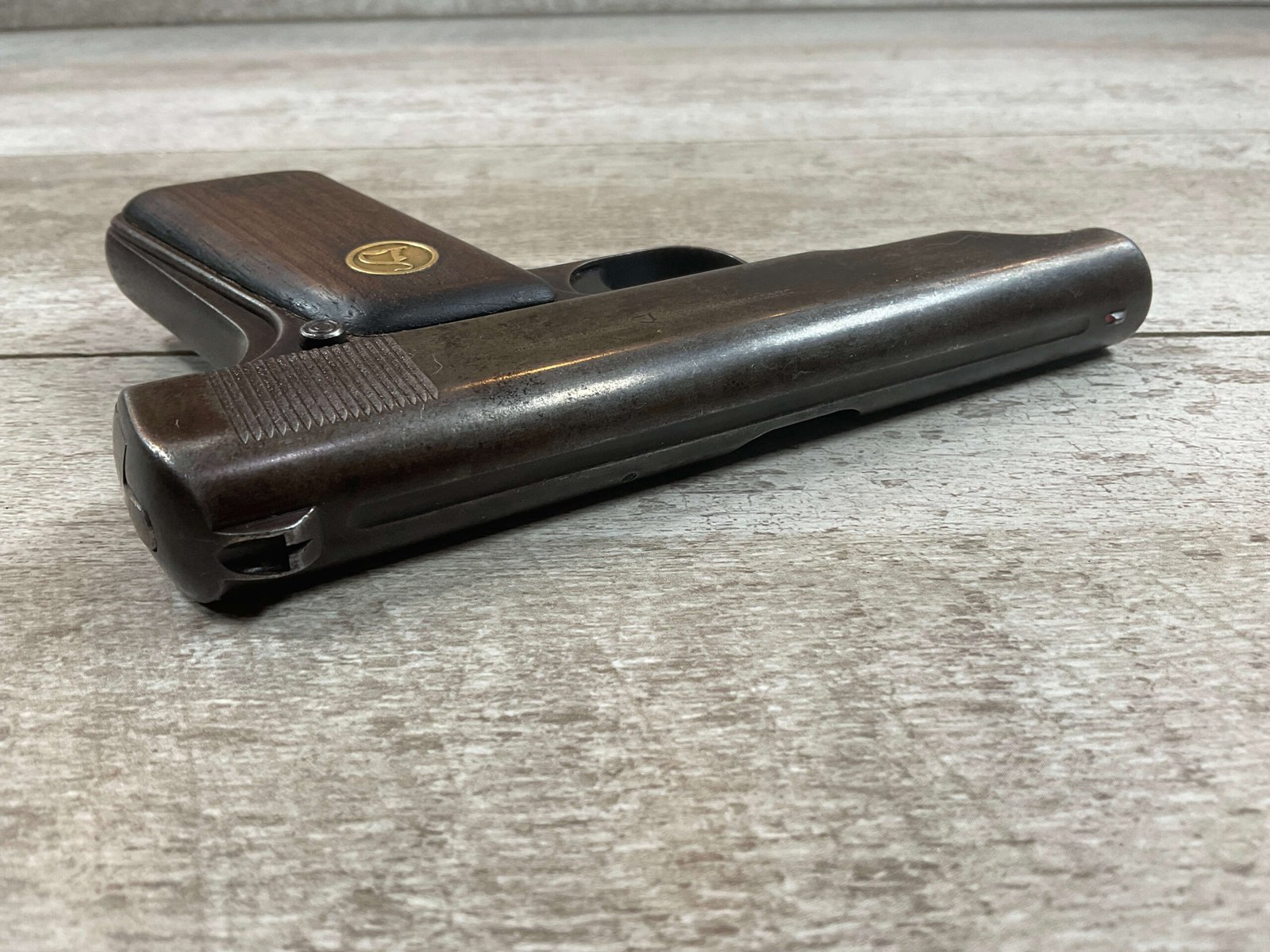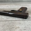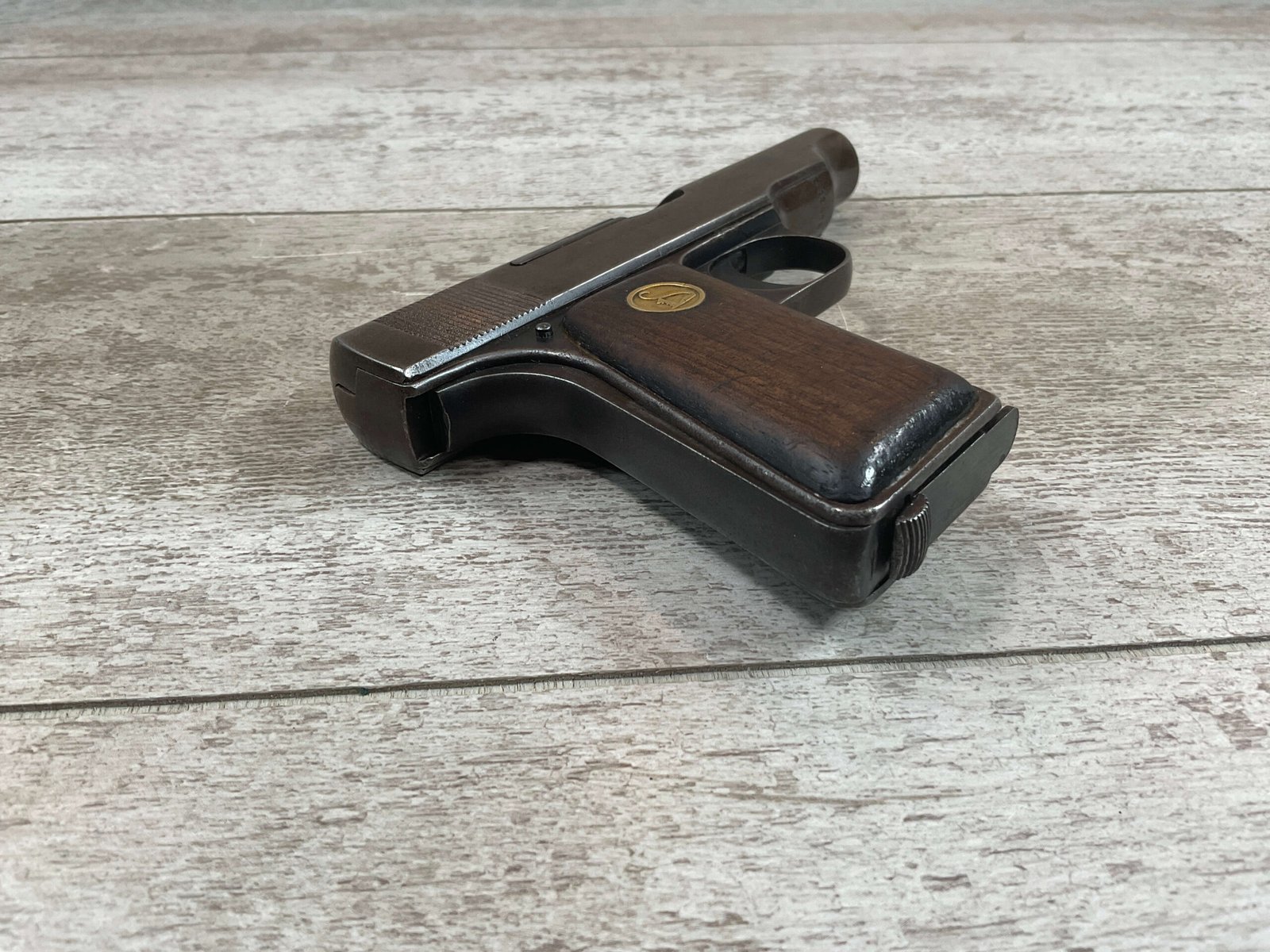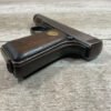 DEUTSCHE WERKE ORTGIE’S 7.65MM PISTOL #85686 3.4″ BBL, 7 ROUNDS, MATCHING W/ORIGINAL FINISH WHICH IS TURNING BROWN PETINA, EXC SMOOTH WALNUT GRIPS, GRIP SAFETY, “MADE IN GERMANY” STAMPED ON LEFT GRIPS, CROWN/N STAMPED, “DEUTSCHE WERK – WERK ERFURT” ON LEFT SIDE OF SLIDE, “ORTGIES’PATENT” ON RIGHT SIDE OF SLIDE, NO MARKINGS ON MAGAZINE, 1 MAGAZINE, PRODUCED FROM 1919-1924, VG OVERALL CONDITION