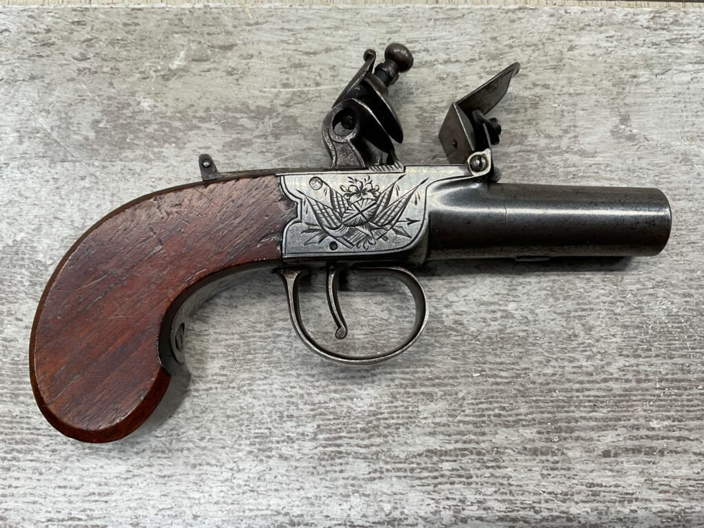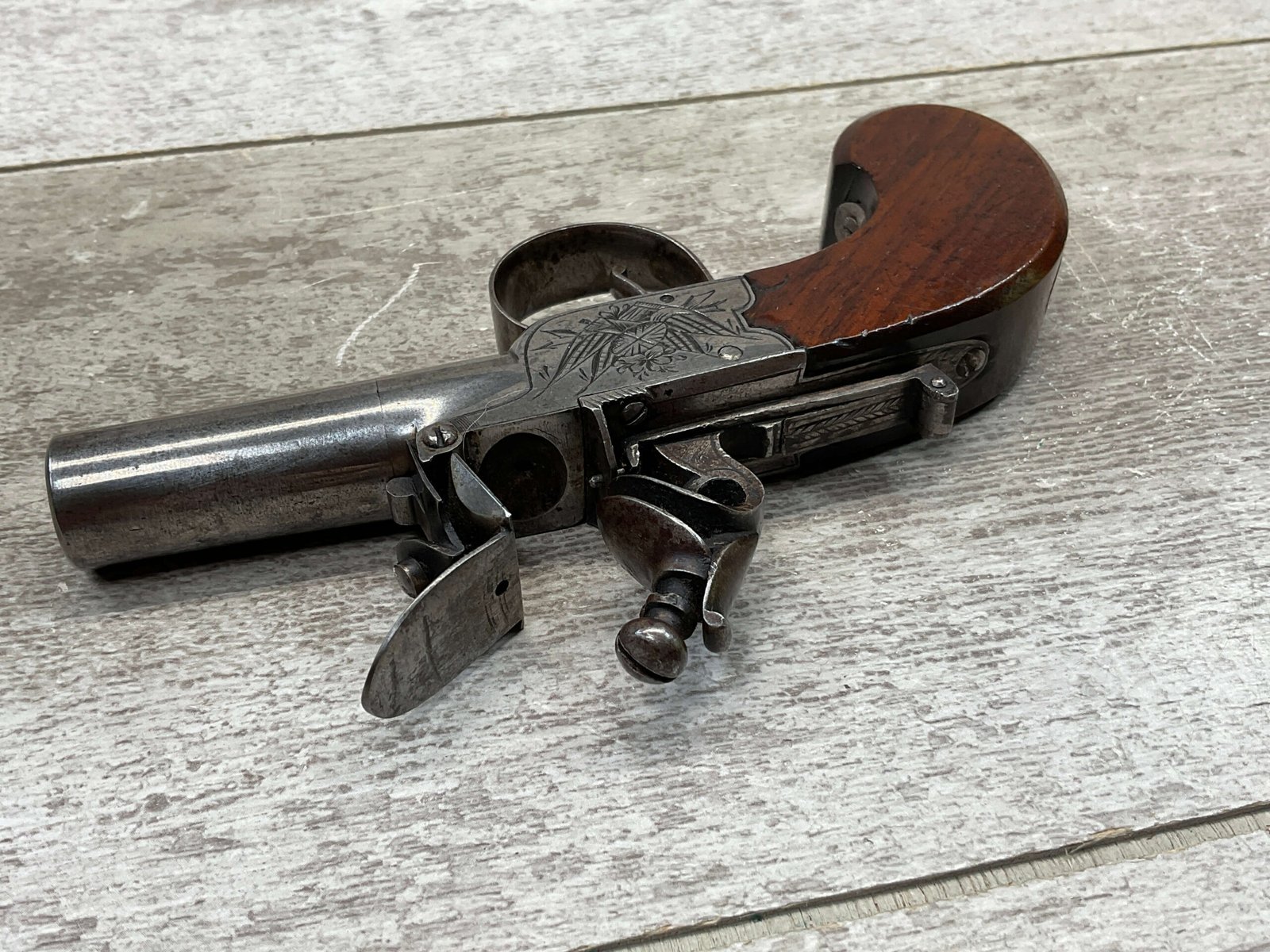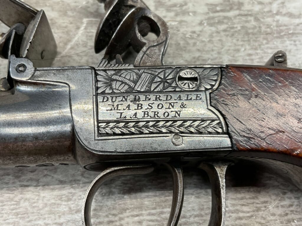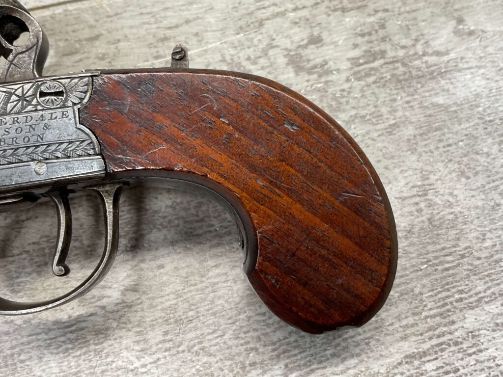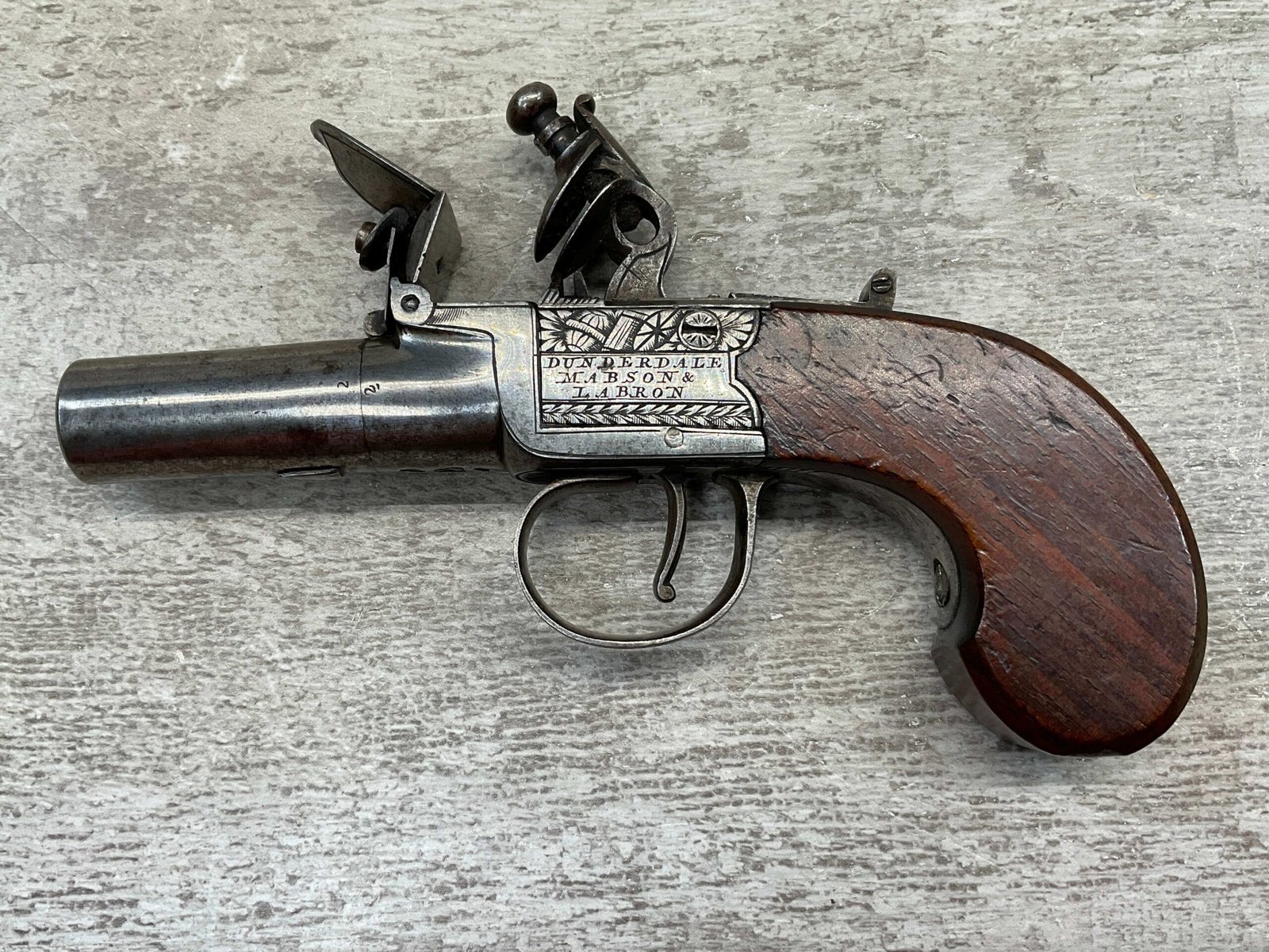 DUNDERDALE MABSON & LABRON BIRMINGHAM .54 FLINTLOCK OVERCOAT POCKET PISTOL #NSN, CIRCA 1807-1821, 1 3/4″ SCREW OFF BARREL, DARKER SMOOTH BORE W/LIGHT FROSTING, MINOR ENGRAVING, ENGLISH PROOFS, CRISP ACTION, “DUNDERSALE, MABSON & LABRON” MARKED ON LEFT SIDE, VG ORIGINAL WOOD GRIPS, NO FLINT, NOT A REPRODUCTION, OVERALL CONDITION AS SEEN IN PHOTOS!!