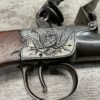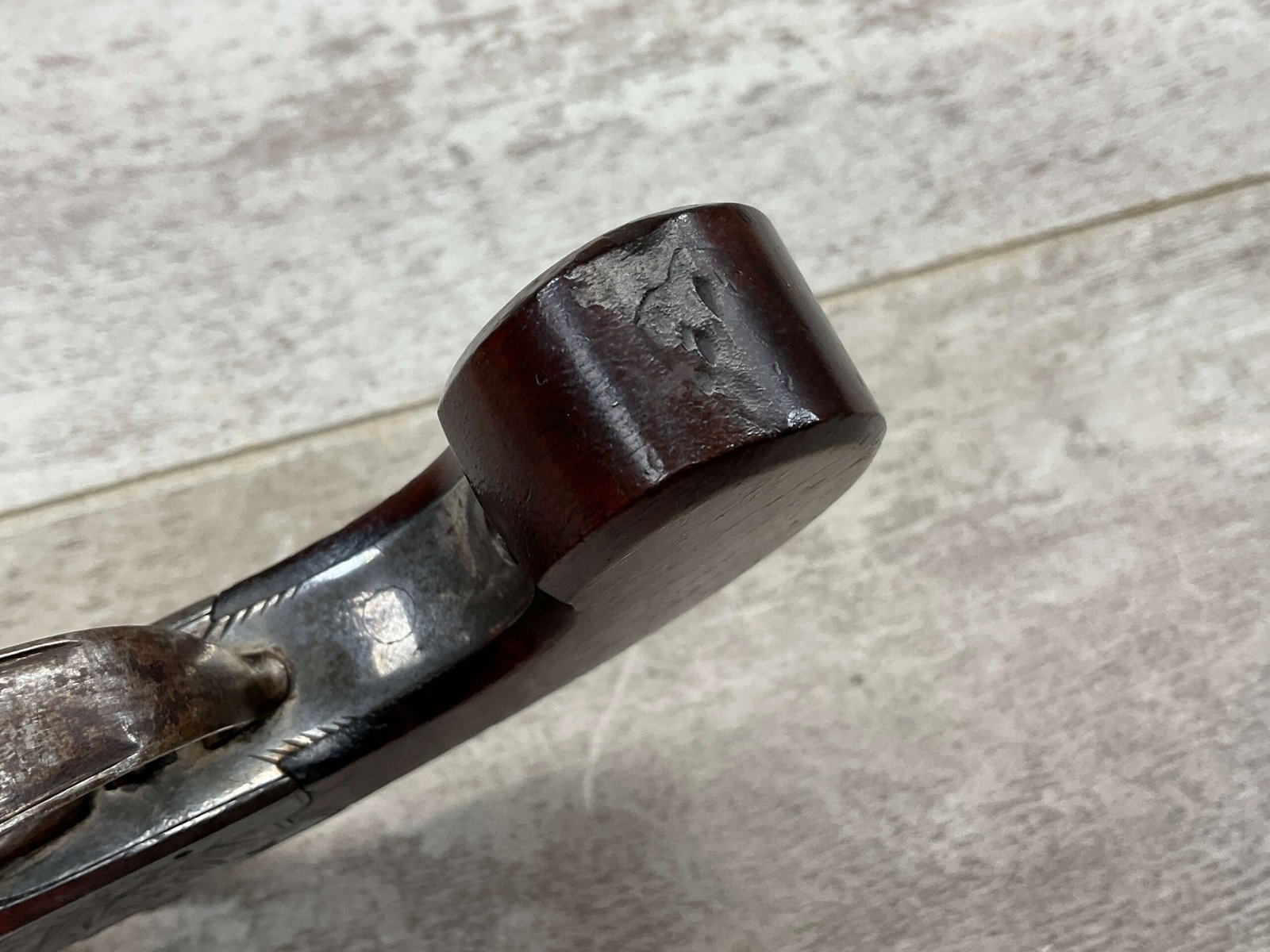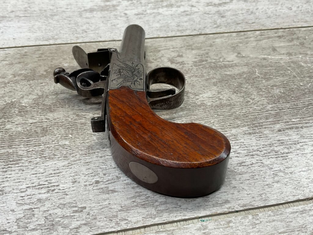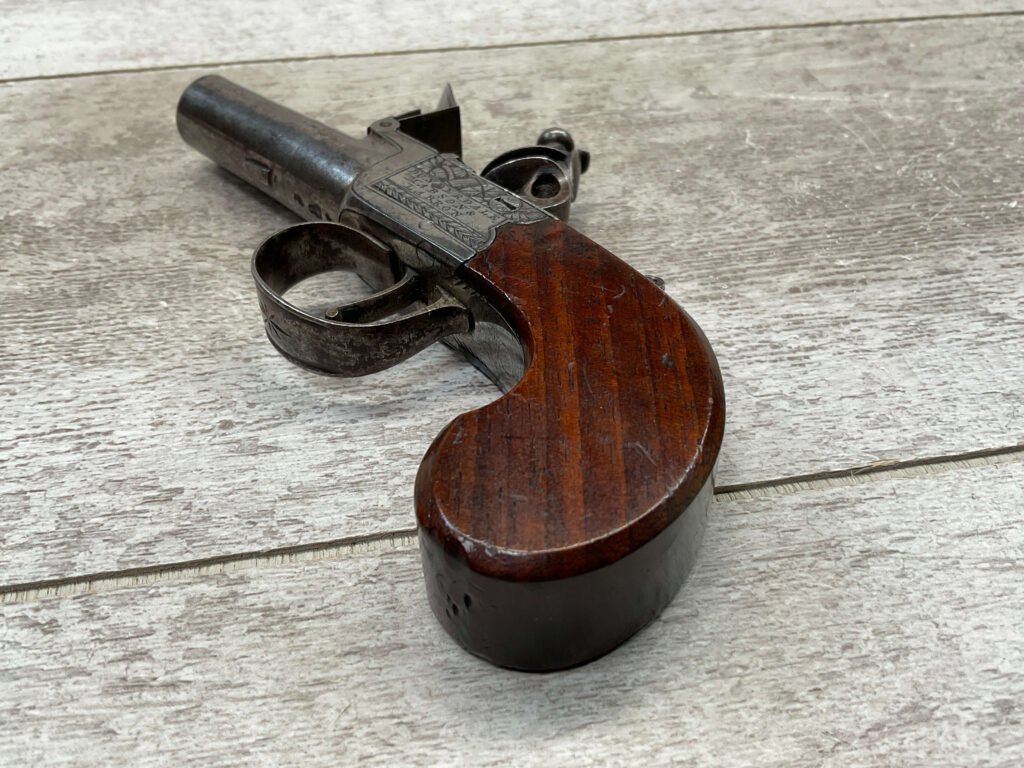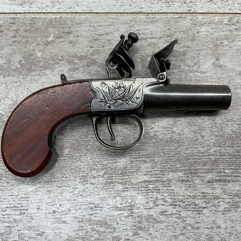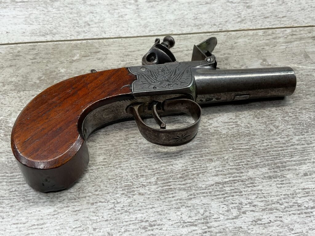 DUNDERDALE MABSON & LABRON BIRMINGHAM .54 FLINTLOCK OVERCOAT POCKET PISTOL #NSN, CIRCA 1807-1821, 1 3/4″ SCREW OFF BARREL, DARKER SMOOTH BORE W/LIGHT FROSTING, MINOR ENGRAVING, ENGLISH PROOFS, CRISP ACTION, “DUNDERSALE, MABSON & LABRON” MARKED ON LEFT SIDE, VG ORIGINAL WOOD GRIPS, NO FLINT, NOT A REPRODUCTION, OVERALL CONDITION AS SEEN IN PHOTOS!!