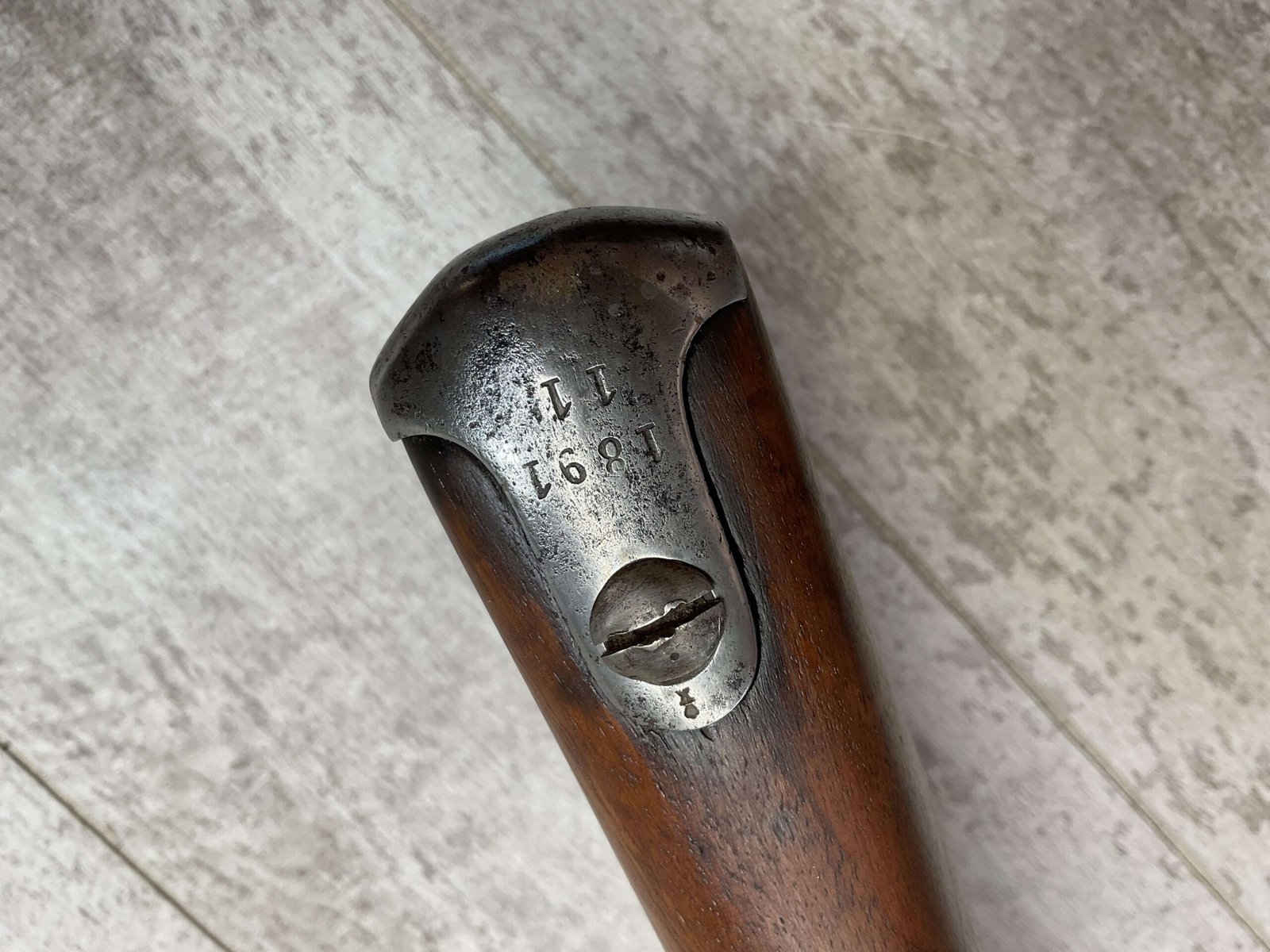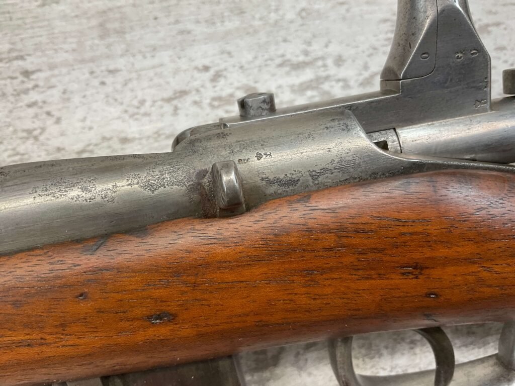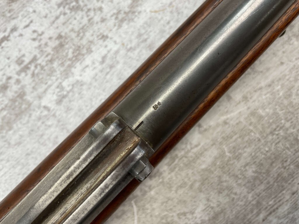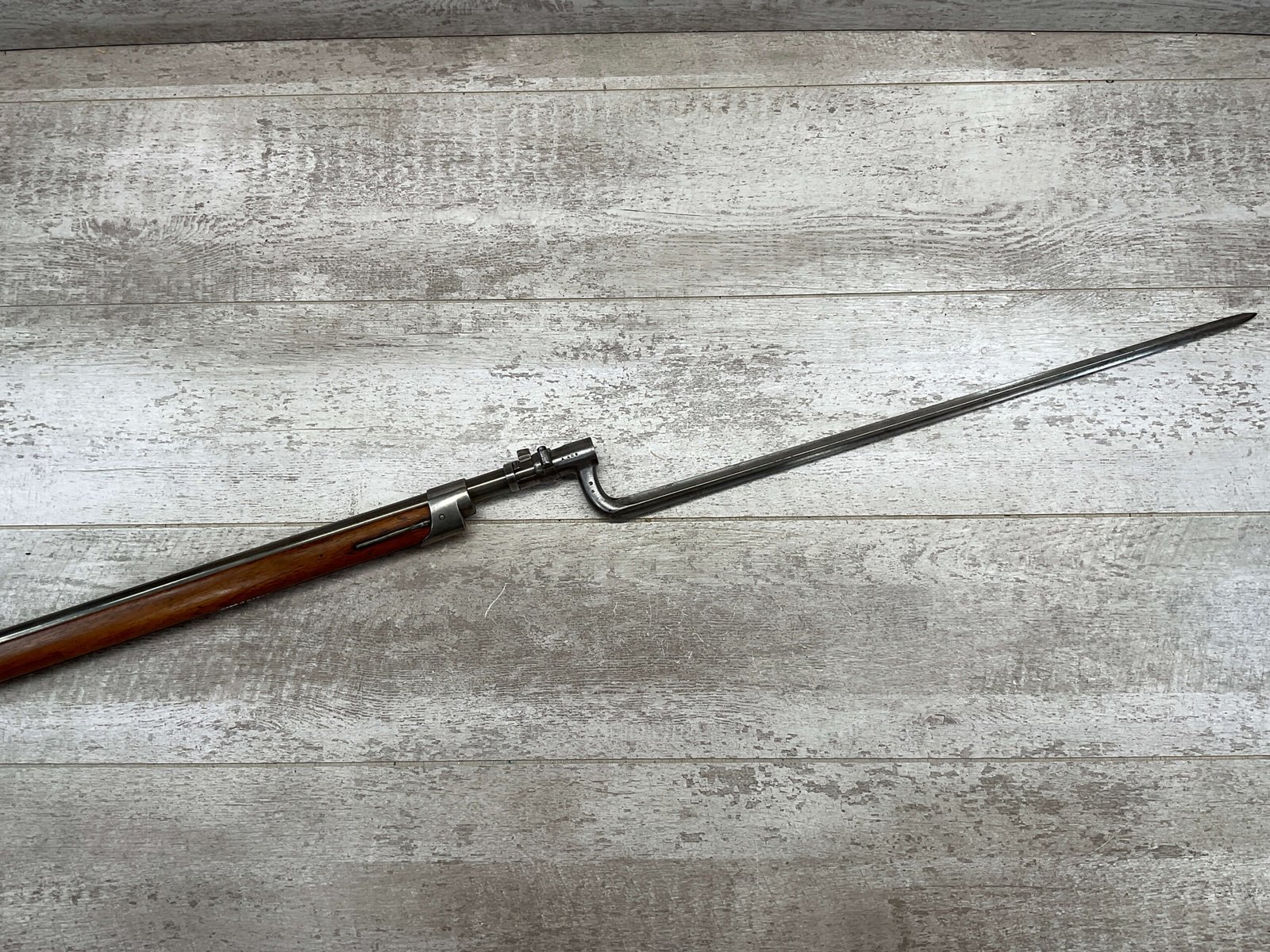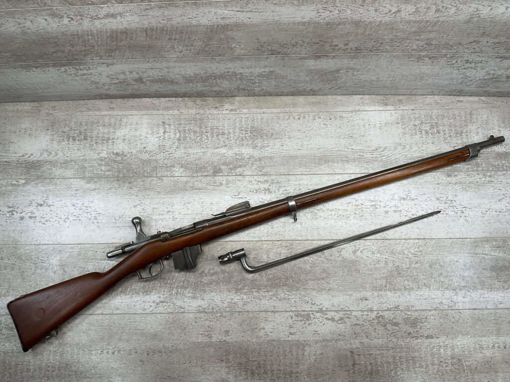 DUTCH M1871/88 BEAUMONT-VITALI BOLT ACTION INFANTRY RIFLE #11, 11.3mm, 32 5/8″ BARREL, DARKER BORE W/EXC RIFLING, VG-EXC WALNUT STOCK W/NICK & DINGS CORRECT FOR AGE, EVERYTHING MATCHING, CARTOUCHE VISIBLE ON RIGHT SIDE OF BUTT STOCK, METAL BUTT PLATE MARKED “1891 / 11”, “CROWN W” DATE STAMP “1885” ON BARREL, FINISHED IN THE WHITE THROUGHOUT, LARGE ELEVATED REAR SIGHT, CONVERTED TO 4 SHOT IN 1891, GREAT MILITARY COLLECTALBE KNOWN TO BE USED DURING WWI, 90+% OVERALL, ORIGINAL BAYONET INCLUDED MARKED “A406”!!