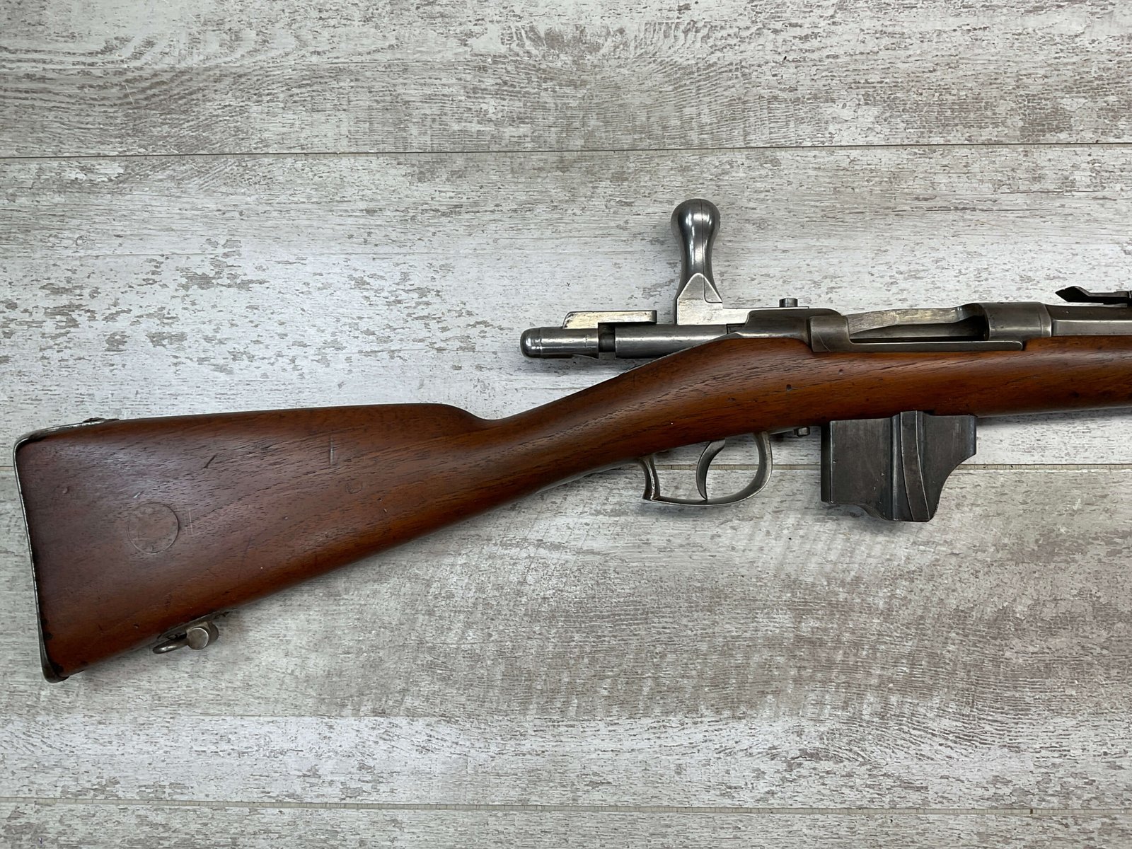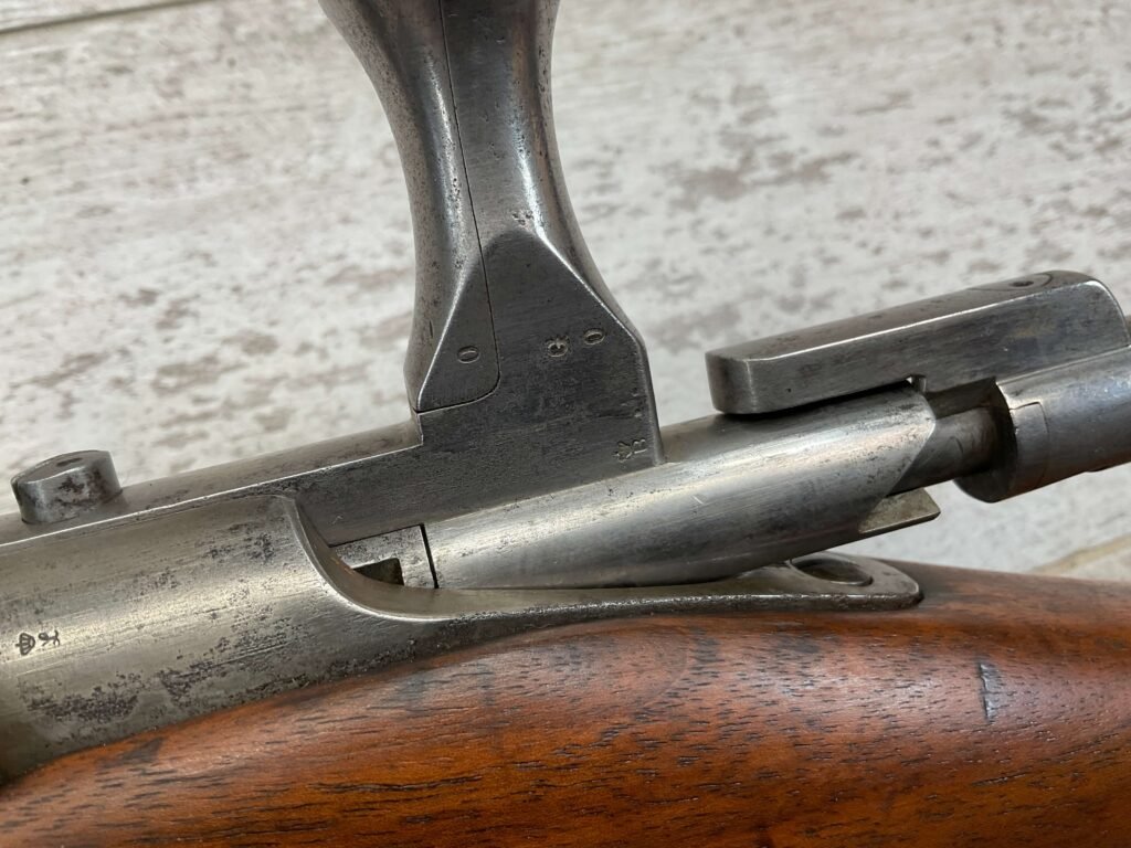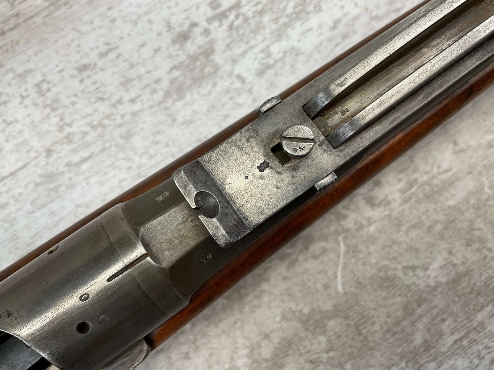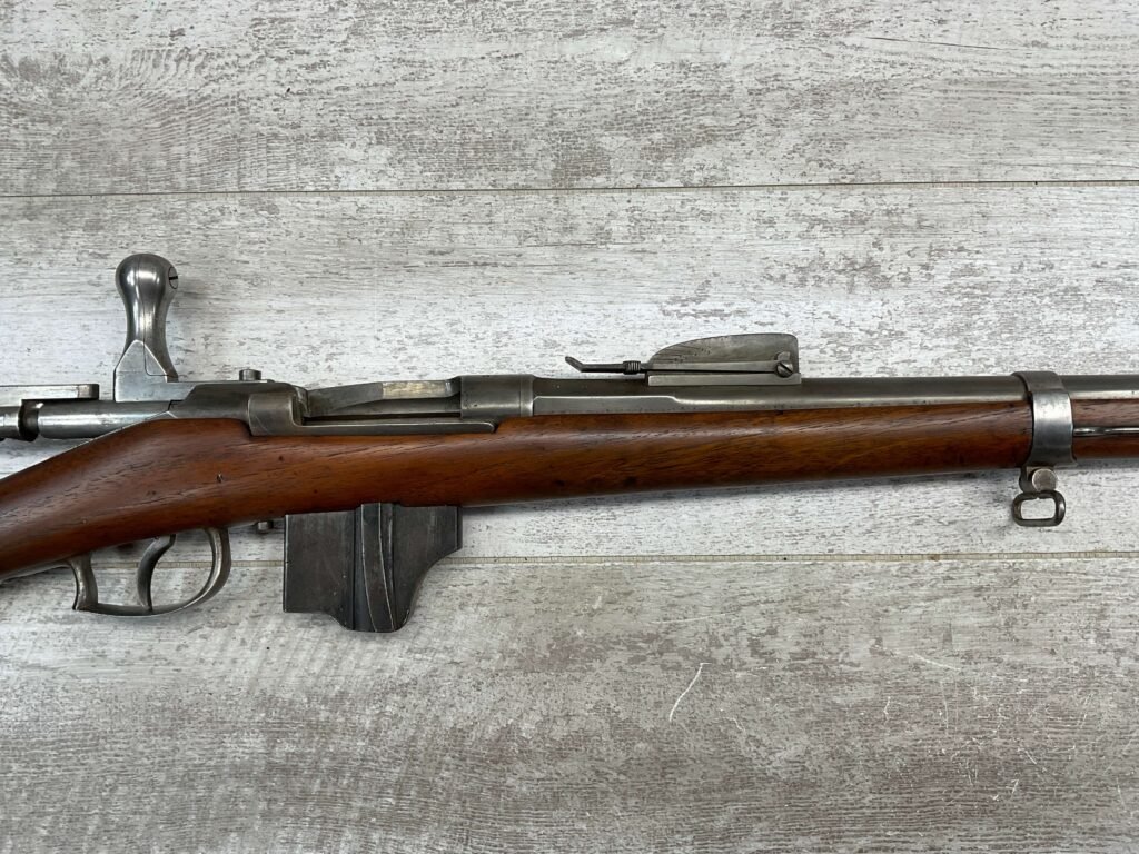 DUTCH M1871/88 BEAUMONT-VITALI BOLT ACTION INFANTRY RIFLE #11, 11.3mm, 32 5/8″ BARREL, DARKER BORE W/EXC RIFLING, VG-EXC WALNUT STOCK W/NICK & DINGS CORRECT FOR AGE, EVERYTHING MATCHING, CARTOUCHE VISIBLE ON RIGHT SIDE OF BUTT STOCK, METAL BUTT PLATE MARKED “1891 / 11”, “CROWN W” DATE STAMP “1885” ON BARREL, FINISHED IN THE WHITE THROUGHOUT, LARGE ELEVATED REAR SIGHT, CONVERTED TO 4 SHOT IN 1891, GREAT MILITARY COLLECTALBE KNOWN TO BE USED DURING WWI, 90+% OVERALL, ORIGINAL BAYONET INCLUDED MARKED “A406”!!
