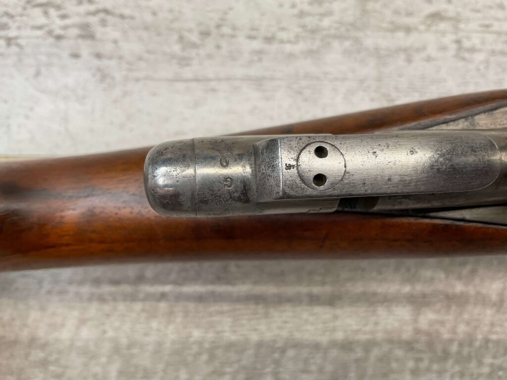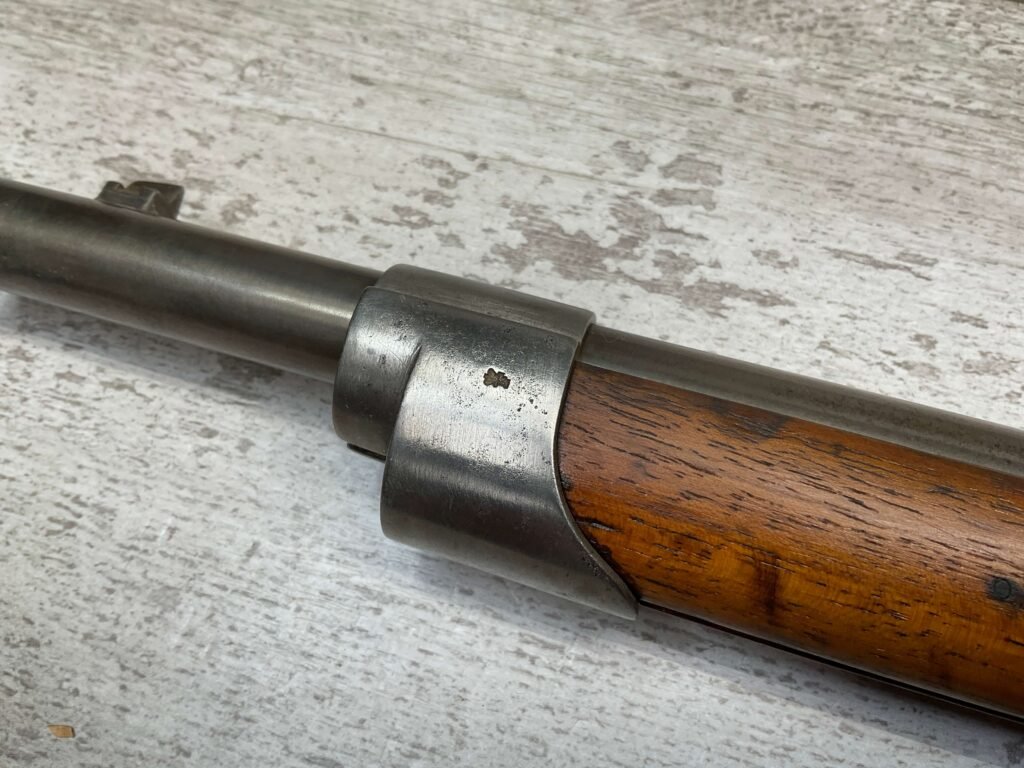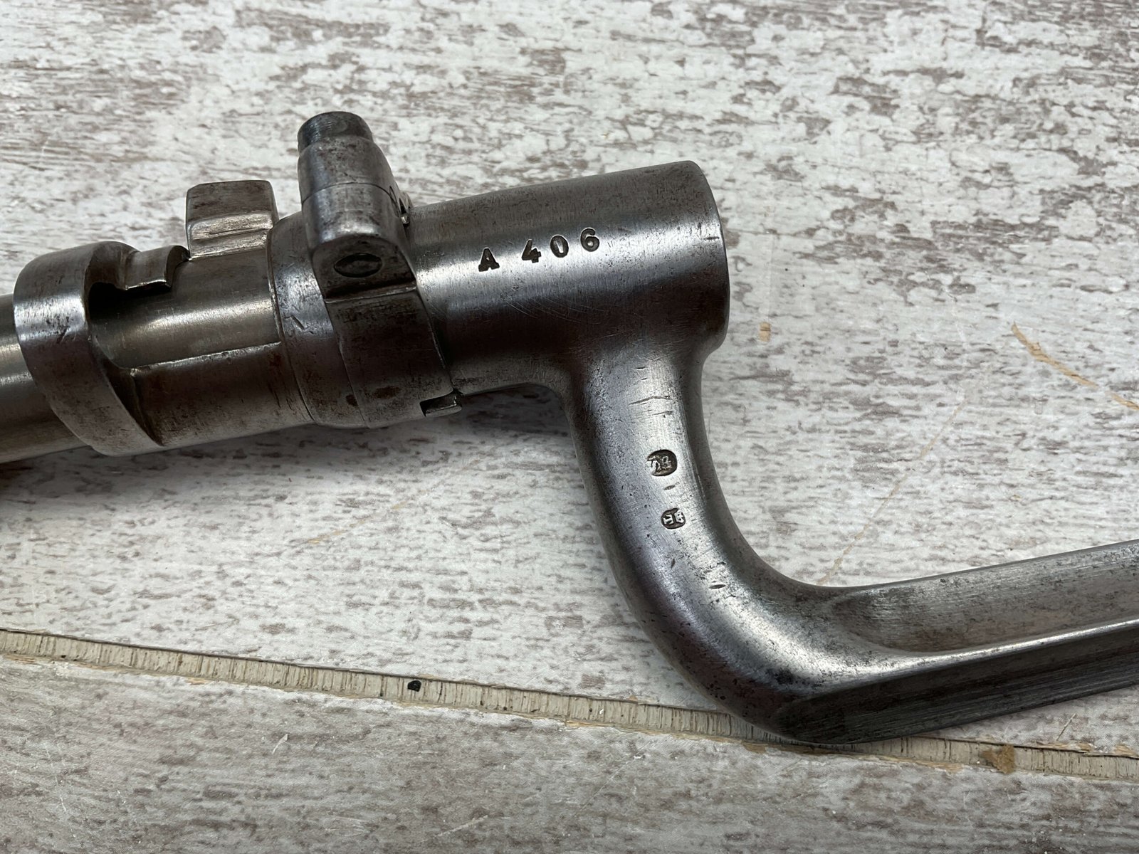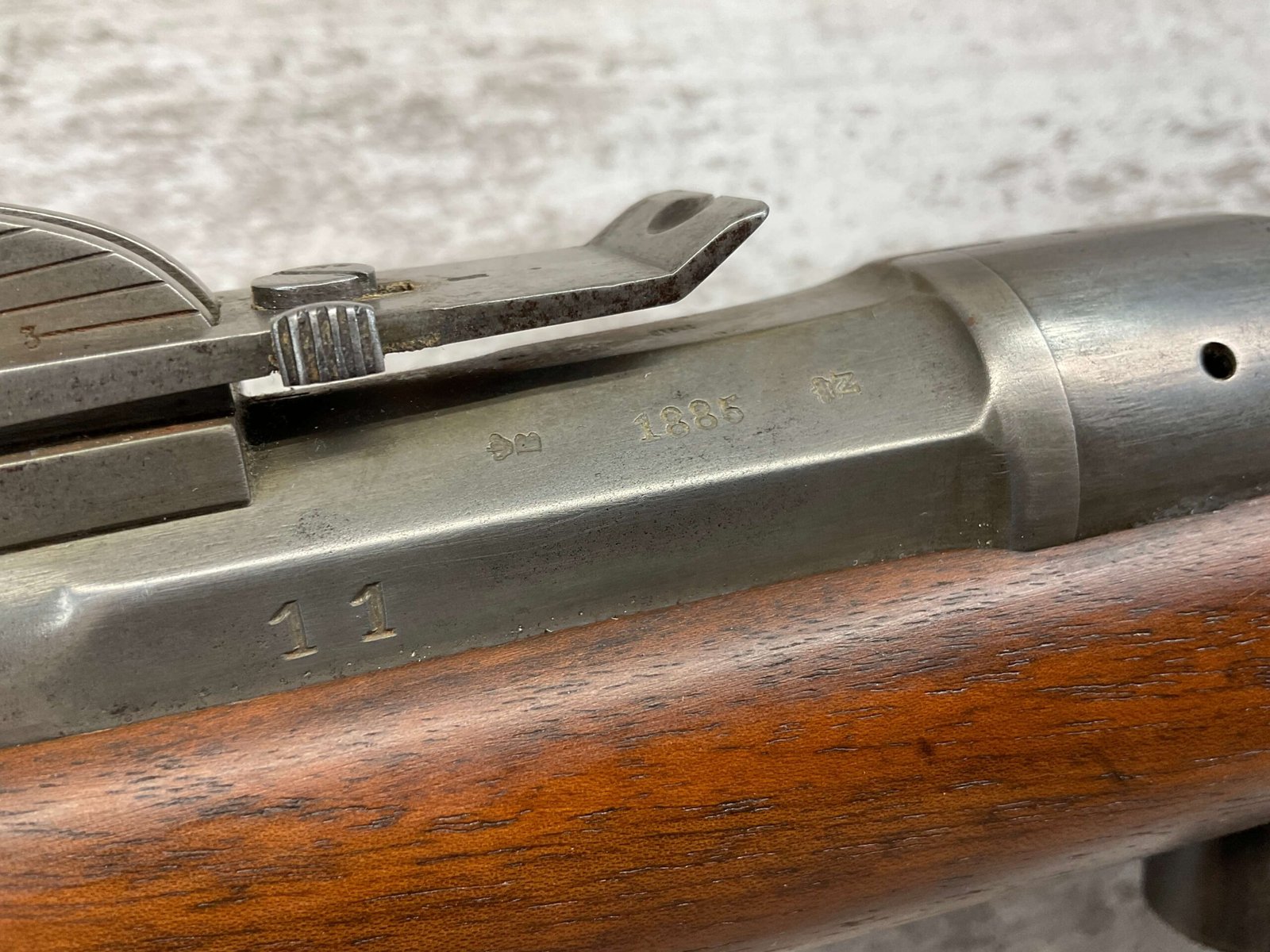 DUTCH M1871/88 BEAUMONT-VITALI BOLT ACTION INFANTRY RIFLE #11, 11.3mm, 32 5/8″ BARREL, DARKER BORE W/EXC RIFLING, VG-EXC WALNUT STOCK W/NICK & DINGS CORRECT FOR AGE, EVERYTHING MATCHING, CARTOUCHE VISIBLE ON RIGHT SIDE OF BUTT STOCK, METAL BUTT PLATE MARKED “1891 / 11”, “CROWN W” DATE STAMP “1885” ON BARREL, FINISHED IN THE WHITE THROUGHOUT, LARGE ELEVATED REAR SIGHT, CONVERTED TO 4 SHOT IN 1891, GREAT MILITARY COLLECTALBE KNOWN TO BE USED DURING WWI, 90+% OVERALL, ORIGINAL BAYONET INCLUDED MARKED “A406”!!
