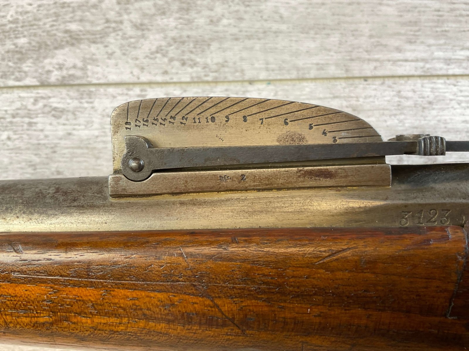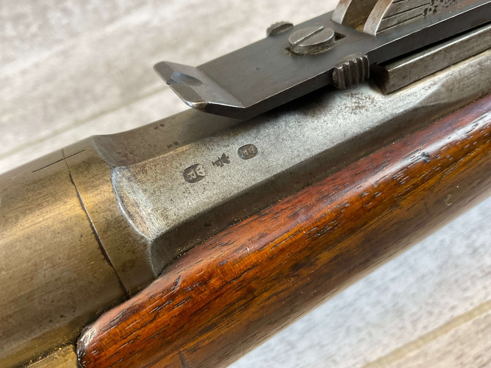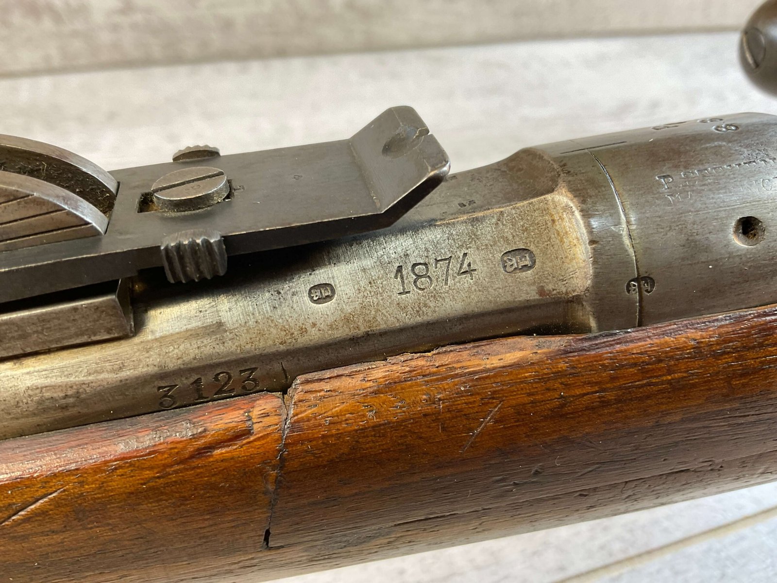 DUTCH M1871 BEAUMONT 11.3X52r BOLT ACTION SINGLE SHOT INFANTRY RIFLE #3123, 11.3mm, 32 5/8″ BARREL, VG-EXC BORE W/EXC RIFLING, GOOD WALNUT STOCK W/NICK & DINGS CORRECT FOR AGE, NON- MATCHING, METAL BUTT PLATE W/SOME RUST, DATE STAMP “1874” ON BARREL, DARK BROWN/GREY PATINA THROUGHOUT, LARGE ELEVATED REAR SIGHT, NO MAGAZINE (THIS IS RARE AS IT HASN’T BEEN CONVERTED TO MAGAZINE FEED), CONDITION AS SHOWN IN PICTURES, FROM THE JAMES EARL JONES “FAVORITES” COLLECTION W/ CERTIFICATE OF AUTHENTICITY.
