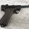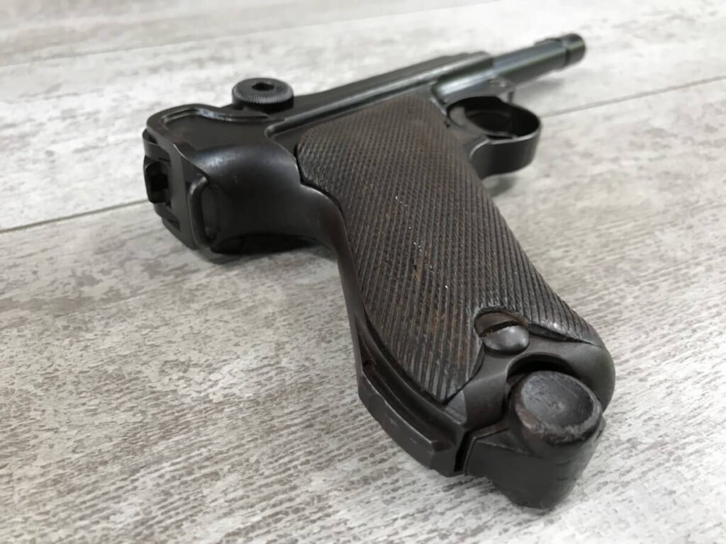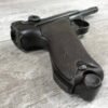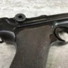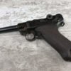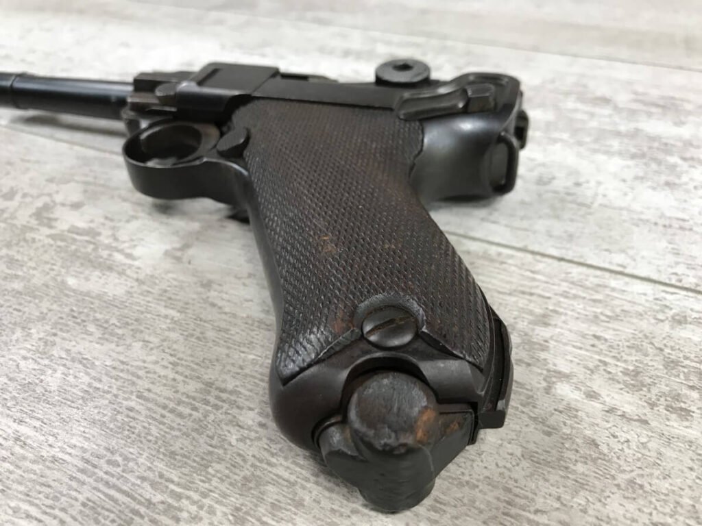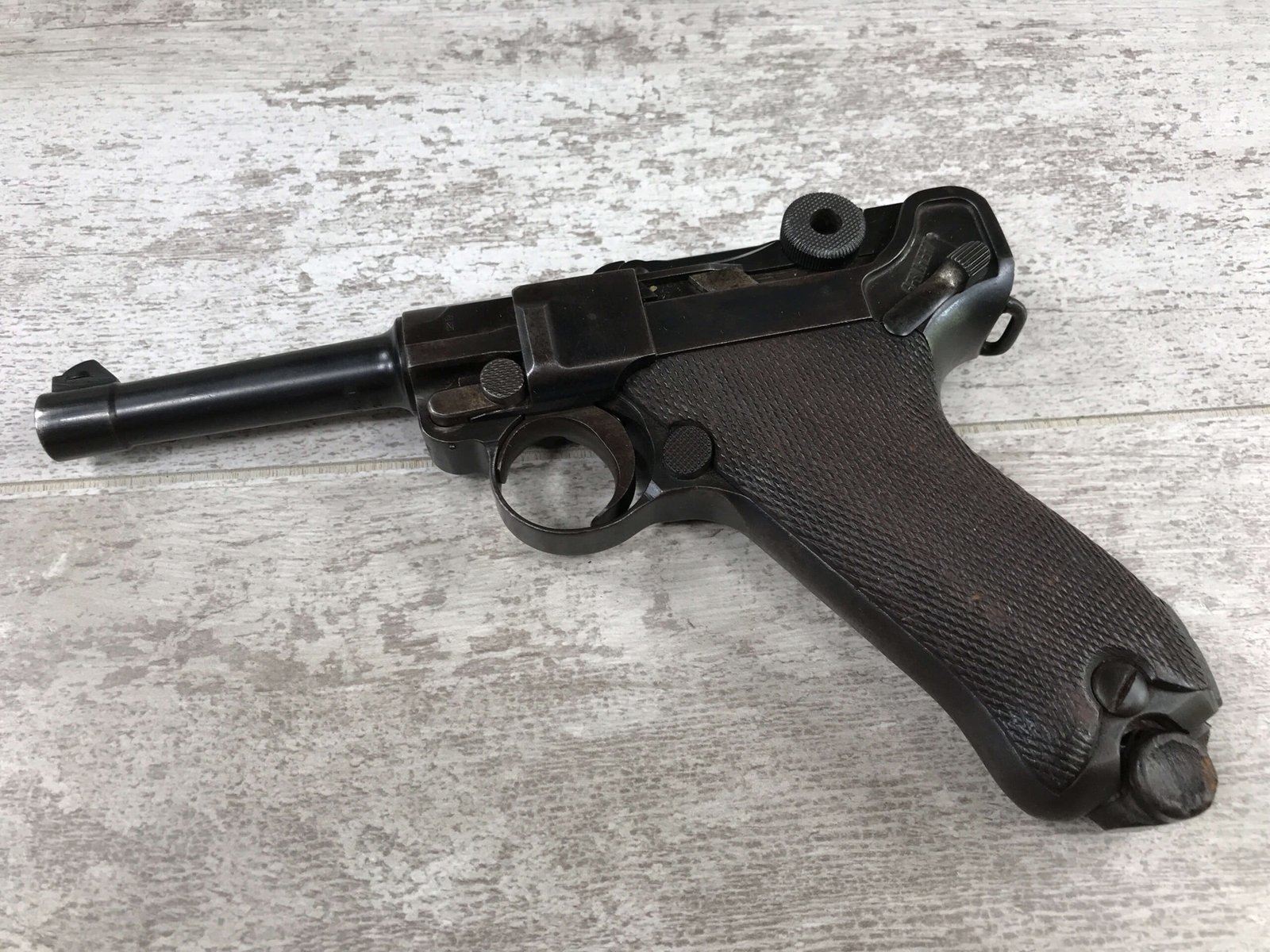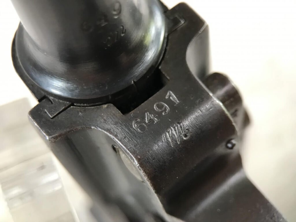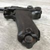 DWM 1920 COMMERCIAL P08 LUGER #6491m, 30 CAL, 70% BLUE, 15% STRAW, GOOD GRIPS, 4″ BARREL, OK BORE W/FROSTING, PITTING UNDER GRIPS, CORRECT UN-NUMBERED WOOD MAGAZINE WITH CORROSION, NEEDS SOME TLC