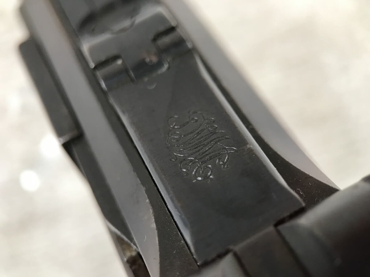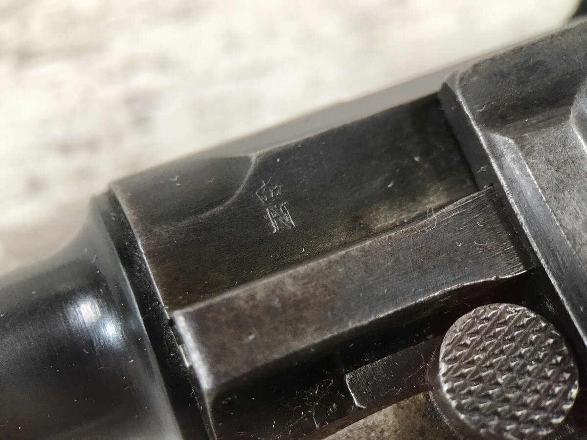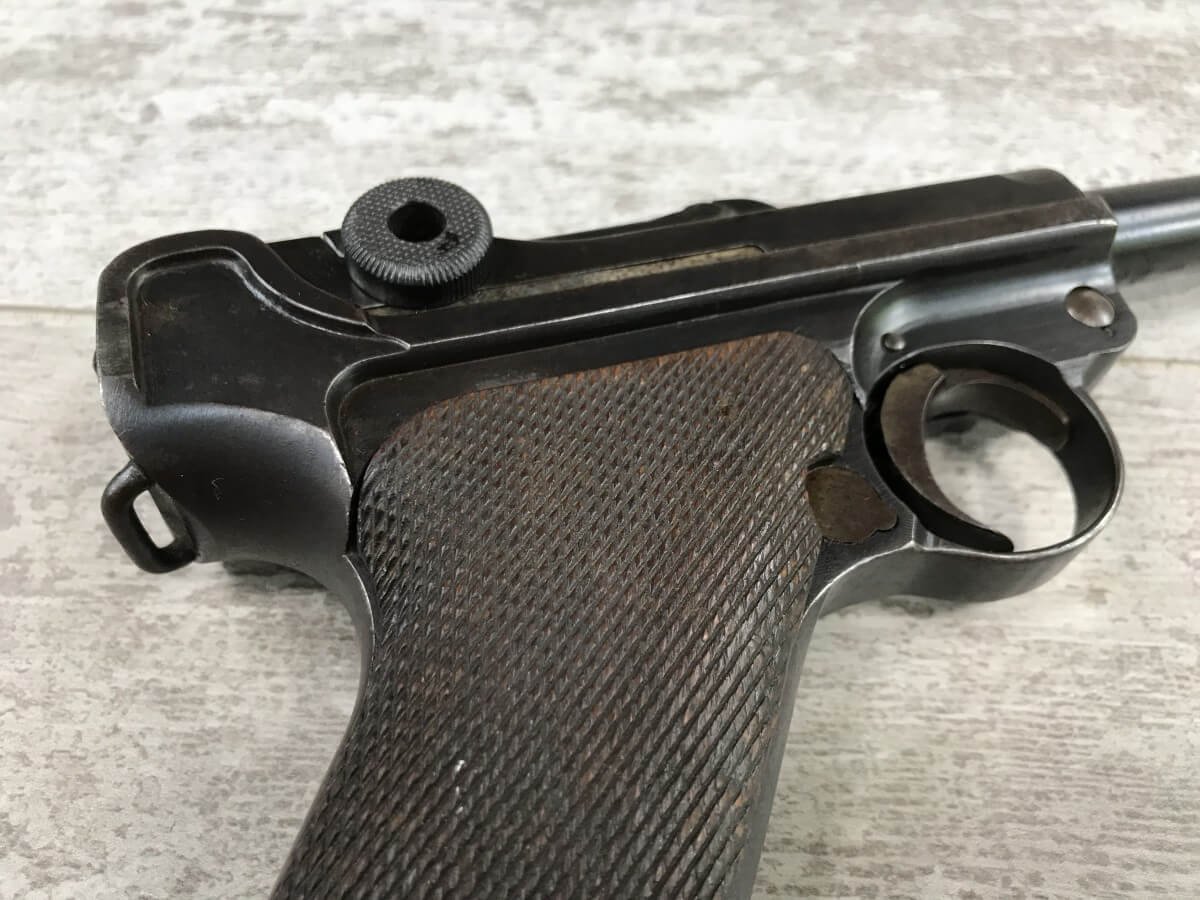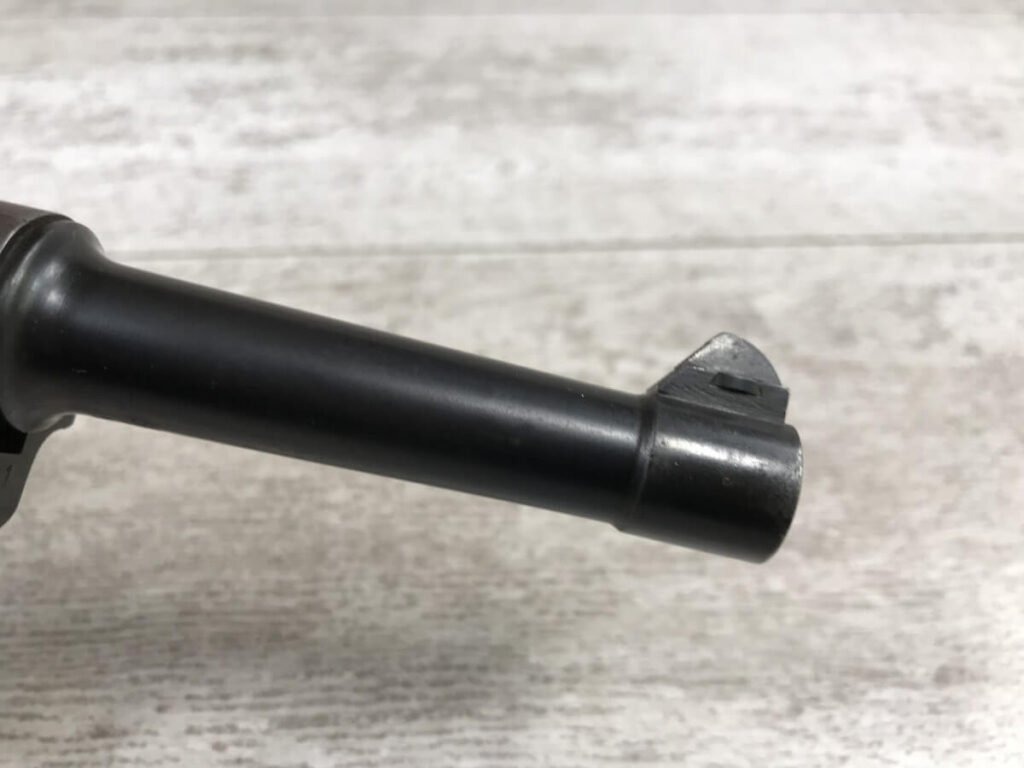 DWM 1920 COMMERCIAL P08 LUGER #6491m, 30 CAL, 70% BLUE, 15% STRAW, GOOD GRIPS, 4″ BARREL, OK BORE W/FROSTING, PITTING UNDER GRIPS, CORRECT UN-NUMBERED WOOD MAGAZINE WITH CORROSION, NEEDS SOME TLC