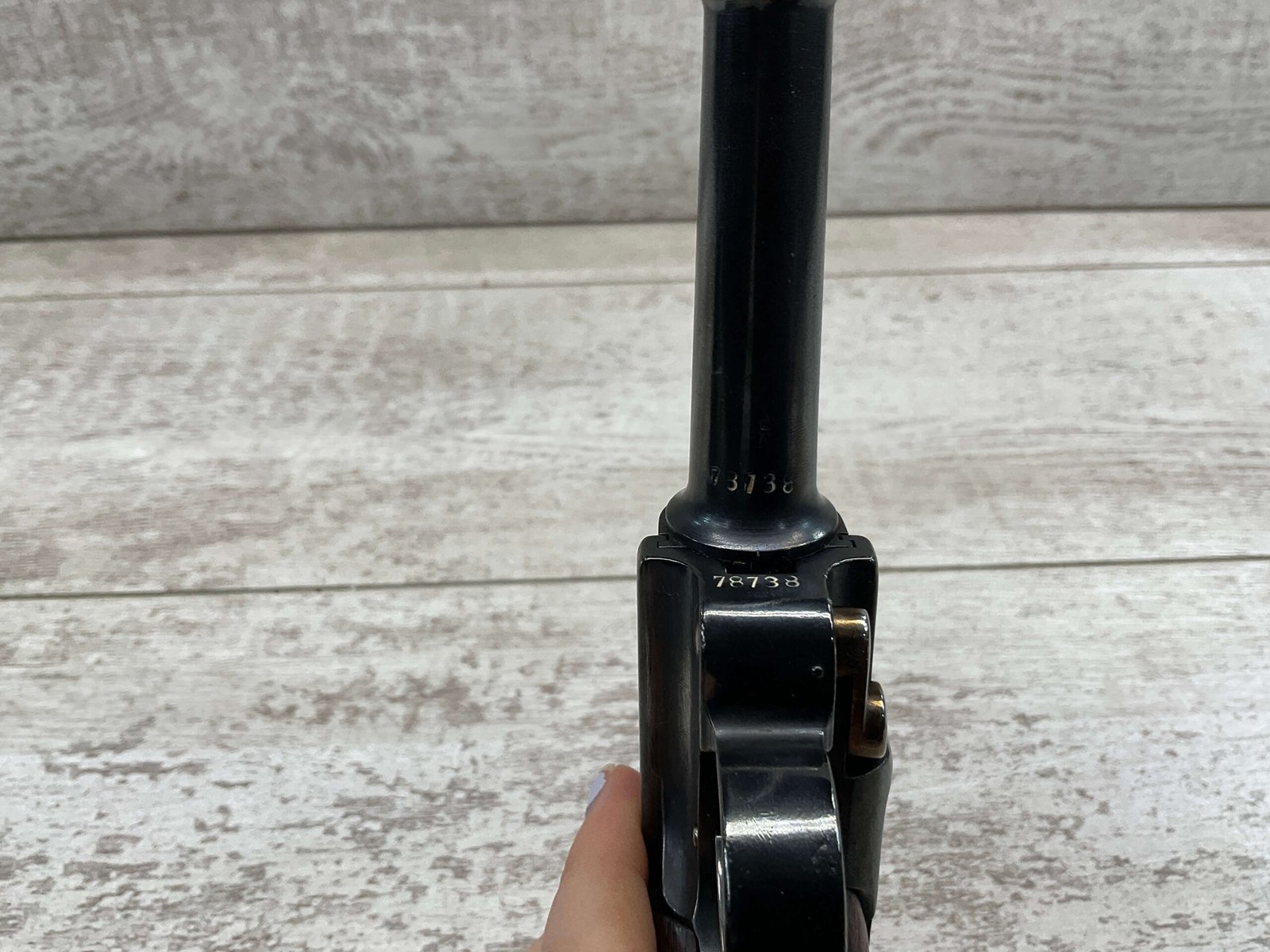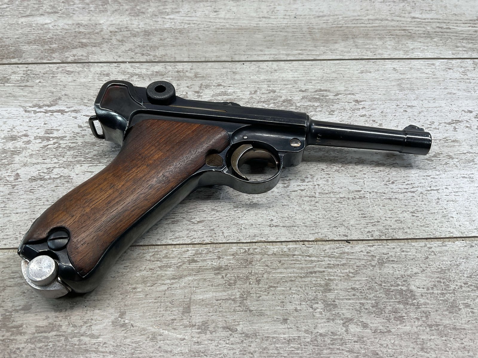 DWM COMMERCIAL LUGER P08 30 CAL SEMI AUTO PISTOL #78738, REFINISHED, MATCHING, 3 3/4″ BARREL, 30 CAL, GOOD BORE & RIFLING W/LIGHT FROSTING, NICE STRAW PARTS, EXC SMOOTH WALNUT GRIPS, PLAIN ALUM BASE MAGAZINE, 90%+