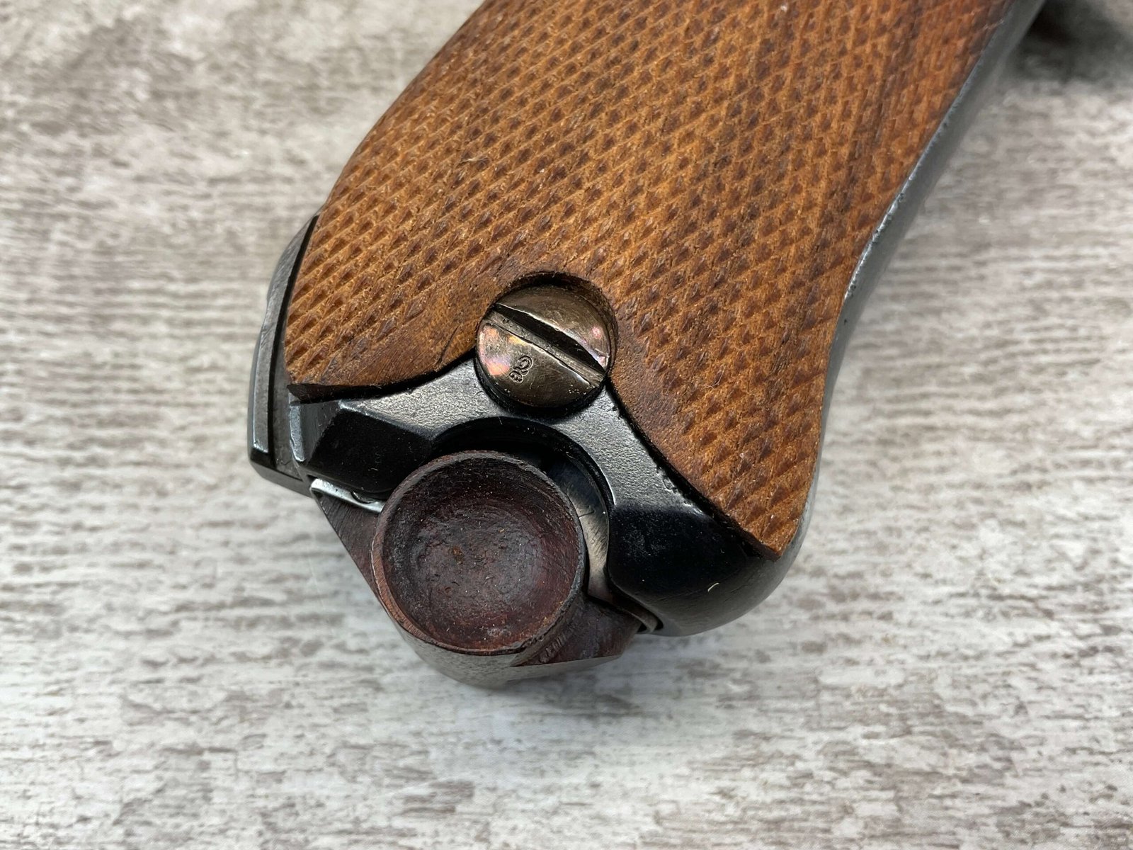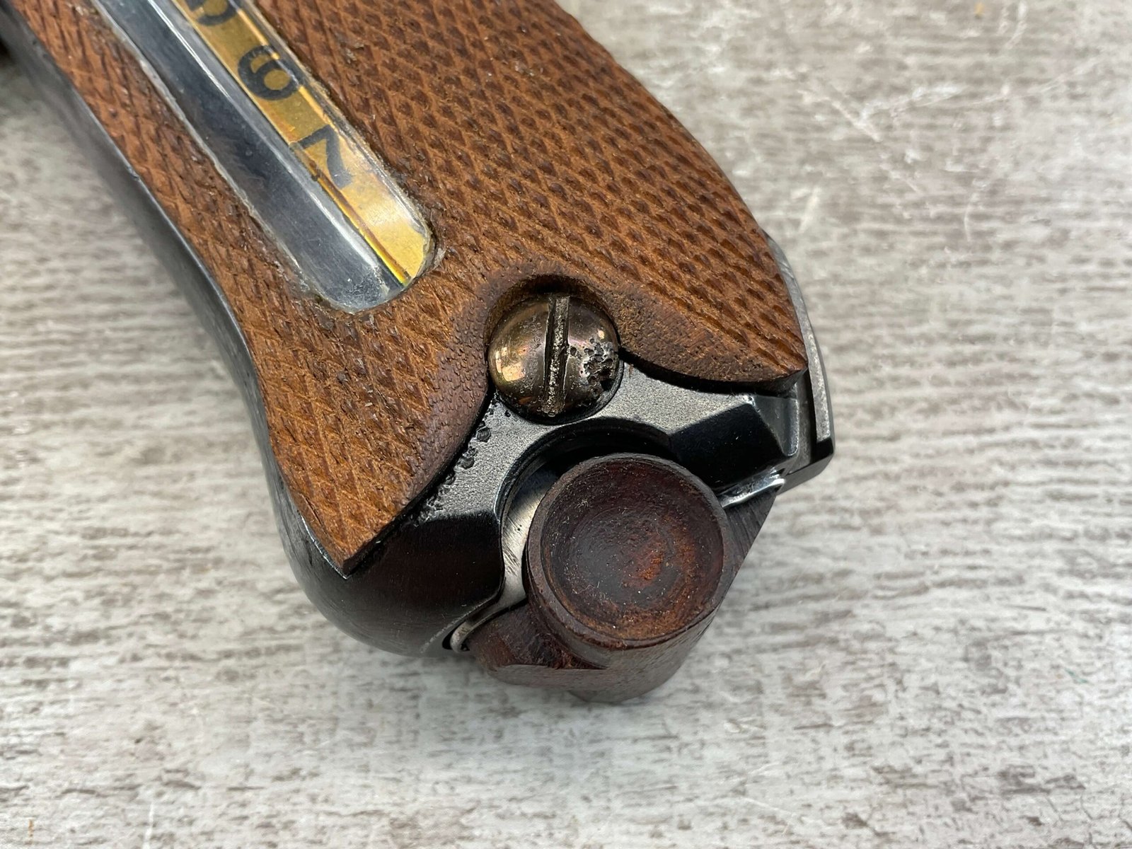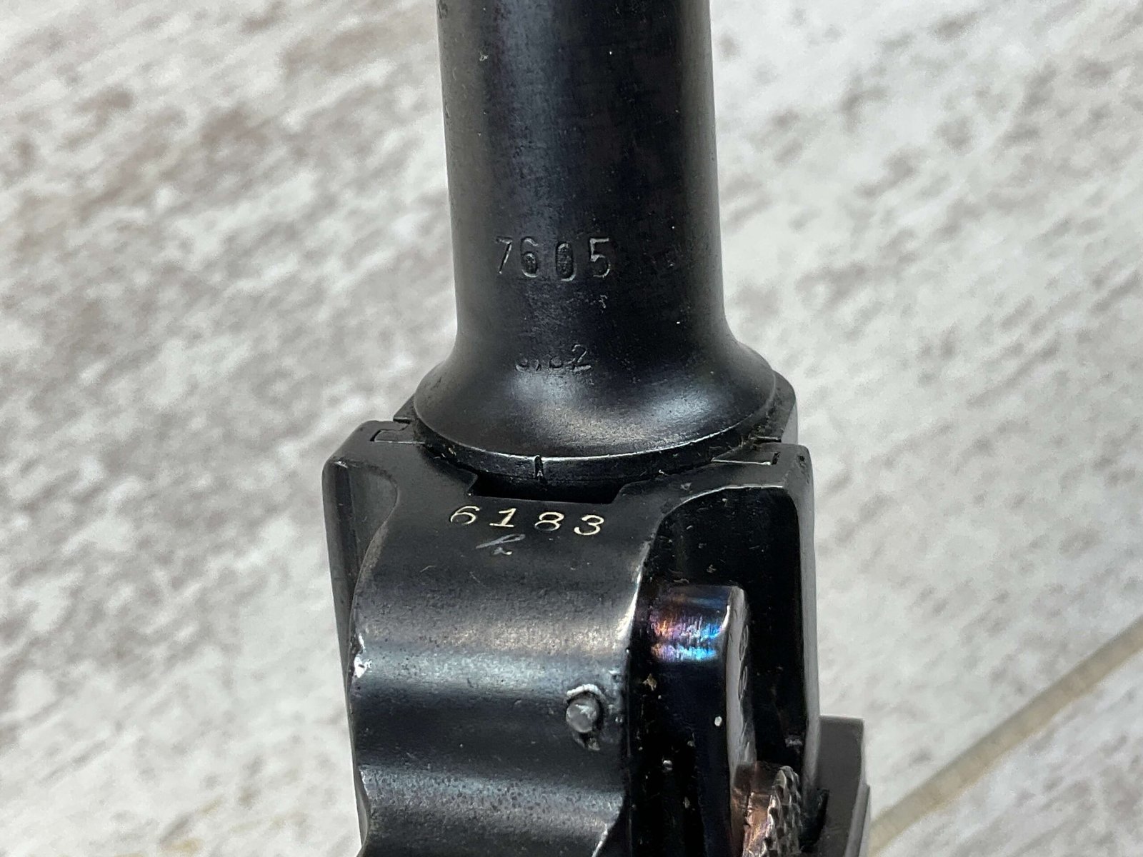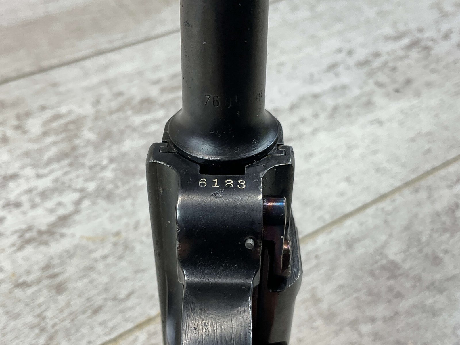 DWM LUGER P08 1936 CHAMBER DATE 9MM SEMI AUTO PISTOL #6183, 9MM, VG BRIGHT BORE & RIFLING, “7605” MARKED BBL, NON MATCHING, 1936 CHAMBER DATE, DWM TOGGLE, EXC CHECKERED WALNUT GRIPS W/ ROUND COUNT WINDOW, EXC BLUE W/ SIGNS OF PITTING UNDER, NICKEL MAGAZINE W/ AFTERMARKET WOOD BASE, NO IMPORT MARKS, EXC ACTION, GREAT SHOOTER!!