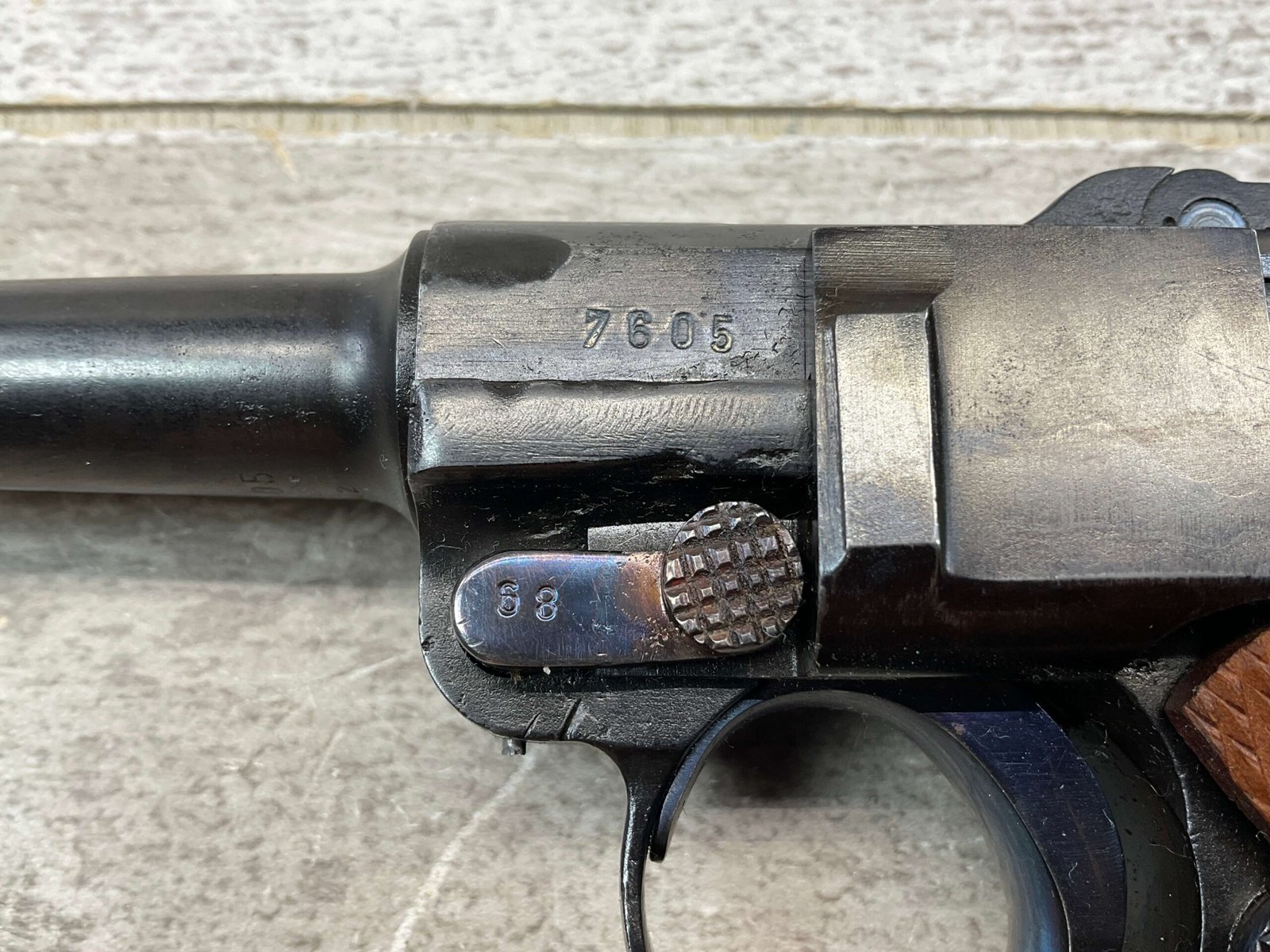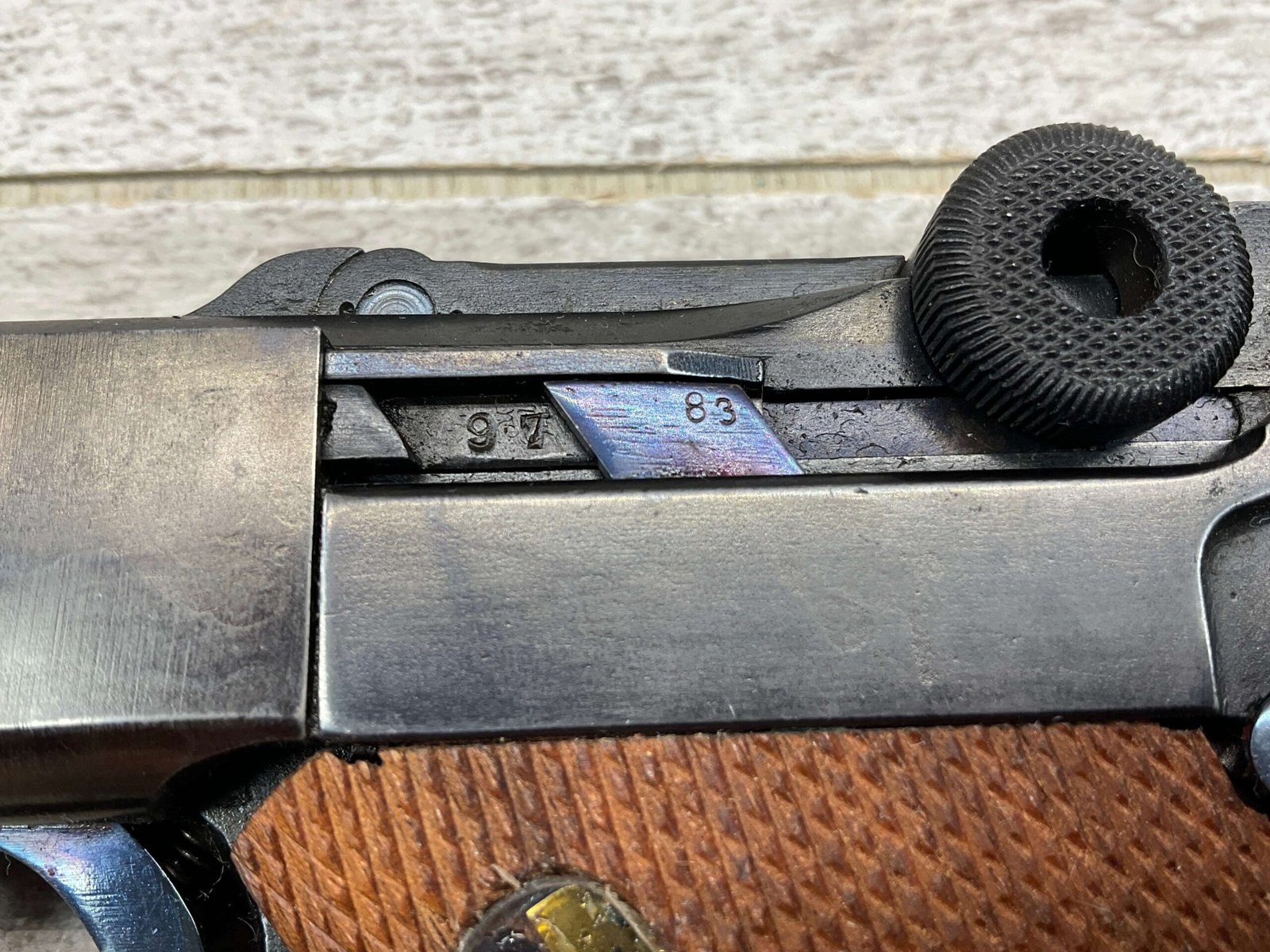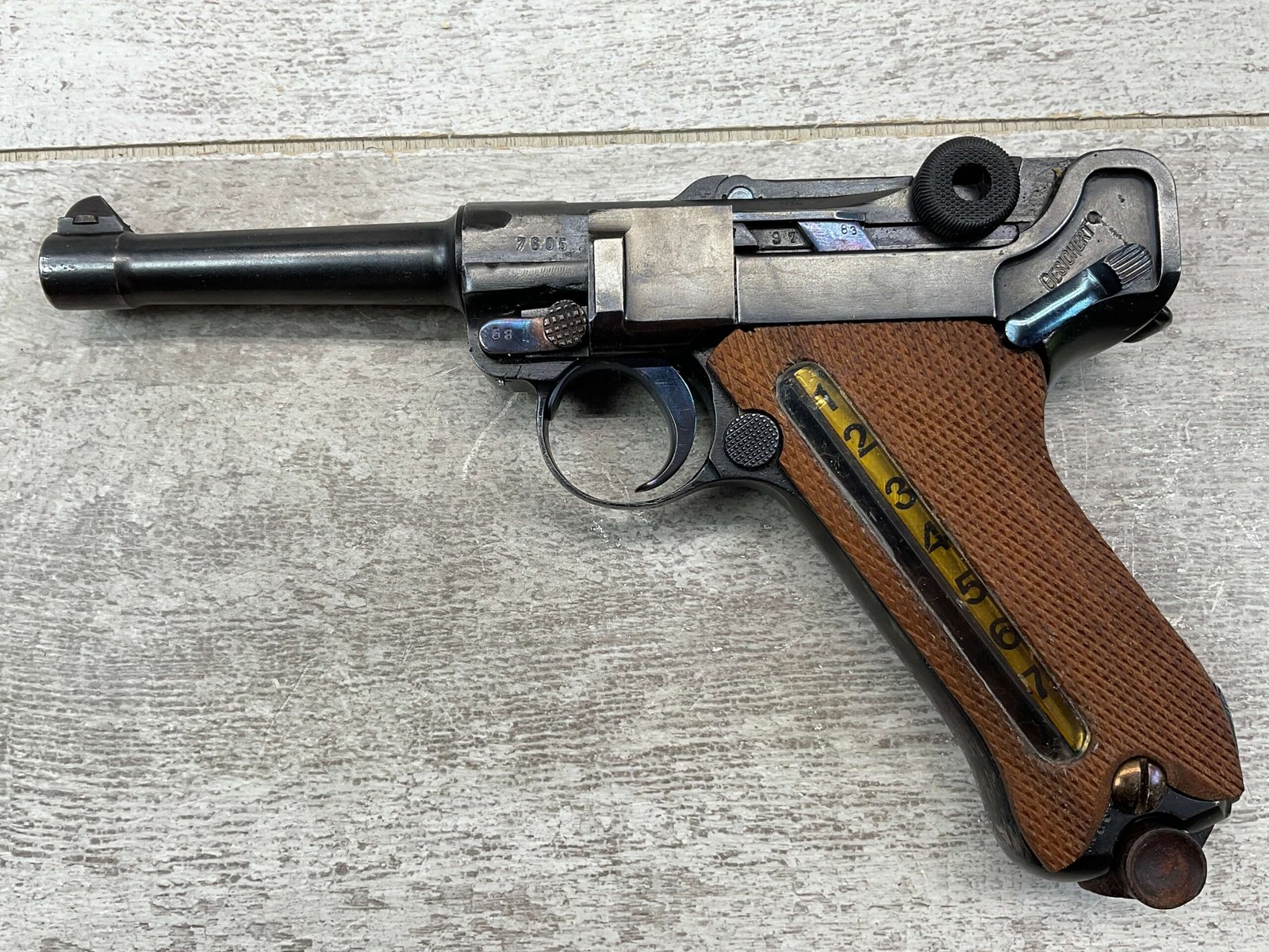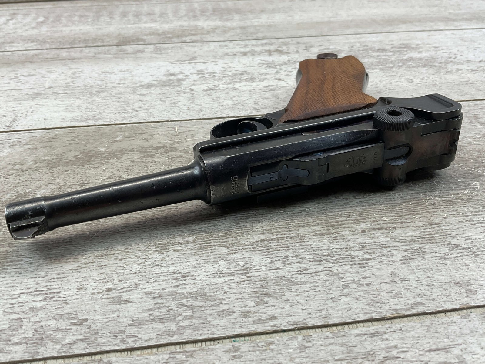 DWM LUGER P08 1936 CHAMBER DATE 9MM SEMI AUTO PISTOL #6183, 9MM, VG BRIGHT BORE & RIFLING, “7605” MARKED BBL, NON MATCHING, 1936 CHAMBER DATE, DWM TOGGLE, EXC CHECKERED WALNUT GRIPS W/ ROUND COUNT WINDOW, EXC BLUE W/ SIGNS OF PITTING UNDER, NICKEL MAGAZINE W/ AFTERMARKET WOOD BASE, NO IMPORT MARKS, EXC ACTION, GREAT SHOOTER!!