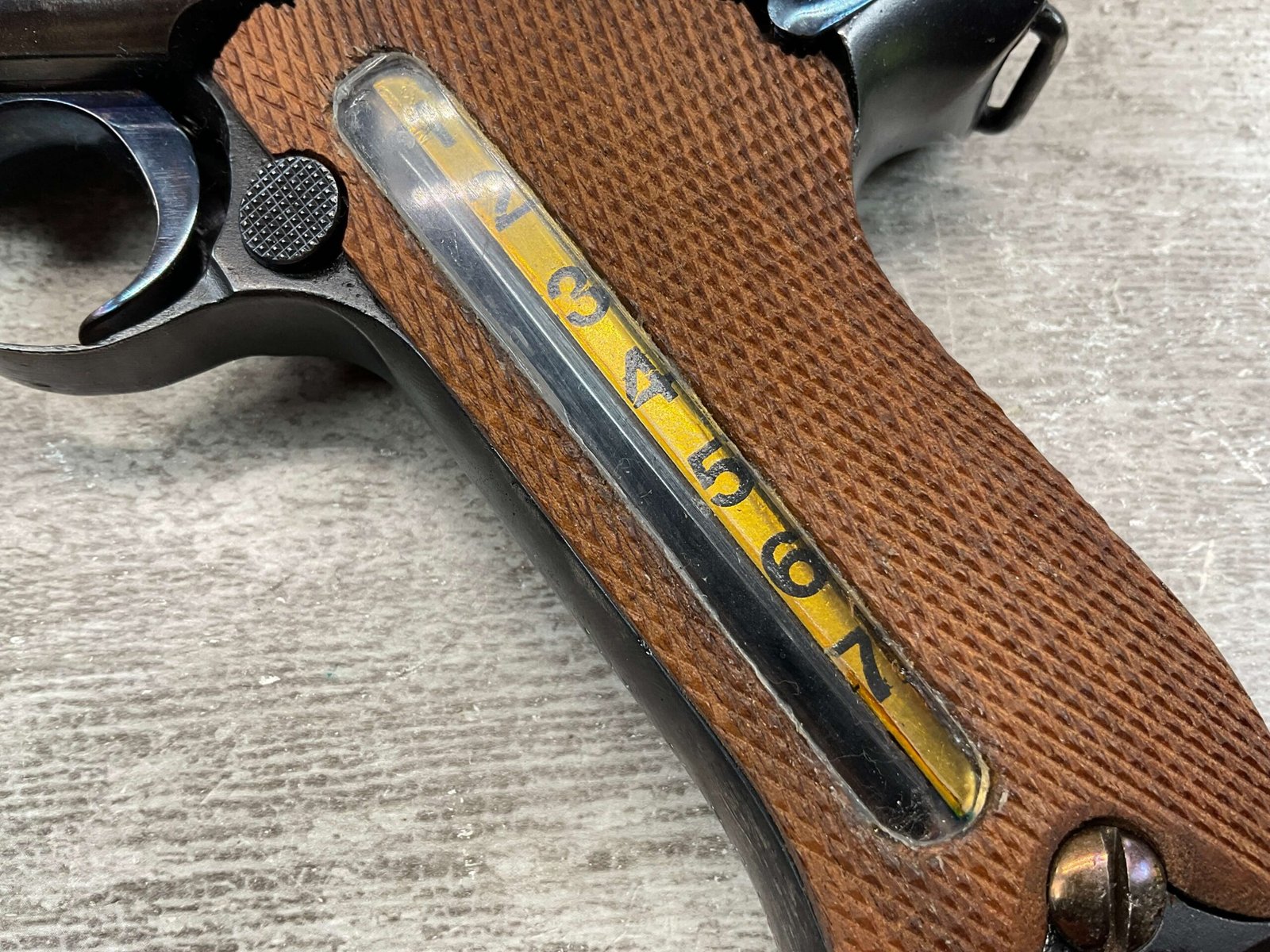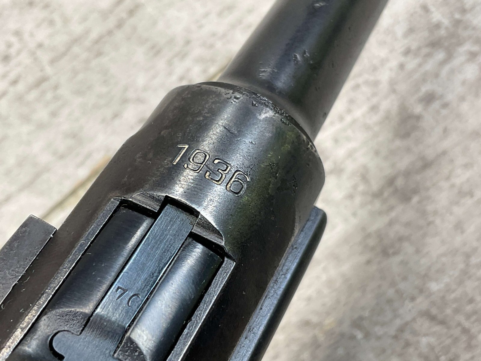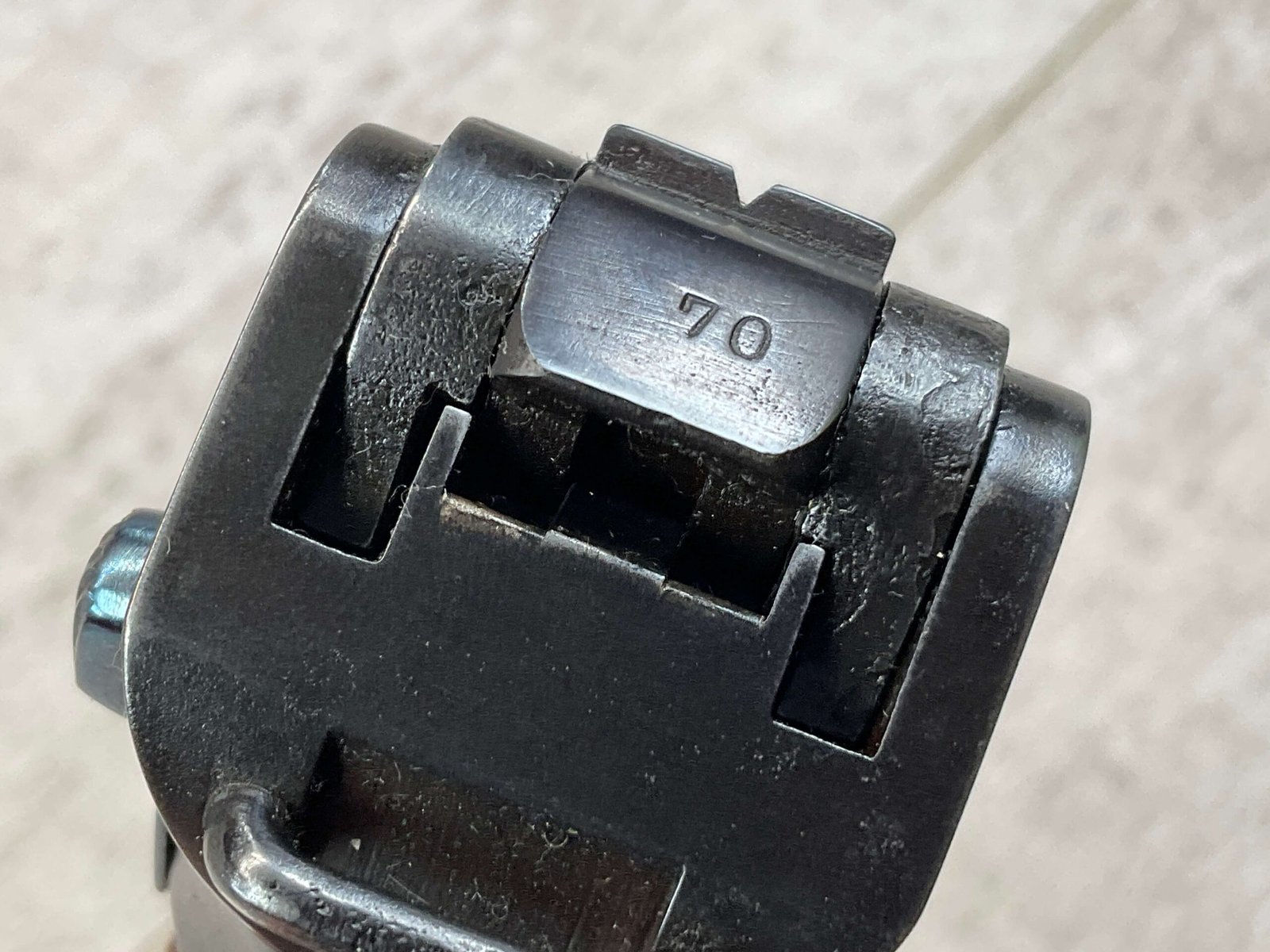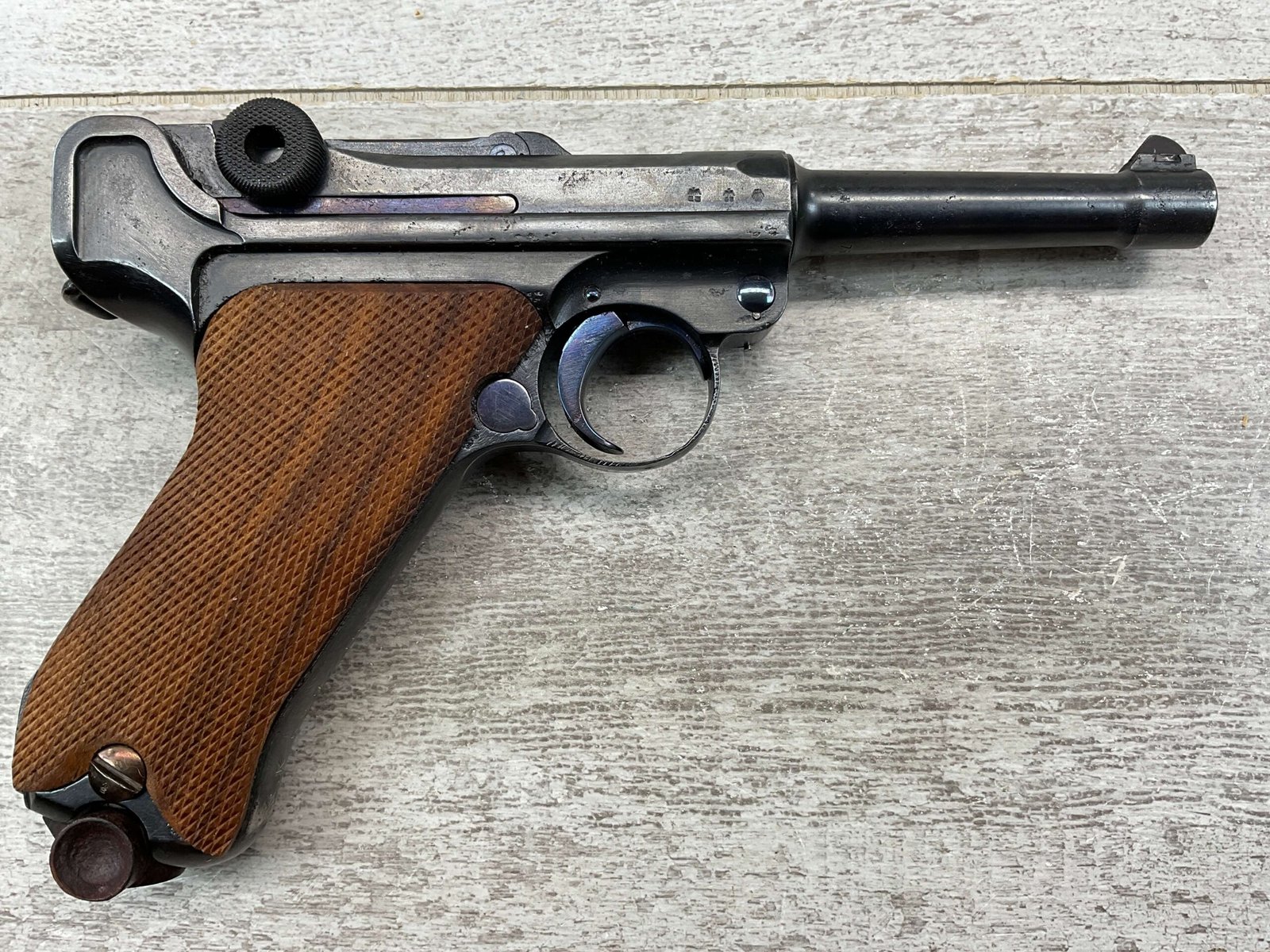 DWM LUGER P08 1936 CHAMBER DATE 9MM SEMI AUTO PISTOL #6183, 9MM, VG BRIGHT BORE & RIFLING, “7605” MARKED BBL, NON MATCHING, 1936 CHAMBER DATE, DWM TOGGLE, EXC CHECKERED WALNUT GRIPS W/ ROUND COUNT WINDOW, EXC BLUE W/ SIGNS OF PITTING UNDER, NICKEL MAGAZINE W/ AFTERMARKET WOOD BASE, NO IMPORT MARKS, EXC ACTION, GREAT SHOOTER!!