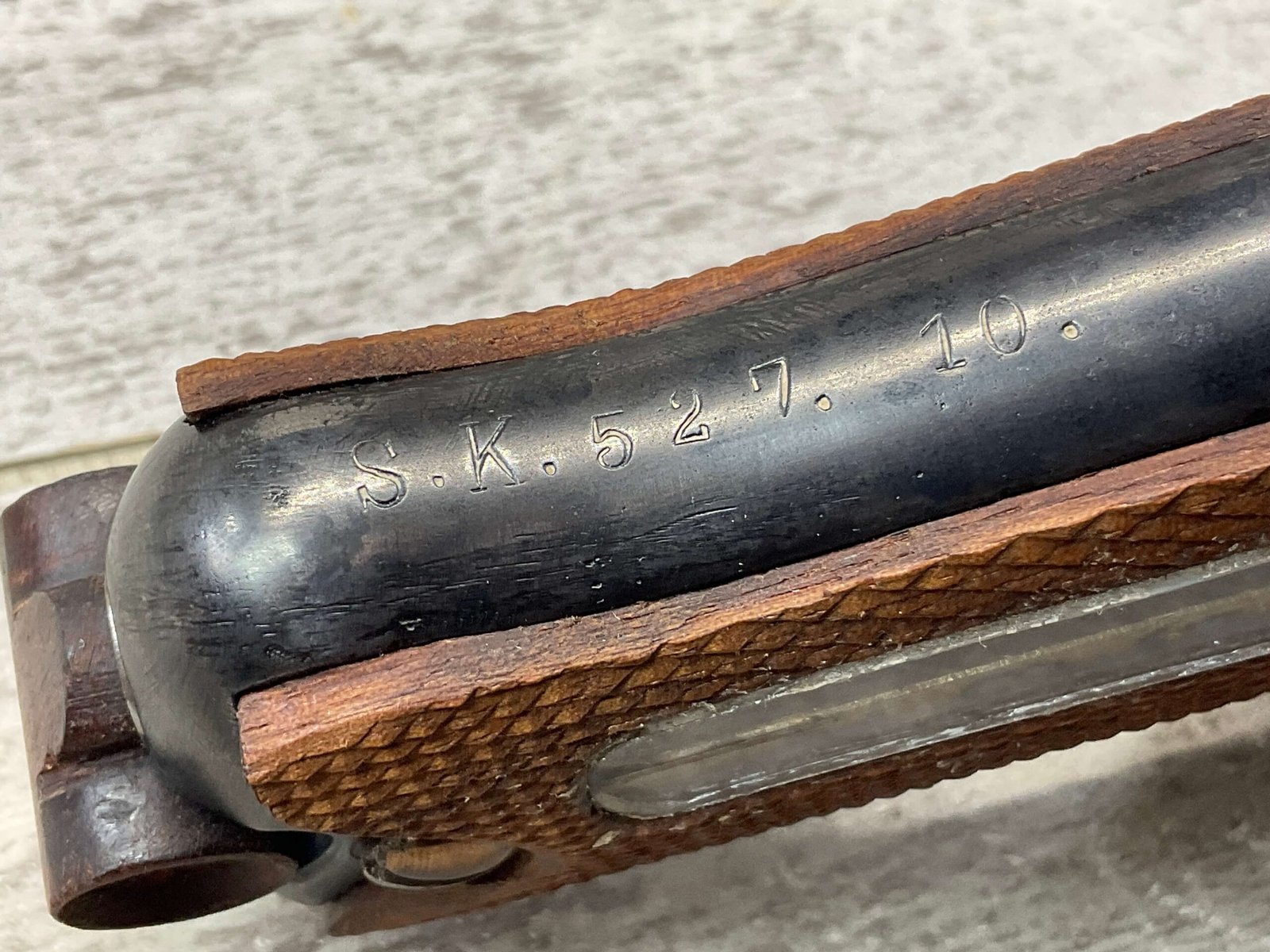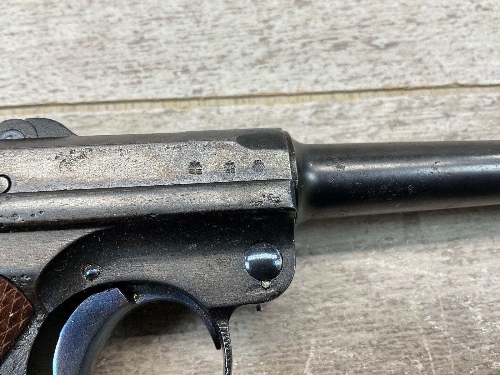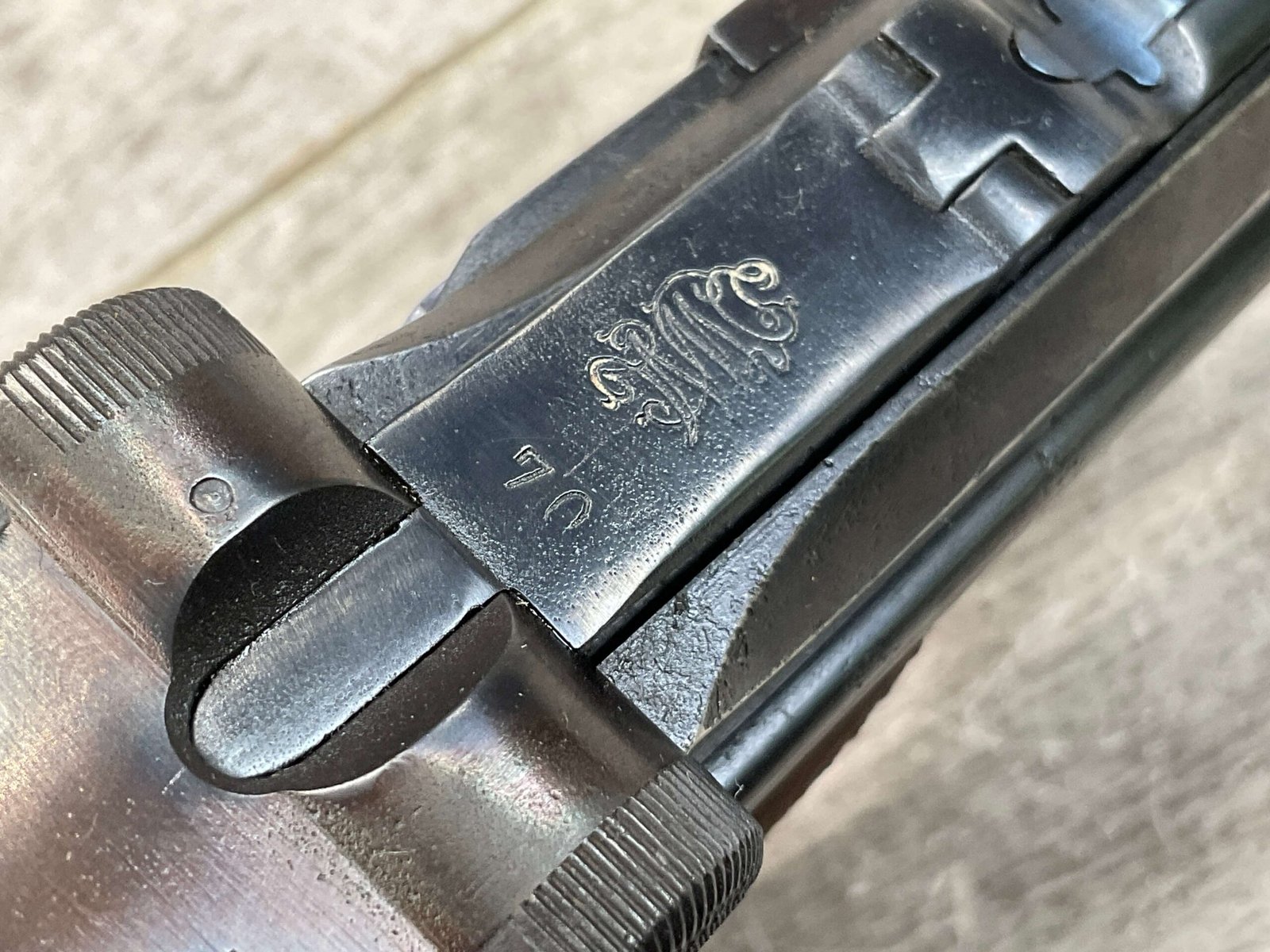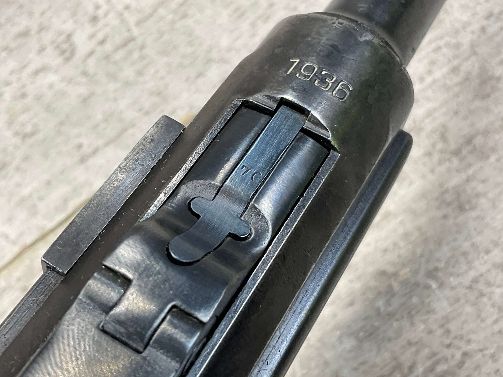 DWM LUGER P08 1936 CHAMBER DATE 9MM SEMI AUTO PISTOL #6183, 9MM, VG BRIGHT BORE & RIFLING, “7605” MARKED BBL, NON MATCHING, 1936 CHAMBER DATE, DWM TOGGLE, EXC CHECKERED WALNUT GRIPS W/ ROUND COUNT WINDOW, EXC BLUE W/ SIGNS OF PITTING UNDER, NICKEL MAGAZINE W/ AFTERMARKET WOOD BASE, NO IMPORT MARKS, EXC ACTION, GREAT SHOOTER!!