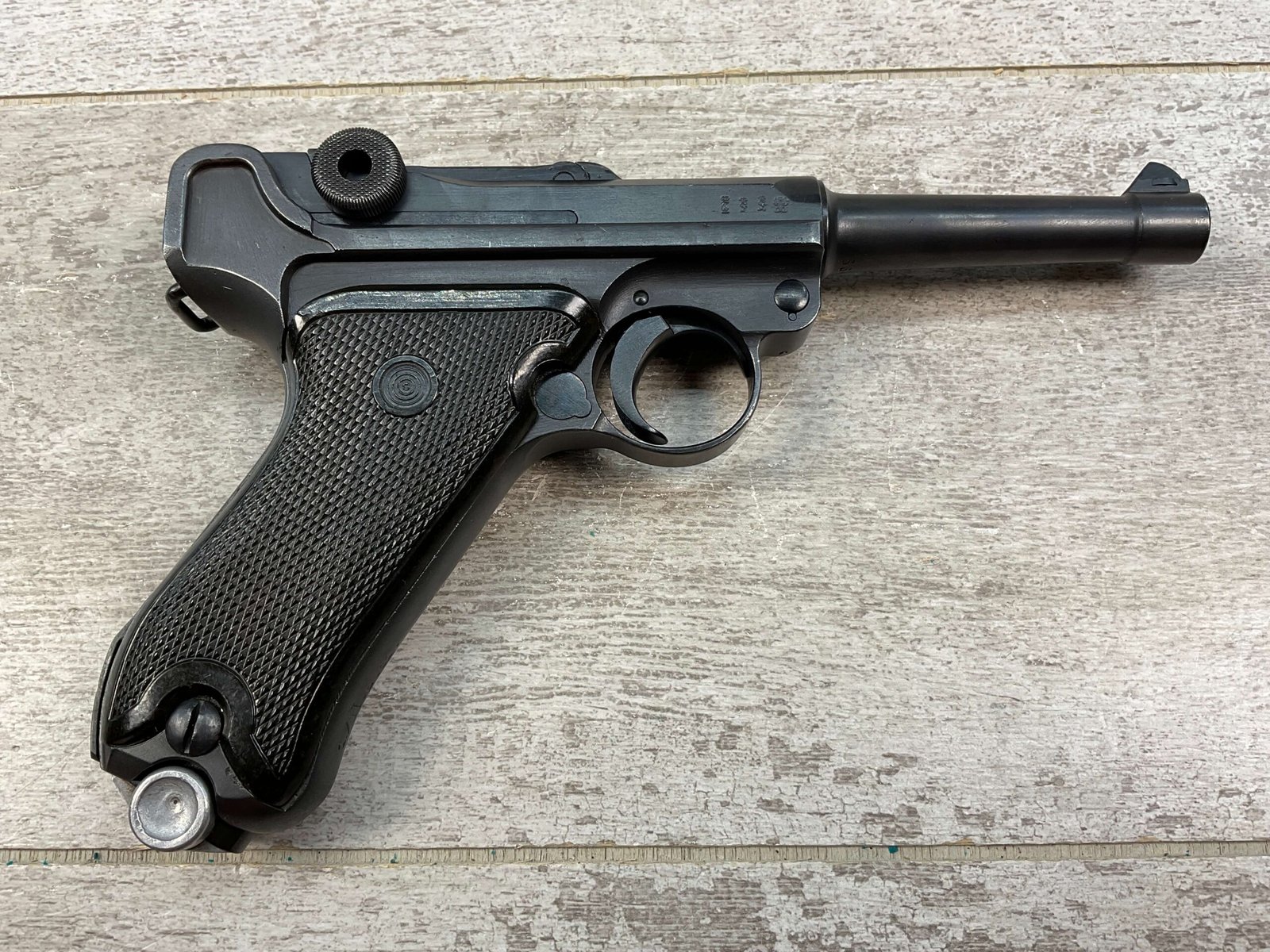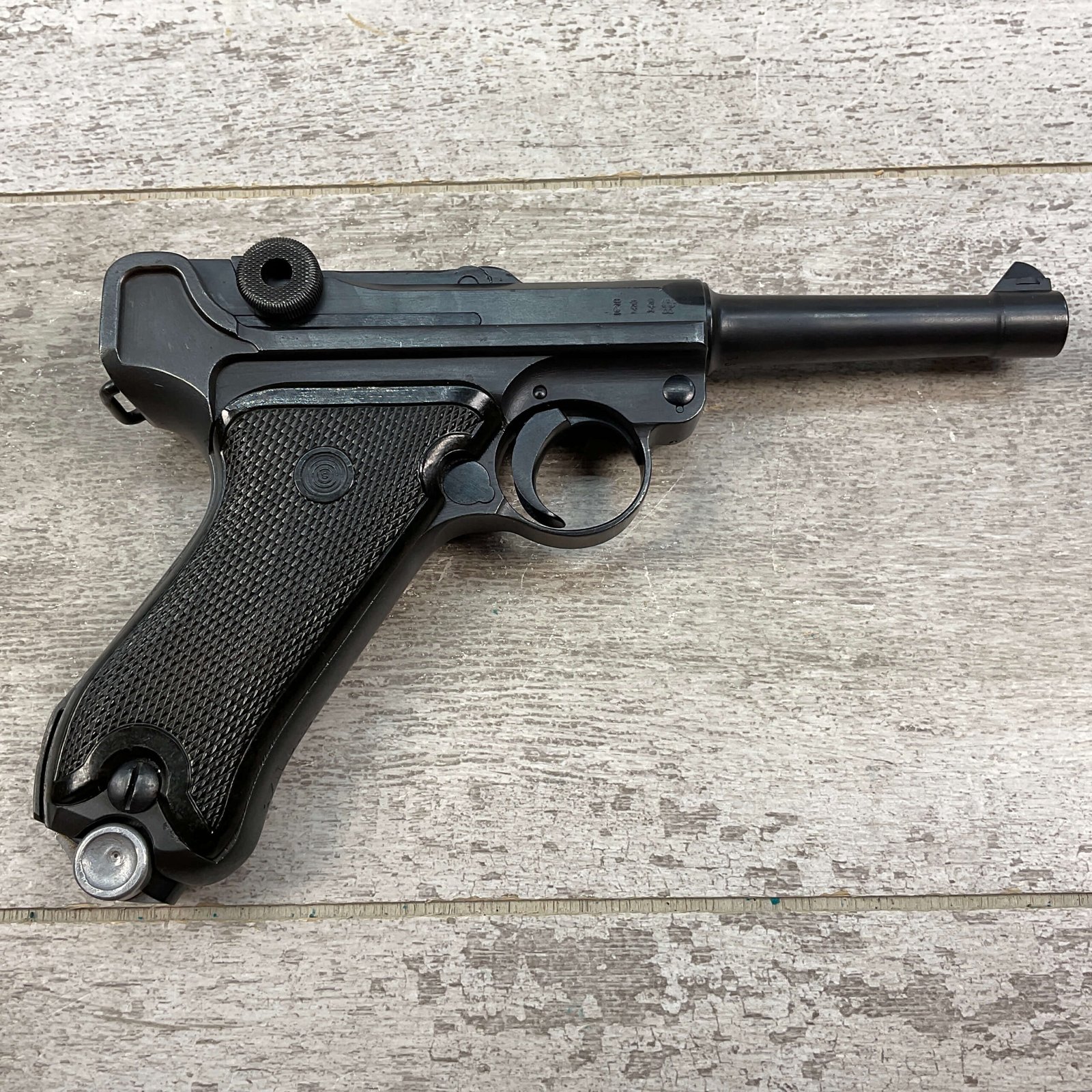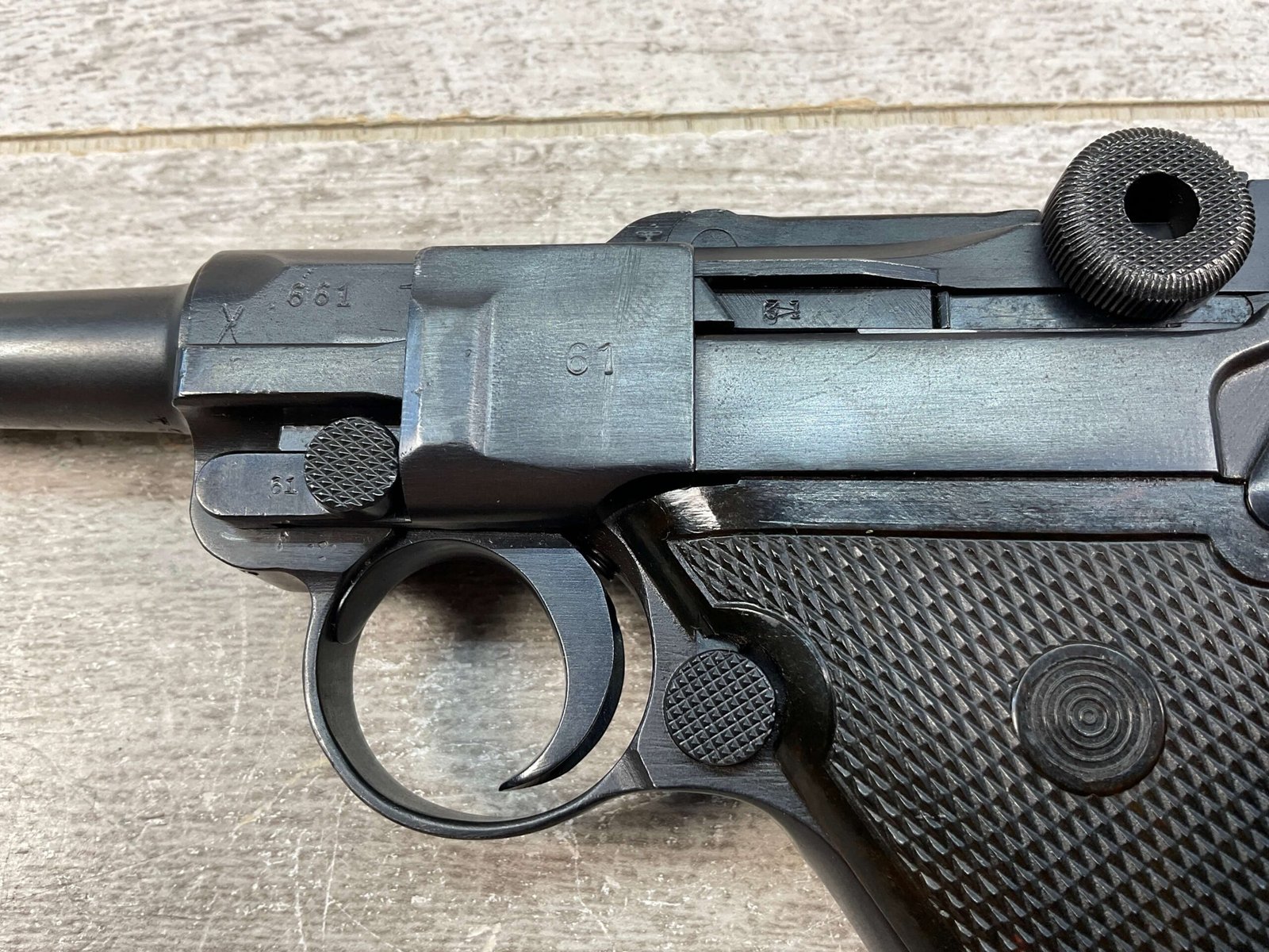 DWM LUGER P08 POLICE REWORK 9MM SEMI AUTO PISTOL #661k, EXC REBLUE FINISH, EXC BLACK GRIPS, VG-EXC BORE & RIFLING, REWORKED, 1917/1920 CHAMBER DATES, “1/N.6.11.” UNIT MARK ON FRONT GRIP STRAP, MOSTLY MATCHING, ONE BLUED MAG W/ALUMINUM BASE INCLUDED, CONDITION AS SEEN IN PHOTOS!!
